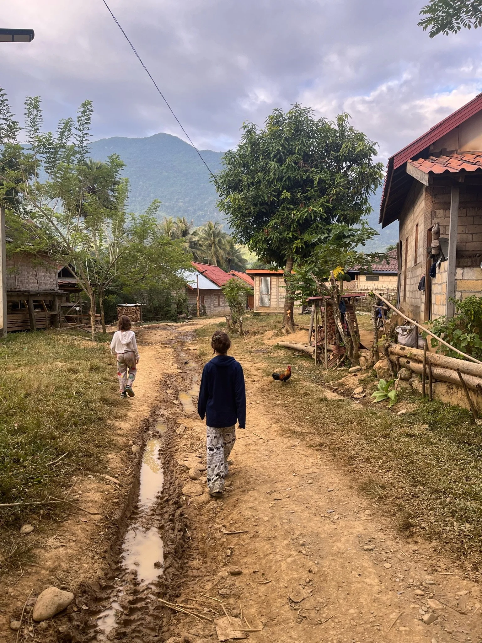 Tegen de middag zijn we in Ban Pha Yong, een dorpje van 368 mensen, waar Hmong (een Tai-subgroep uit het noorden) en Khmu (Khmer-volk uit het zuiden) naast elkaar leven. Hier opgroeien is zo anders dan bij ons. Er zijn veel kinderen. Jonge zwangerschappen komen hier vaak voor. De eigenaar van Coco House vertelde dat meisjes in deze afgelegen dorpen snel trouwen en tegen hun 18de verjaardag al 2 kinderen hebben. Het is een arm dorp, maar tegelijkertijd zijn de mensen hier ook vrolijk, gastvrij en vriendelijk. Hoewel we toch ook een gemeenschapshuis passeren waar enkele mannen rond het middaguur al behoorlijk scheef aan de Laolao (zelfgestookte whisky) zitten…