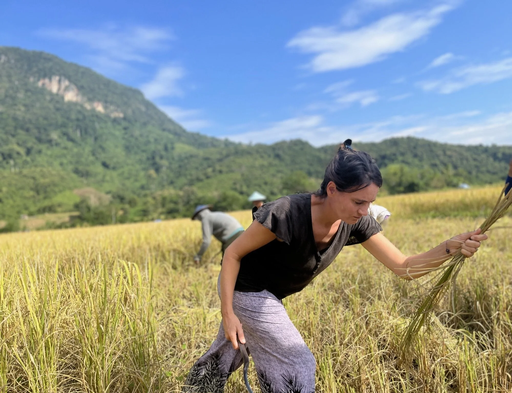 De volgende ochtend zien we iedereen uit het dorp passeren om de rijst te gaan oogsten. Het is een vrolijke periode van harvest, sommige veldjes zijn al gemaaid, andere nog niet. Bij het veld van Vuong’s familie mogen we ook eens proberen. Sam en Robin krijgen een vlijmscherpe gigantische sikkel in hun handen geduwd en mogen ook meedoen. Het doet me een beetje denken aan een vakantiejob ooit in de rozen van Wetteren, maar dan zonder de rozen.