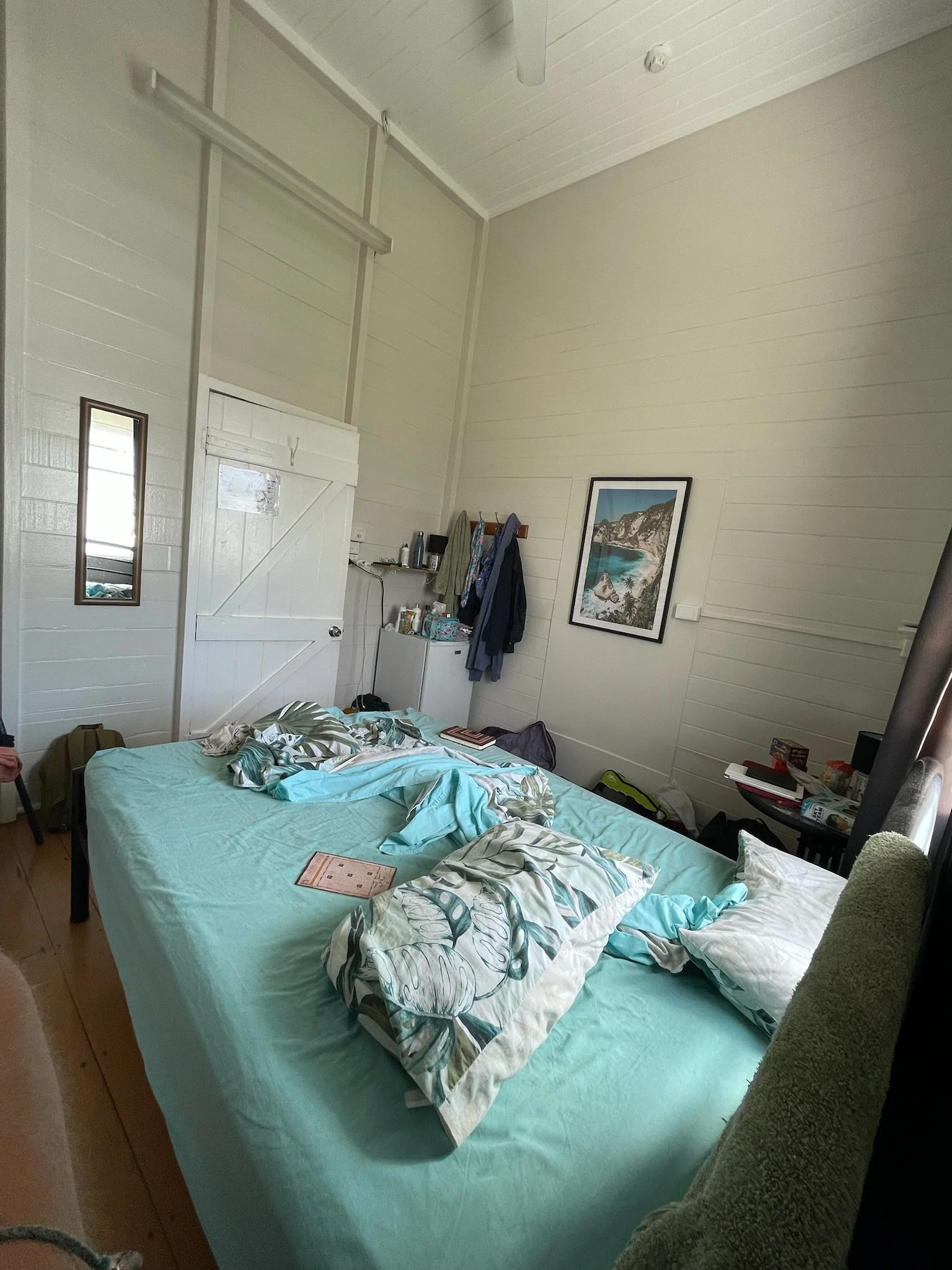 Zonder ons huis op wielen zijn we alweer beland in de wereld van booking.com. Het eerste plekje in Cairns, Traveller’s Paradise, maakt gelukkig zijn naam waar. We hebben elk een kamer met hoge plafonds, beddengoed met palmboompjes op, en overal een blinkende houten donkerbruine vloer. De fan werkt goed en er waait zowaar een coastal breeze door ons verblijf. Cairns is een aangename stad aan de zee, opnieuw met een lagoon net voor de zee. De eerste avond gaan we gelijk een fancy apérol drinken in één of andere hippe bar aan de haven. Er is een esplanade langs de zee waar we geregeld eens wandelen, en nog steeds leuke vogels zien. We blijven een tijdje kijken naar een groepje pelikanen die zich als een accordeon ineenplooien als ze gaan slapen.
