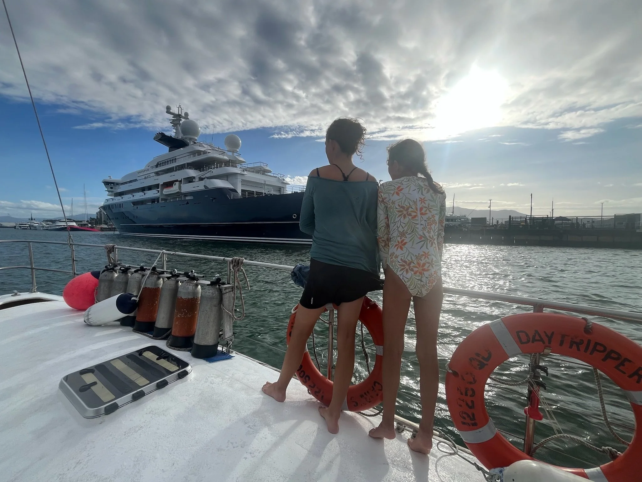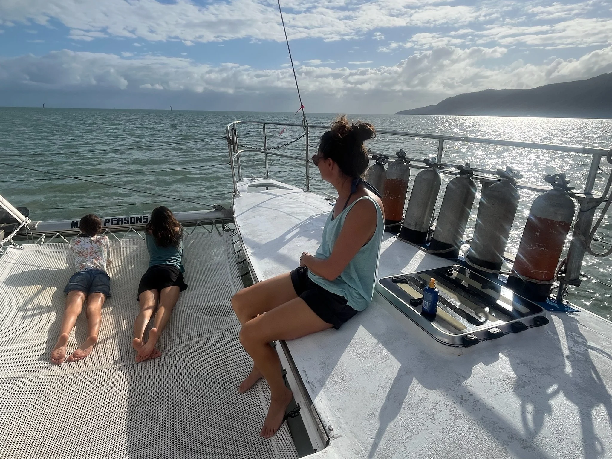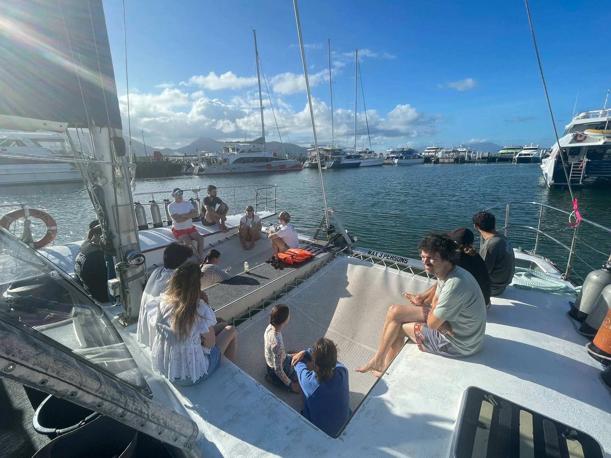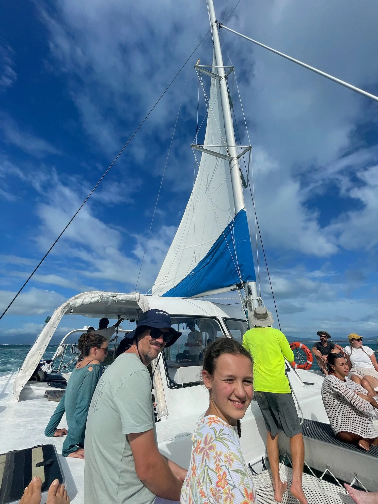 Ergens in de namiddag zetten we dan opnieuw koers naar de haven. Tijdens deze 2 uur durende zeiltocht krijgen we nog wat vers fruit, koekjes, champagne, mooie vergezichten én enkele dolfijnen die voor de boot opspringen. Na een goed uur zien we zowat elke ander schip dat van het reef komt terugvaren. Ze steken ons één voor één voorbij. Ik denk dat ze er ongeveer een half uurtje over doen. Maar we troosten ons met de gedachte dat de aanwezigen ondertussen een didgeridoo initiatie sessie moeten ondergaan. Tegen 17 uur zetten we voldaan, vol zout, en tevreden voet aan wal.