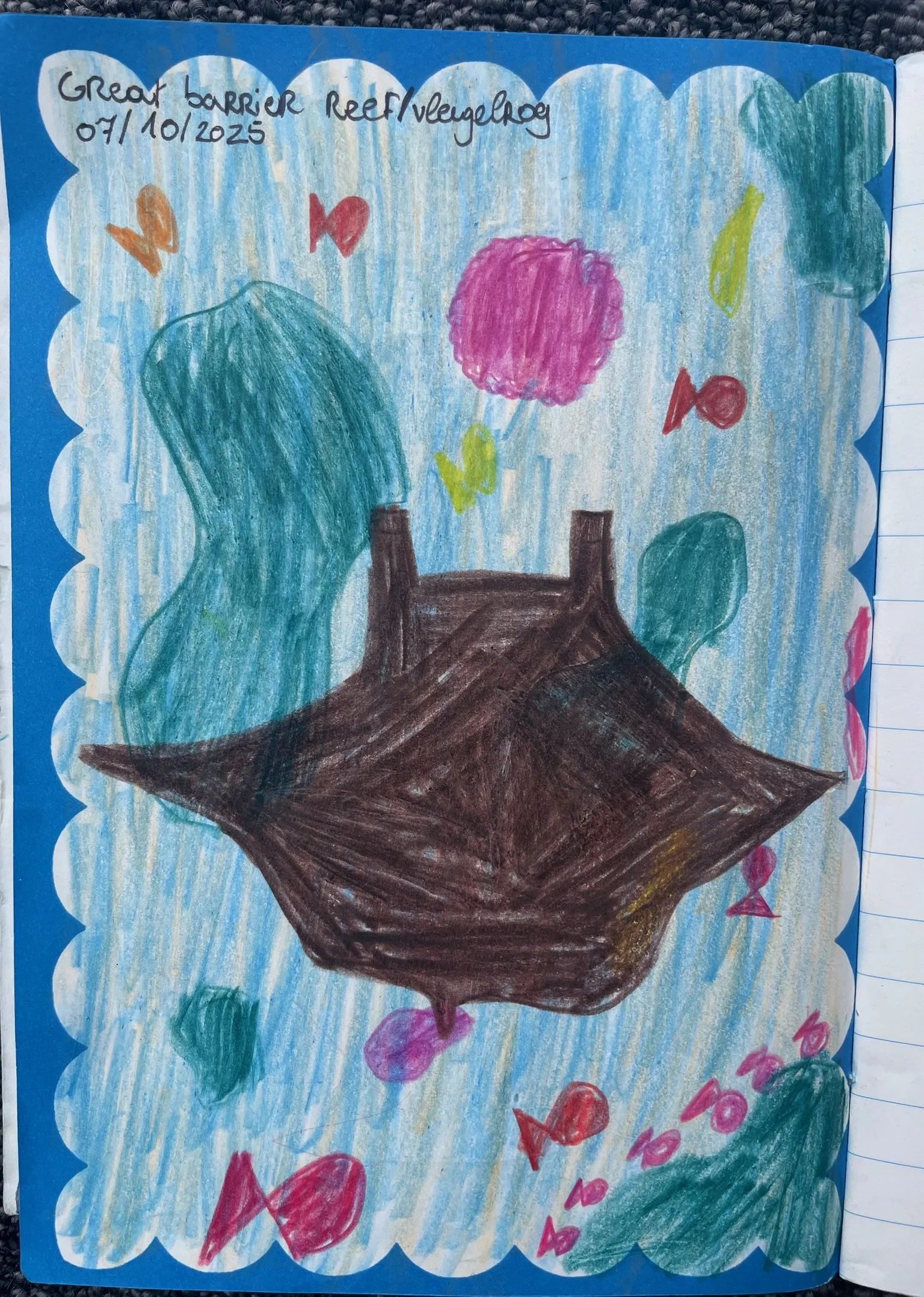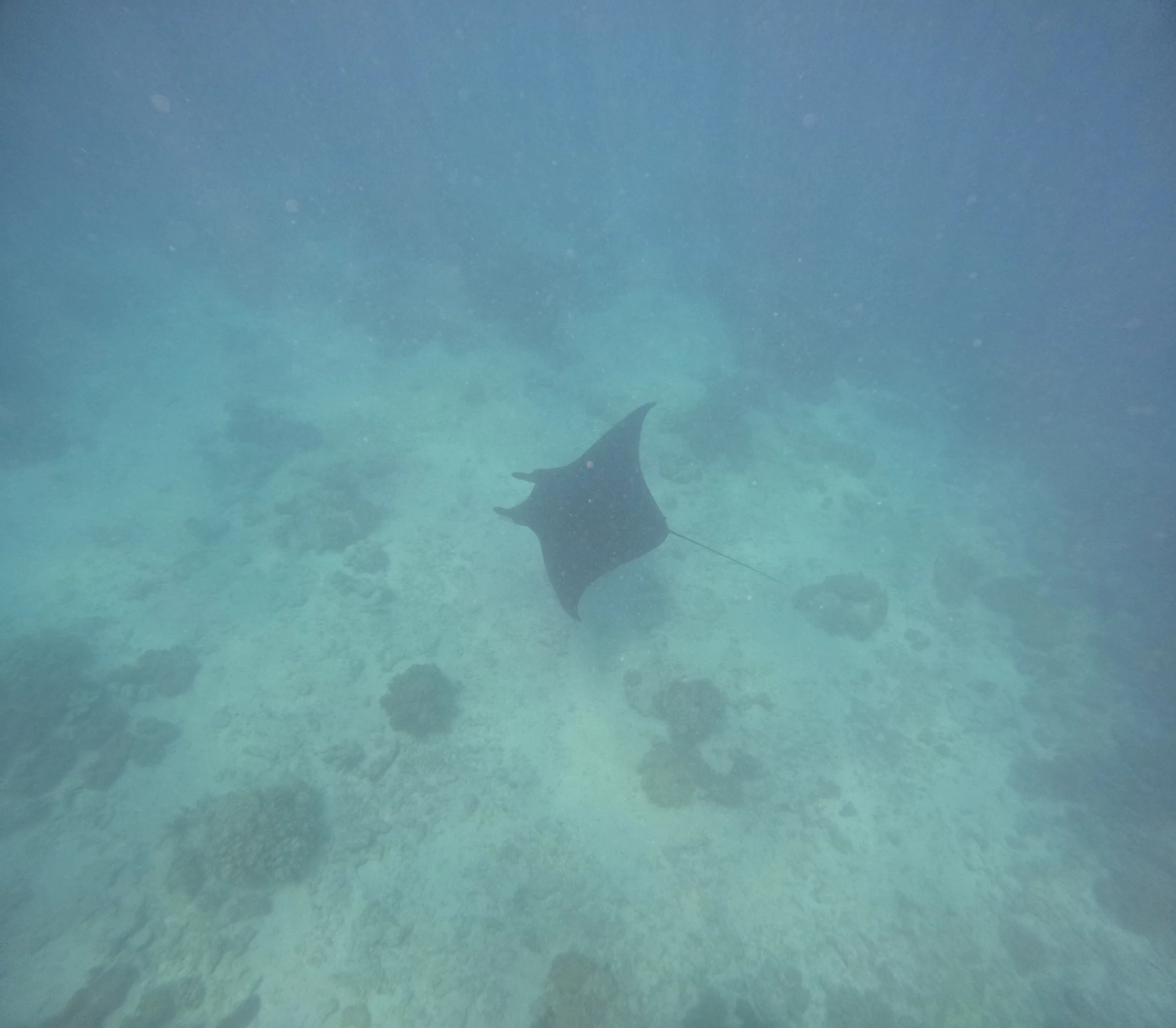 Na een tijdje komt iedereen terug in de boot en krijgen we een lunchke terwijl we verder varen naar de tweede spot. Ik heb een nieuwe snorkelbril én het is ondertussen warmer geworden dus enthousiast springen we een tweede keer in het water. De technische condities zijn uitstekend maar de snorkelplek is niet bepaald de mooiste. Het water is wat troebel en niet alle plekjes zijn even mooi. Er is ook steeds iemand mee, Julian of Sandy, die een reddingsboei achter zich meedragen en zo wat de weg wijzen en af en toe eens ‘turtle’ ofzo roepen. Een gegidste snorkelbeurt als het ware. Tijdens deze tweede sessie roept Julian opeens ‘Shark!’ en dat zorgt toch voor een kleine receptieve storing in de hersenen. Instinctmatig is dit natuurlijk hèt teken om zo snel mogelijk te maken dat je wegkomt, maar eigenlijk is het de bedoeling dat je gaat kijken. Dus terwijl hij nog eens ‘Shark!’ roept spartelen wij met onze zwemvliezen tegen de golven om zo snel mogelijk bij hem te zijn, waarna de haai natuurlijk al lang weg is. We zien wel een manta ray, echt heel groot, ‘t is wonderbaarlijk, en we zwemmen er een tijdje boven. Prachtig. Hij wordt nog mooier vereeuwigd in Robin haar boekje.