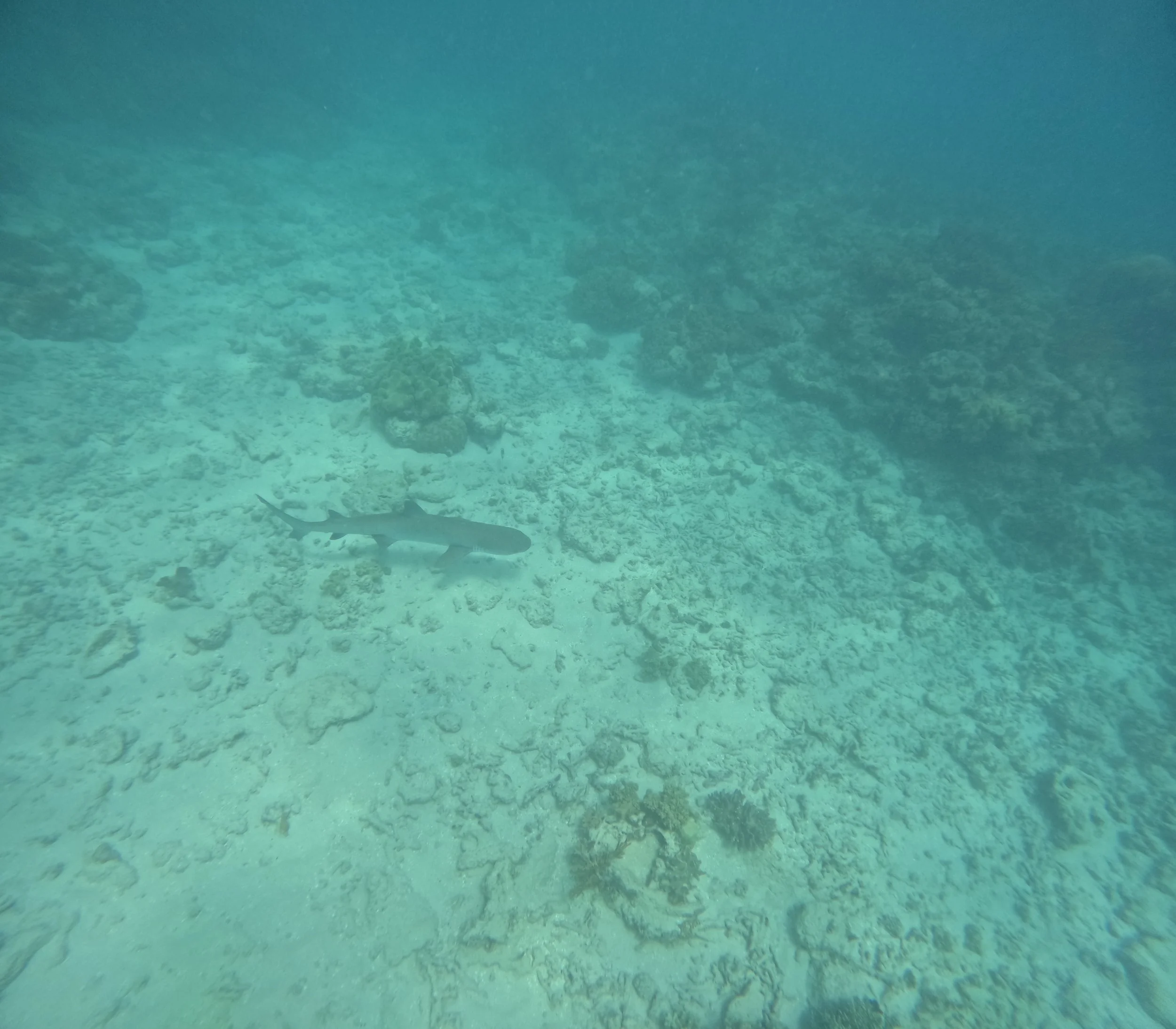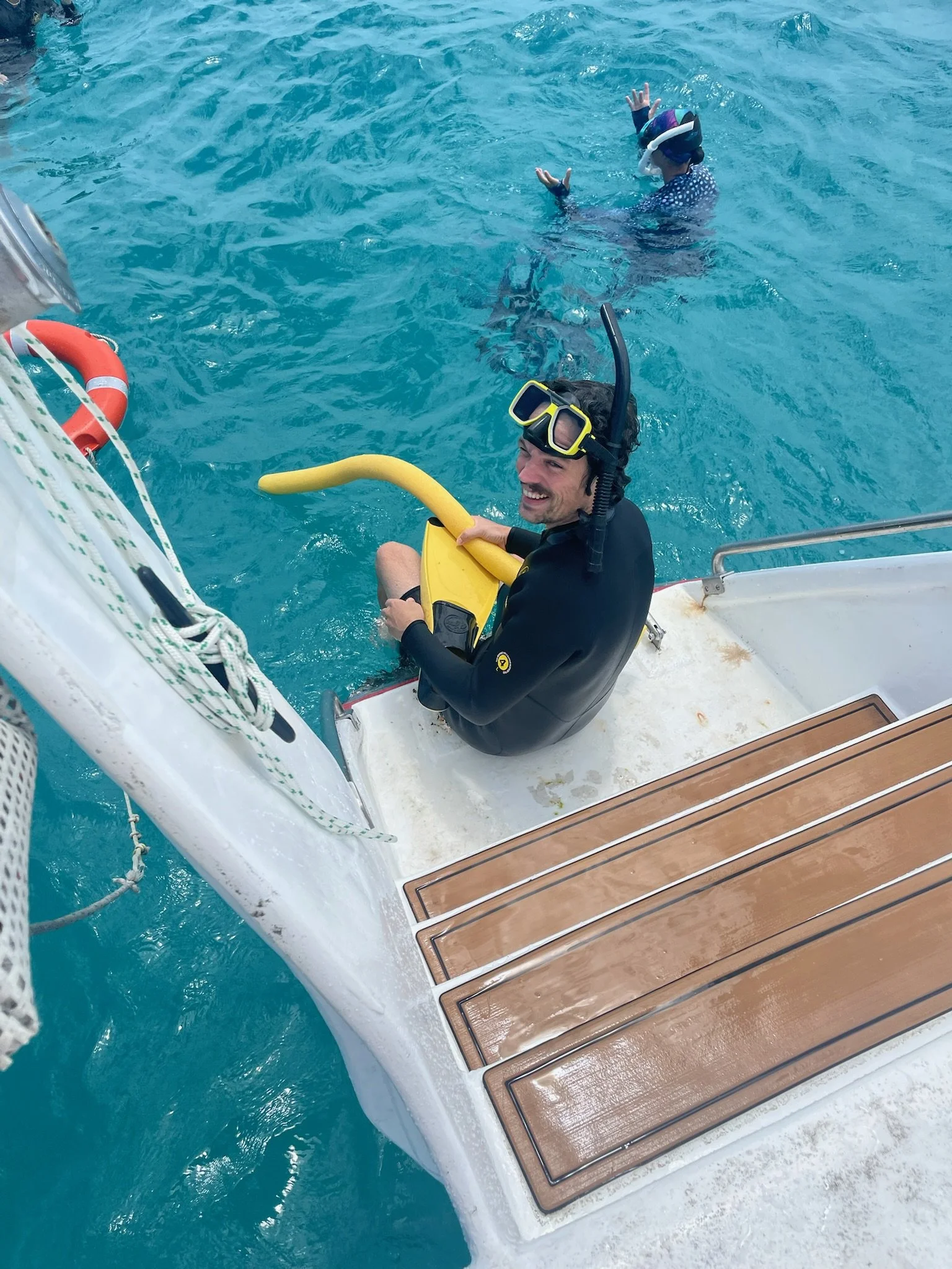 De snorkelplek is wel echt mooi. We proberen te vergelijken met andere ervaringen, maar er is eigenlijk geen vergelijken aan. Je hebt hier stukken koraal die prachtig gekleurd zijn en sierlijk zwiepen in de golven, maar ook stukken die grijswit zijn. Net zoals op andere plekken. Er is zeker ook veel leven, en wat wel opvalt is dat de vissen hier echt veel groter zijn. We zien toch wel een paar kanjers van een meter voorbijzwemmen. Na een tijdje heeft Robin er genoeg van; ze vindt het te koud èn ze moet pipi doen (we kregen duidelijke instructies dat in geen enkele omstandigheid in de wetsuit te doen ‘we will smell it if you do it’). Dus we zwemmen samen terug naar de boot, en zien onderweg nog een mooie pijlstaartrog. Ik heb ook wat snorkelbril issues, er komt steeds water in. Ik had misschien ook de vaseline moeten overwegen. Robin is wat in tweestrijd want ze heeft koud en wil stoppen, maar tegelijkertijd wil ze wel niets missen. FOMO op de Stille Oceaan. Ik zeg dat dat wel allemaal meevalt en ondertussen zien Senne en Sam een haai passeren