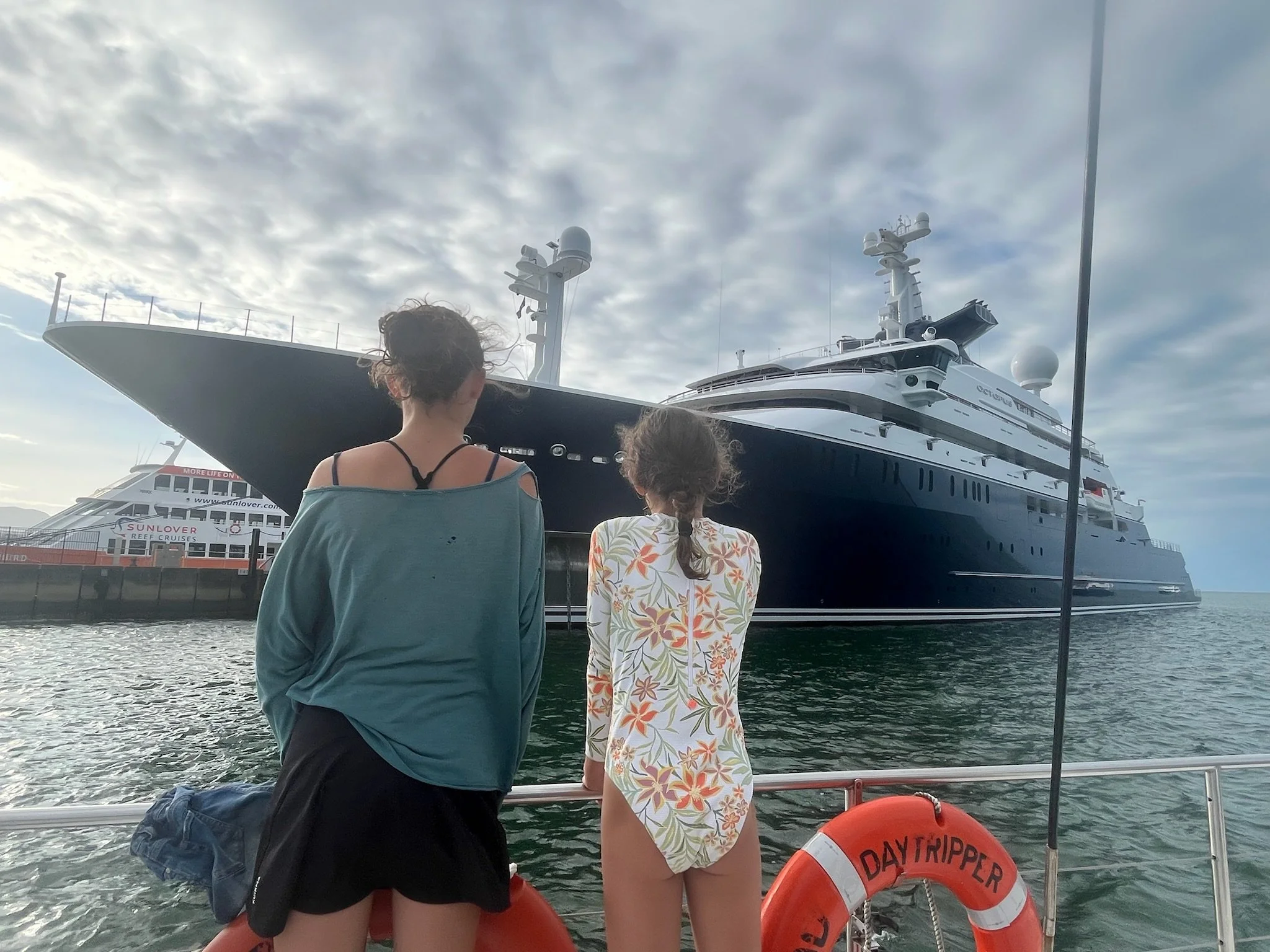 De bemanning bestaat uit MacKeiligh, de kapitein, die ons 30 kilometer zee-inwaarts manoeuvreert, waar het reef begint. Daarnaast is er ook Julian, een Ed Sheeran lookalike die ons een volledige uiteenzetting geeft over het zeeleven dat we zullen zien èn hoe dat nu eigenlijk moet, snorkelen. We hebben dus wel al wat gesnorkeld maar nog niet 1 keer is ons dat overkomen! Meestal zitten we bij één of ander local op een Vaiana bootje die ergens heen vaart, stopt en vervolgens naar het water wijst, waarna wij erin springen. Door deze uitvoerige instructies krijgen we ook een antwoord op de reden waarom Senne zijn snorkelbril overal ten velde steeds onder water loopt: the moustache! Niet alleen krijgen we de oorzaak van het probleem, maar eveneens de oplossing: vaseline. Het derde bemanningslid is Sandy, een sierlijke rock-en-roll zeemeermin die vol getatoeëerd staat met alle zeeleven dat we wellicht over enkele ogenblikken in het echt gaan zien. We krijgen ook een wetsuit, en dat kan voorlopig nog bij iedereen aan zonder vaseline. Here we go!