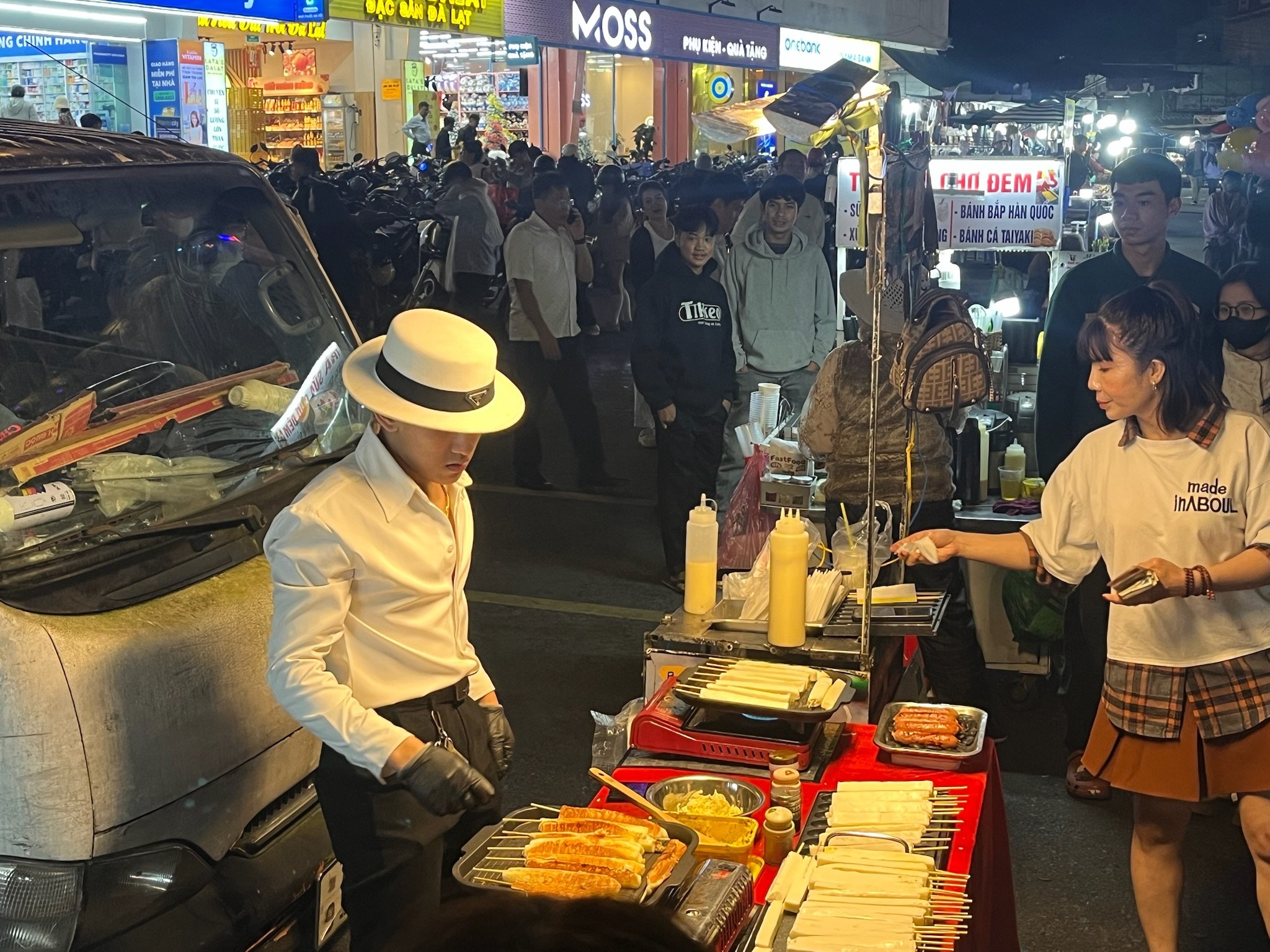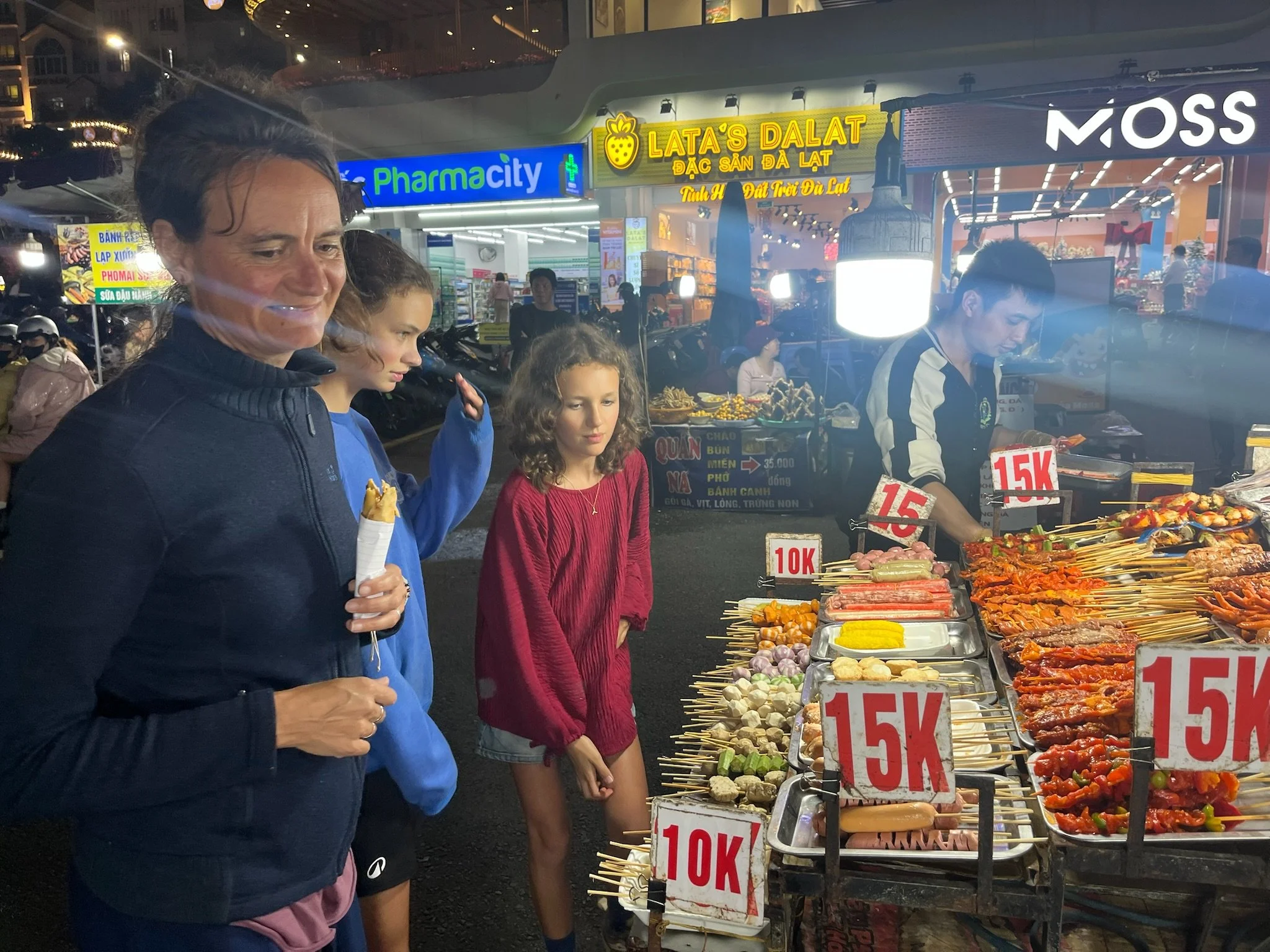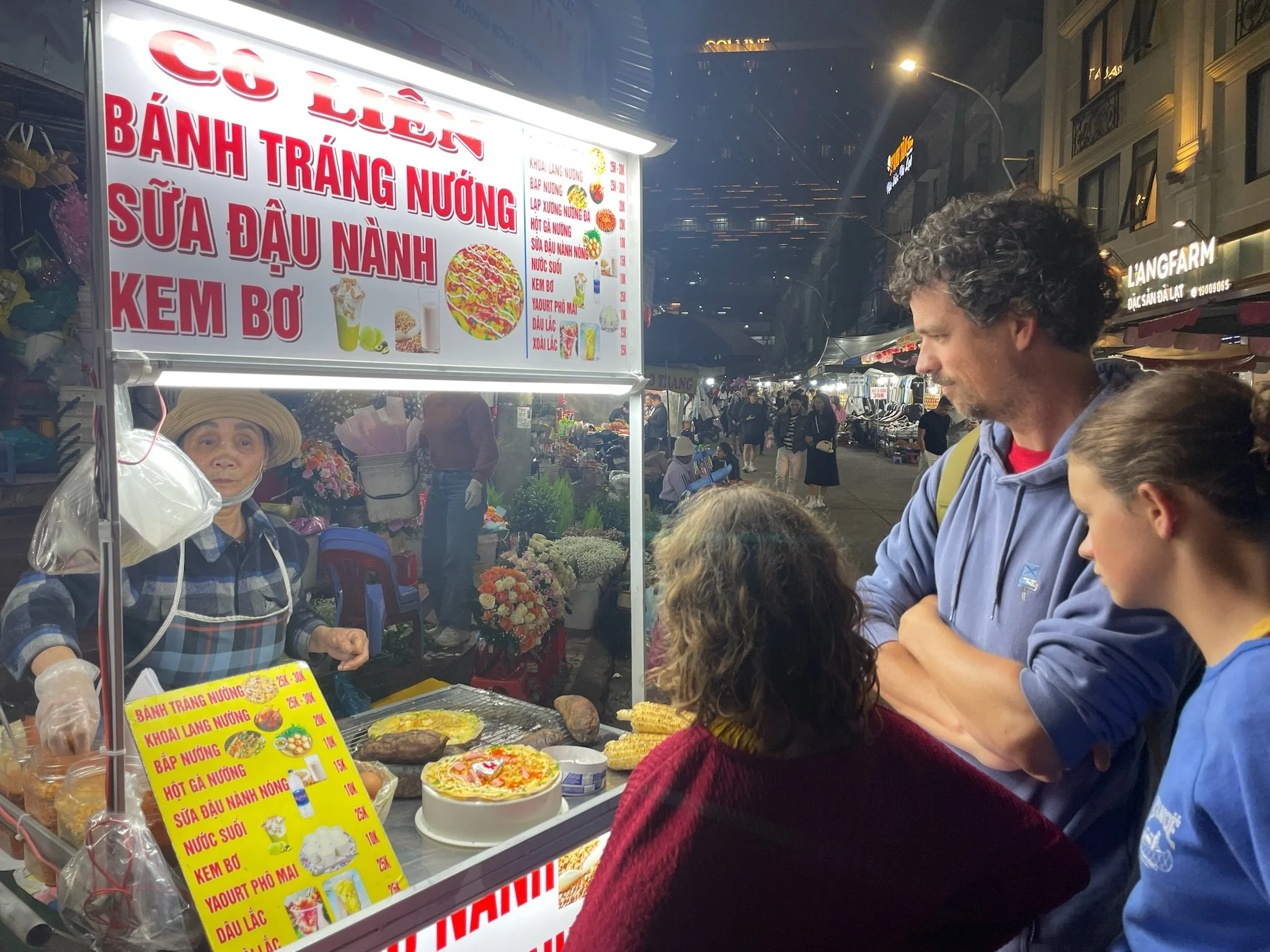 De eerste avond gaan we naar de nightmarket en proberen we enkele typische Da Lat gerechten uit: Banh Trang Nuong, iets dat het midden houdt tussen een pannenkoek en een pizza, met daarin de volledige voedingsdriehoek. Ook krabsticks met ketchup, en het signature fruit van Da Lat: aardbeien met suiker dooreen gerammeld in een plastieken potje. Ook de reïncarnatie van Michael Jackson staat op de markt wat satéetjes te flamberen met een gepast muziekje.