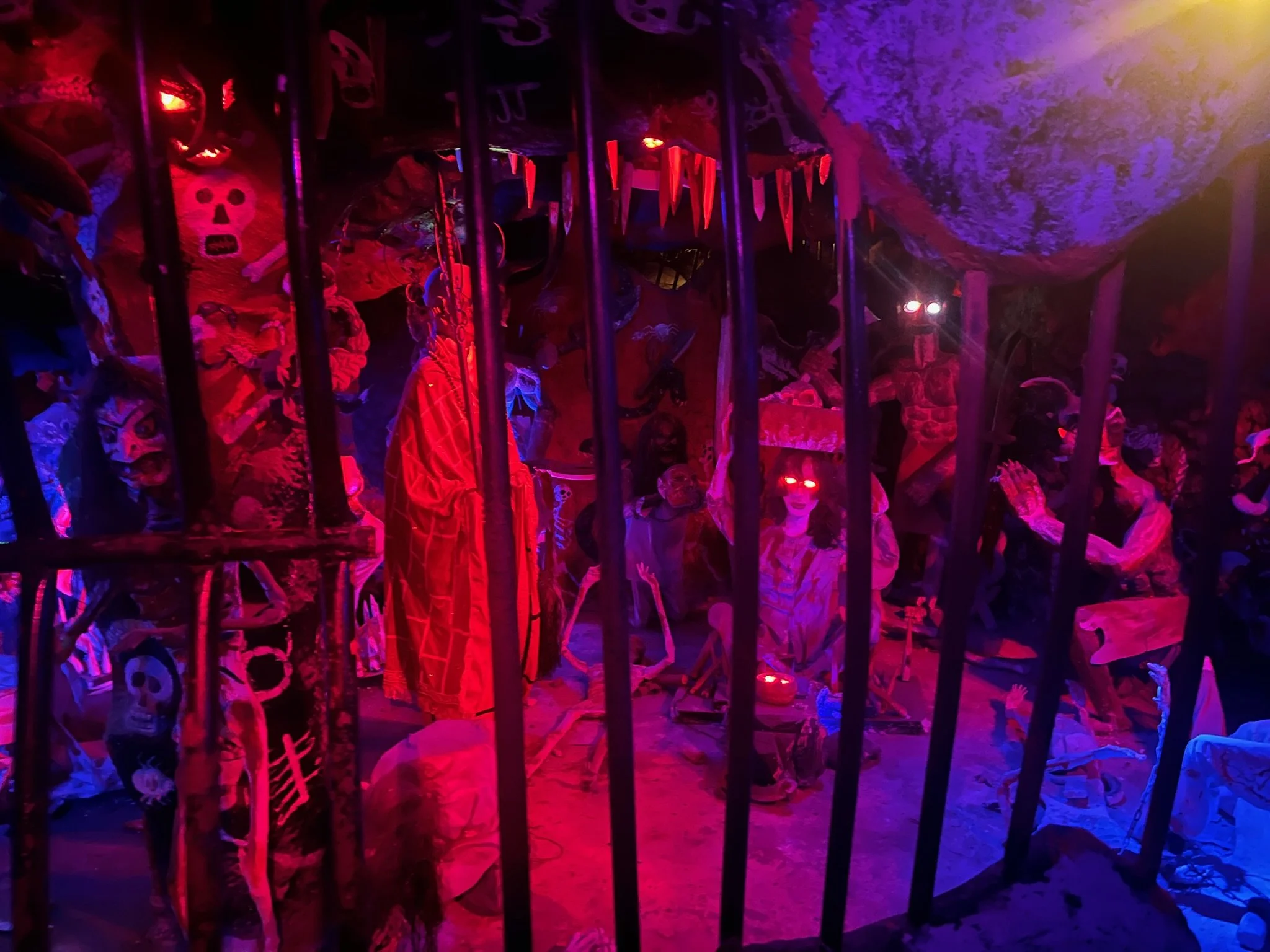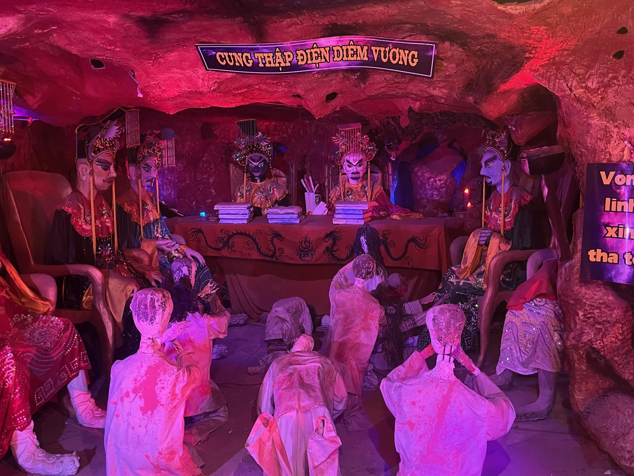 Het is een vreemde bedoening maar waar onze mond het meest van openvalt is de kelderverdieping. We volgen het pijltje en zouden in de 18 levels van de hel moeten terechtkomen. De ingang is een klein trapje naar beneden, bewaakt door twee nogal groot uitgevallen bokkenrijders. Er is weinig licht, duivels gelach en Vietnamees overstuurd gepraat door de boxen (dat is raar genoeg nog het engste van alle special effects). Deze levendige reconstructie van het afterlife heeft veel weg van een spookkot, en het duurt ook even alvorens we Robin kunnen overtuigen om mee af te dalen. Eens haar ogen wat gewend zijn aan het rode luwe licht, en met de handen op de oren beginnen we er aan. Deze immersieve installatie is hier vooral educatief bedoeld, maar goed, dat was Jeroen Bosh ook, en het hield hem ook niet tegen om zich volledig te laten gaan in gruwel. We zien de judgement door King Yama (Diem Vuong) en alle daarop volgende geflipte straffen, en vooral veel karma dat nogal slecht uitdraait.