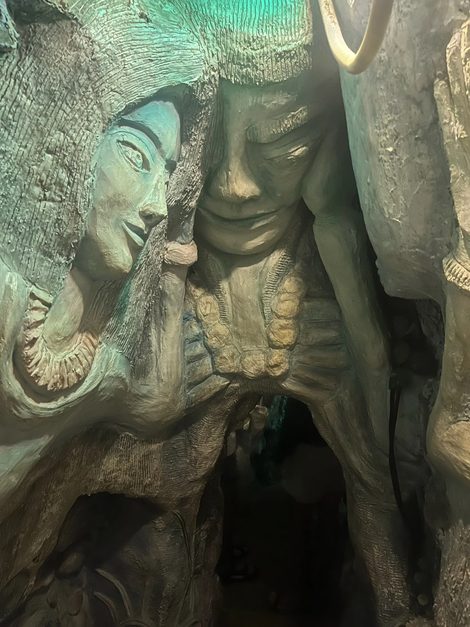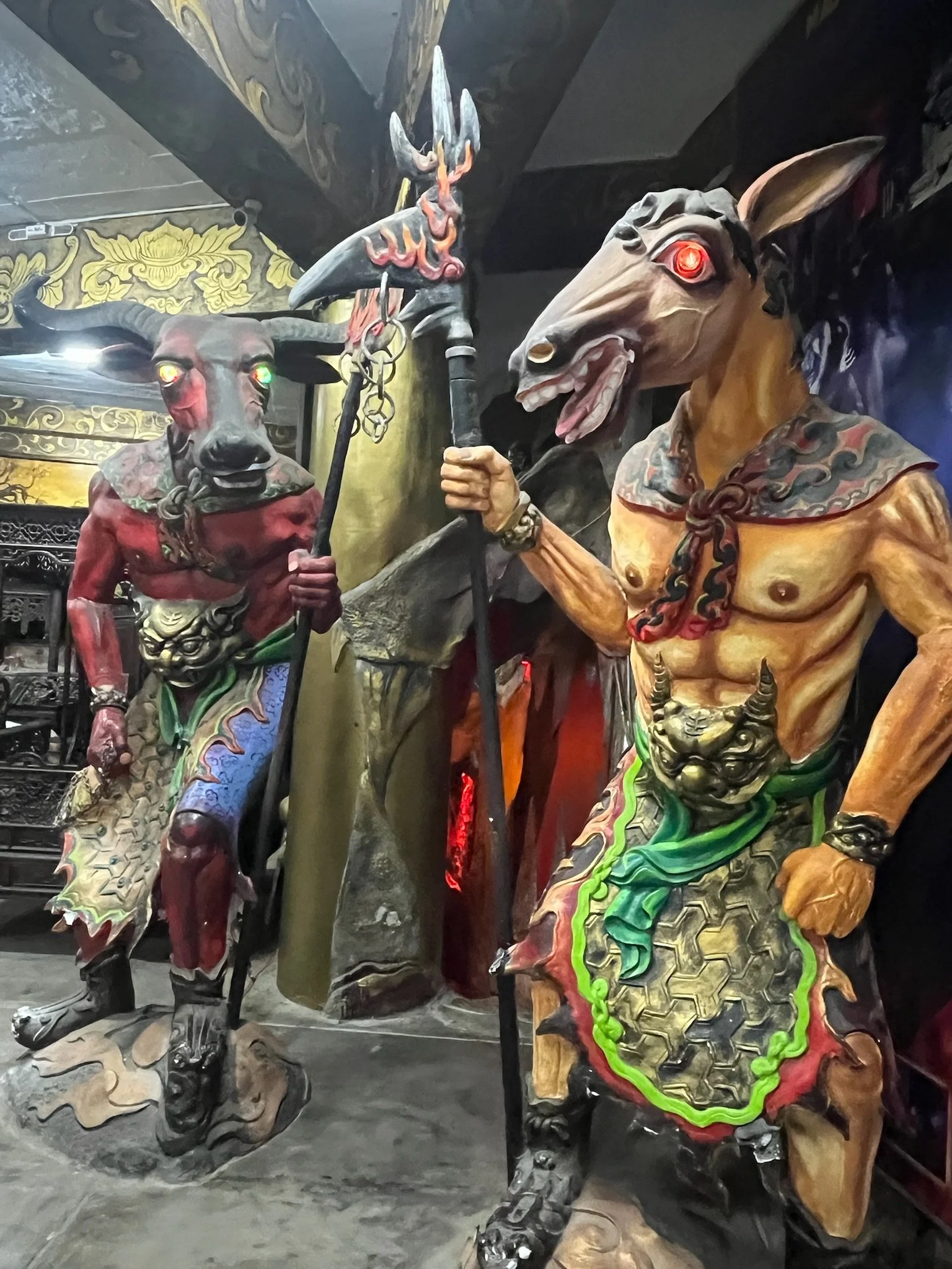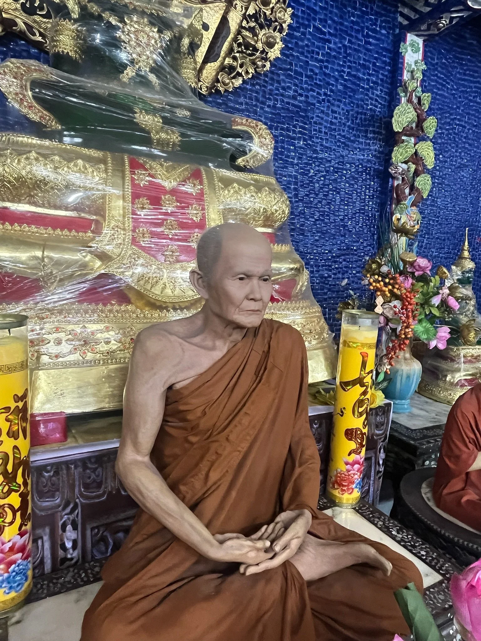 Daarnaast staat er nog een Boddisattva beeld van 17 meter hoog, gemaakt van meer dan een half miljoen bloemen. En eveneens enkele wassen levensechte beelden van overleden monniken. Het haar, de rimpeltjes, het ziet er allemaal griezelig echt uit. Als je te lang blijft kijken, lijkt het alsof je hem ziet bewegen.