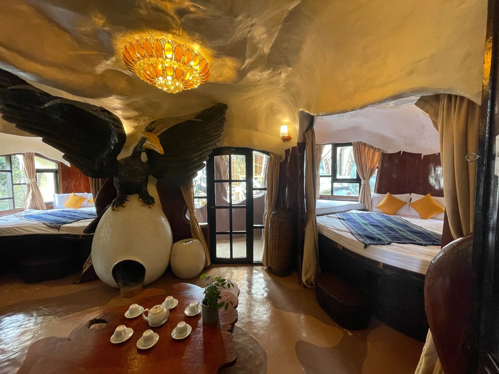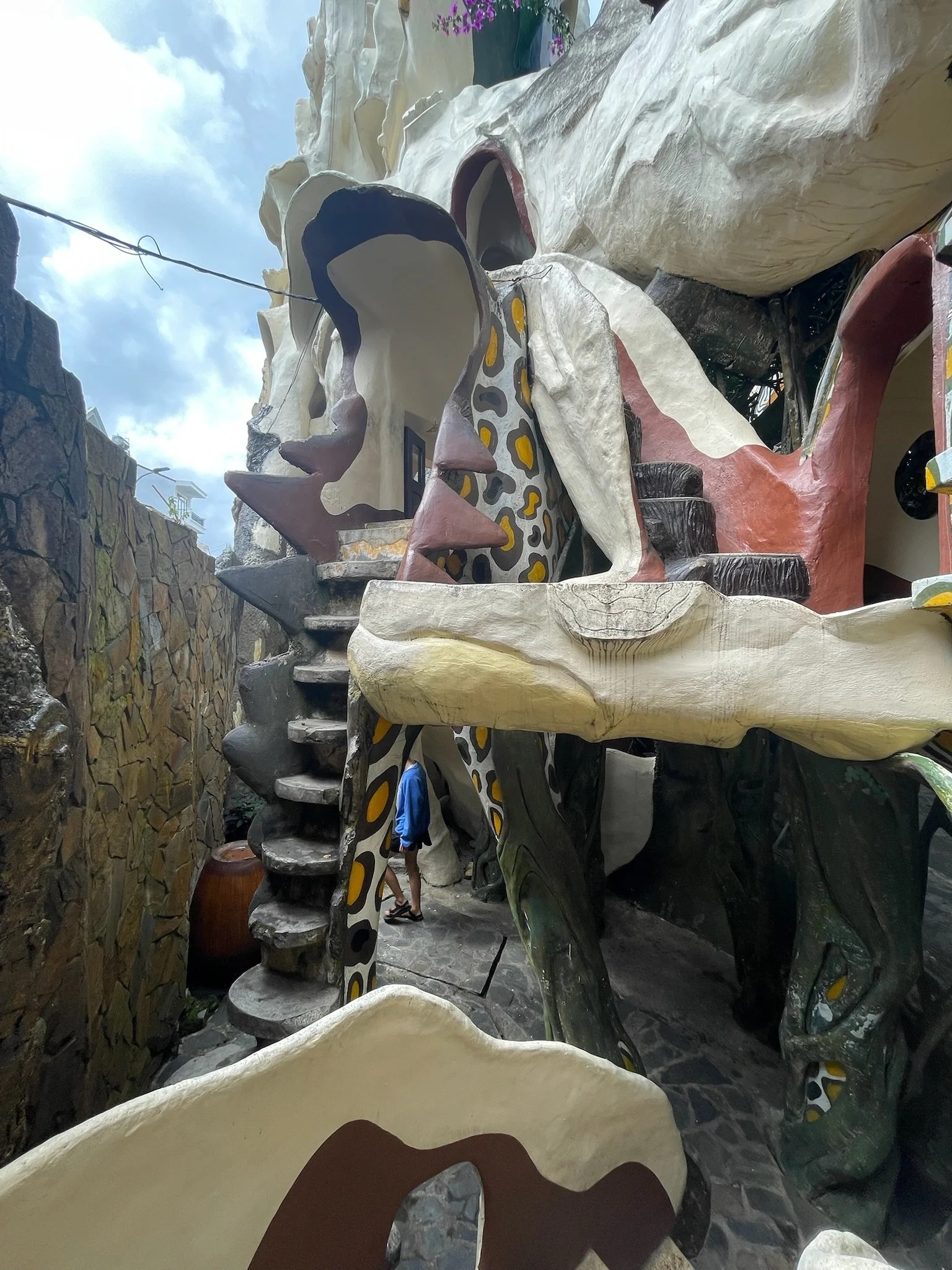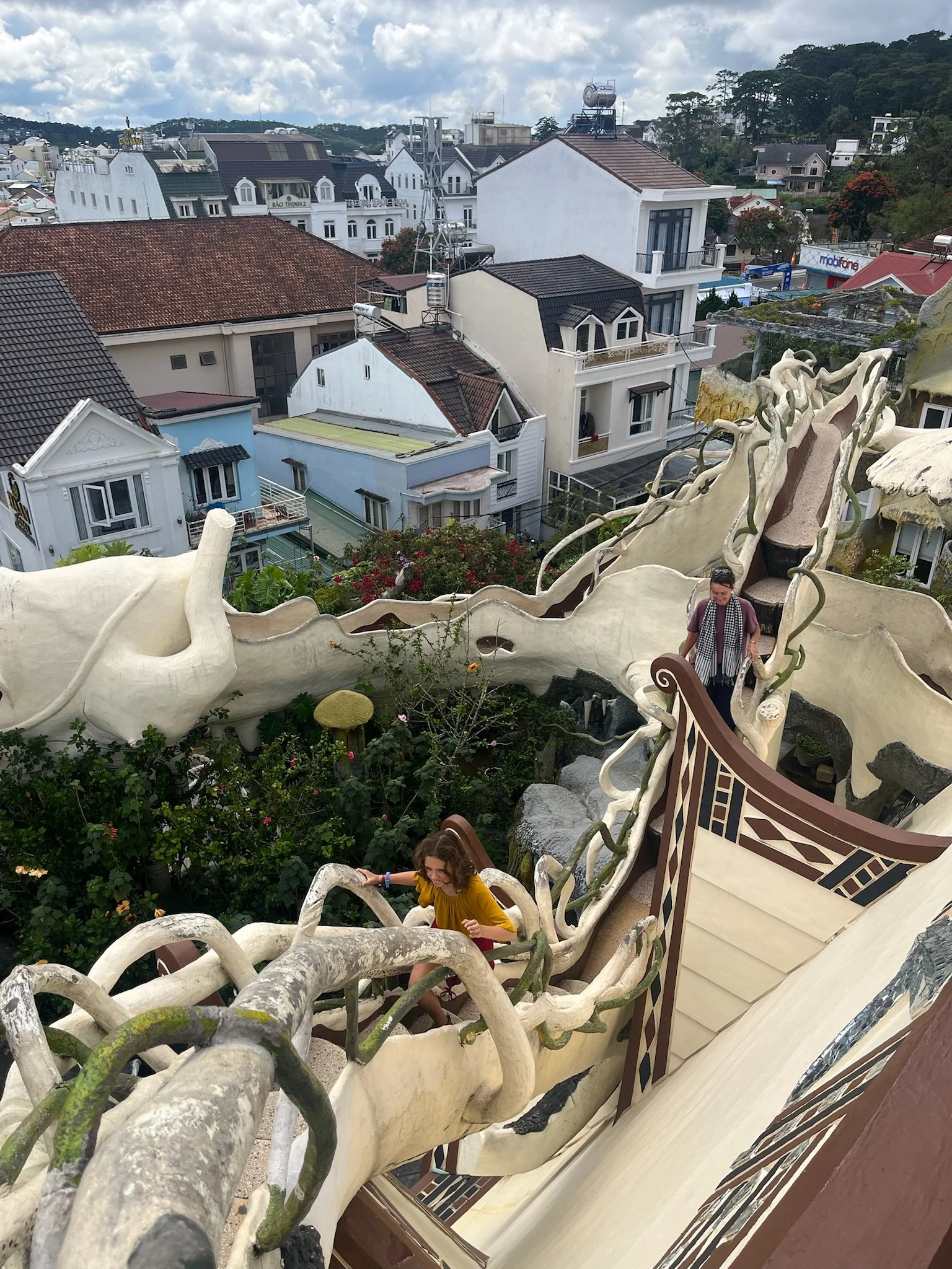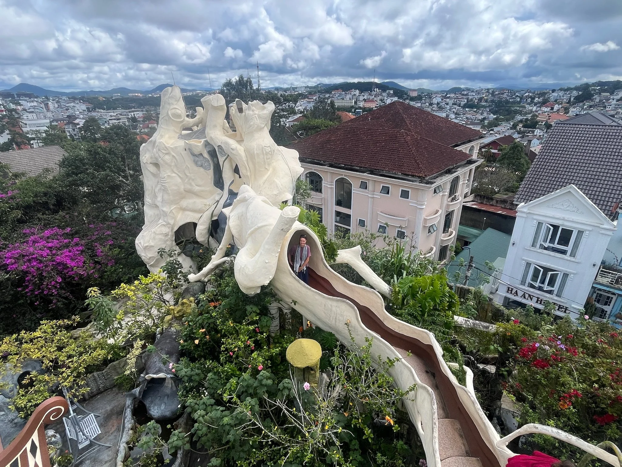 Er staan enkele architecturale kronkels in Da Lat en het eerste dat we bezoeken is het Crazy House. De architecte was de dochter van de secretaris-generaal van de Communistische Partij onder Ho Chi Minh. Ze had het blijkbaar even gehad met de doordeweekse saaie communistische architectuur en besloot wat Alice in Wonderland, Gaudi en Dali in de mix te gooien, en begon in de jaren ‘90 aan dit sprookjesachtige bouwwerk. Er zijn 30.000 trappen en brugjes die je leiden rondom een holle boom en doorheen gebeeldhouwde kamers die allemaal in een bepaald thema zijn ingericht: de mierenkamer, de tijgerkamer,… Het lijken wel Hobbit-holletjes. Het is echt plezant om op de trappen te verdwalen en als we het na een uurtje of twee voor bekeken houden in dit doolhof, doen we nog een wedstrijdje om ter teerst naar het begin. We zien elkaar soms eens boven of onder passeren, maar het is niet in te schatten wie er het eerst zal aankomen.