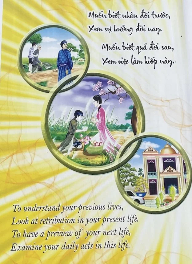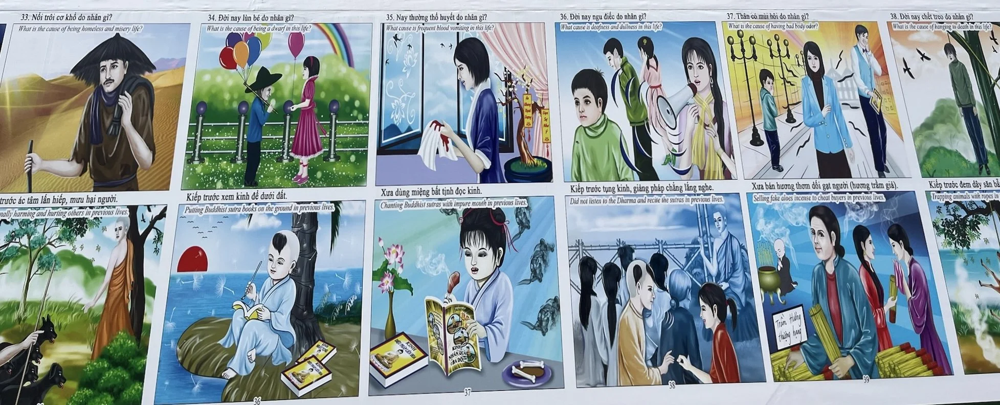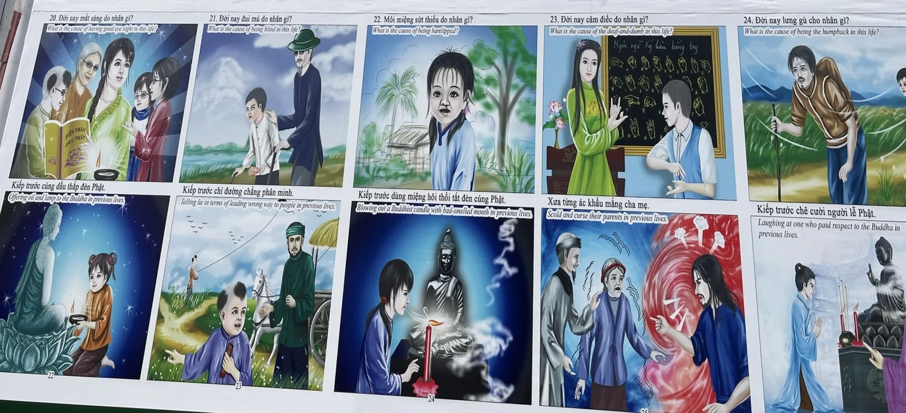 Wanneer we dit zottenkot verlaten zien we nog een gigantische affiche omhoog hangen waarop steeds staat vermeld welke ongelukken je zal ervaren in je volgende leven, als je bepaalde zaken verzaakt in het huidige. Wie, om een paar minder woke-voorbeelden te noemen, in dit leven blind is of een hazenlip heeft, heeft in zijn vorig leven ‘mensen te vaak de verkeerde weg uit gestuurd’, of ‘teveel tempelkaarsen uitgeblazen met een stinkende adem’. Hadden ze dat maar geweten. Heerlijke educatie!