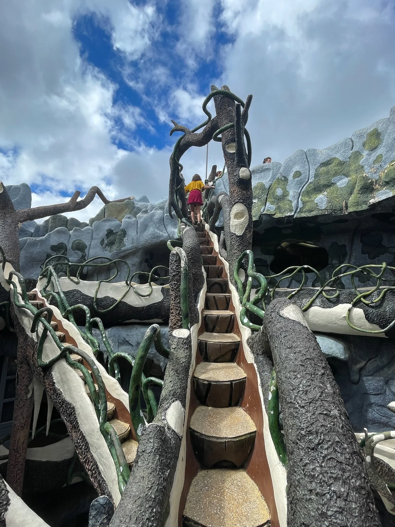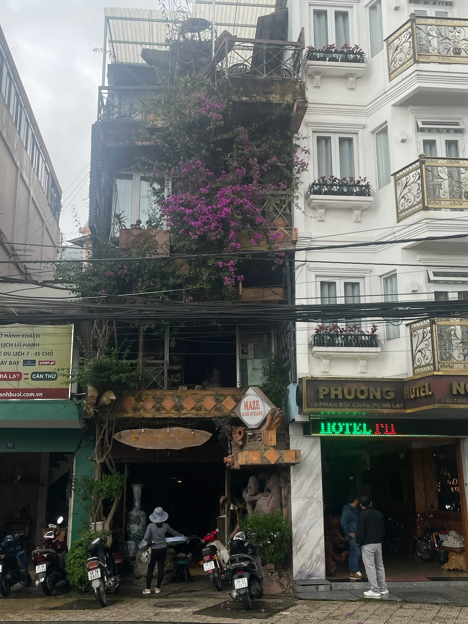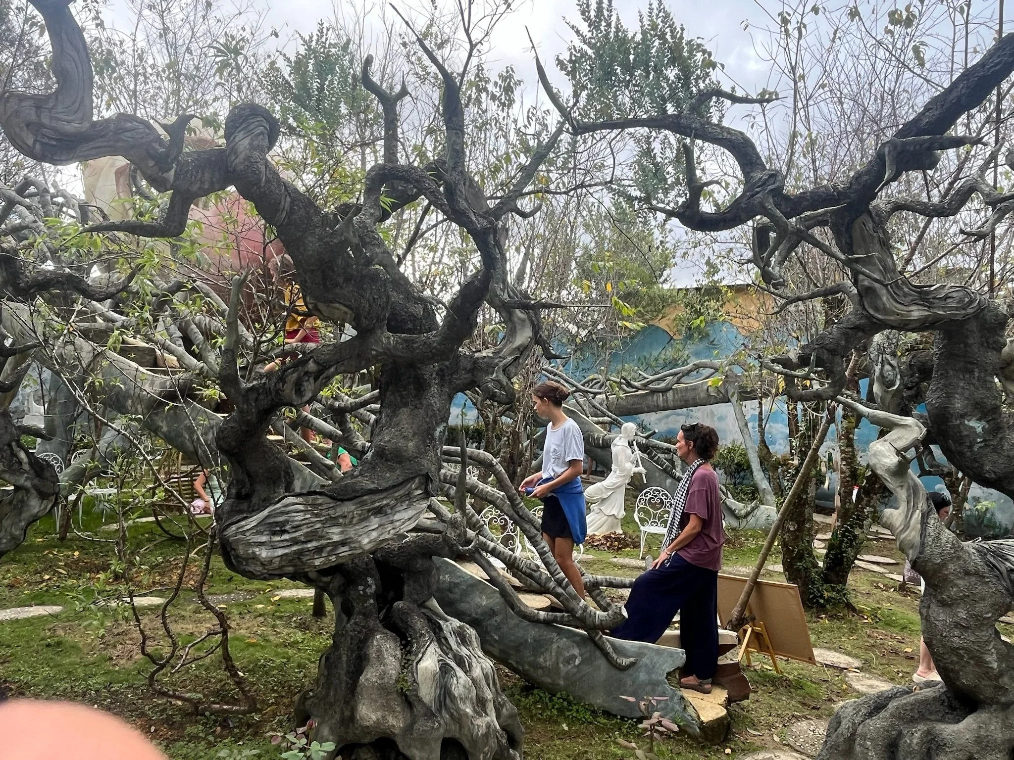 Een van de laatste dagen doen we nog een laatste vreemde architecturale wandeling, deze keer in een cafe genaamd The Maze. Het is een hoog smal huis waar je door een soort gebeeldhouwd bos loopt. Het doolhof loopt over de vier verdiepingen en eindigt op het dak. Voor je aan het doolhof begint moet je eerst beneden in de bar een drankje bestellen, waarna je naar een zitplaats naar keuze, verstopt doorheen de verdiepingen, op zoek mag gaan. Het is een beetje oncomfortabel om met een hete koffie en chocolademilkshake door de smalle gangen te klauteren, maar slechts een kniesoor die daarop let. Er hangt een crazy sfeer in Da Lat, zoveel is zeker.