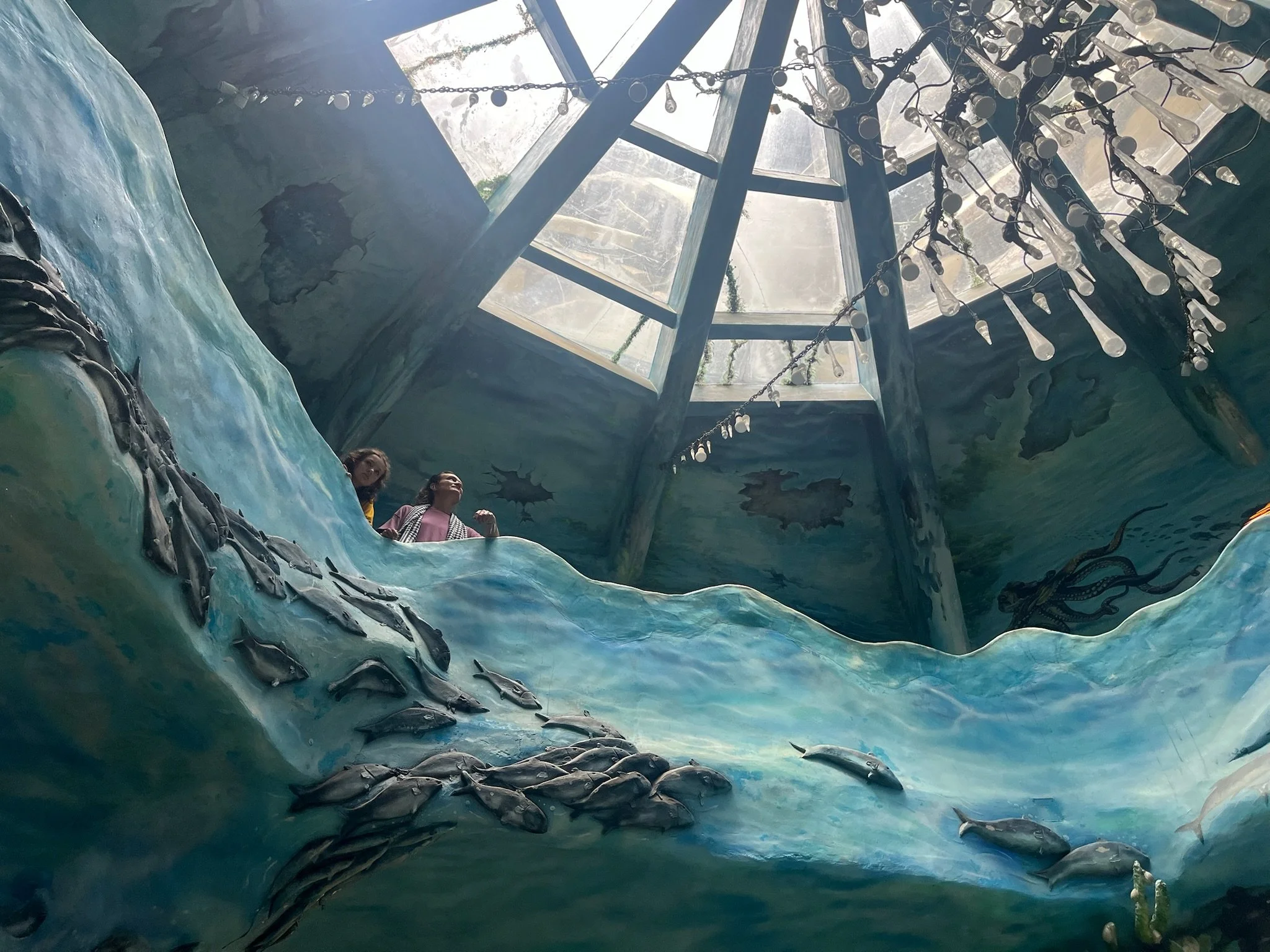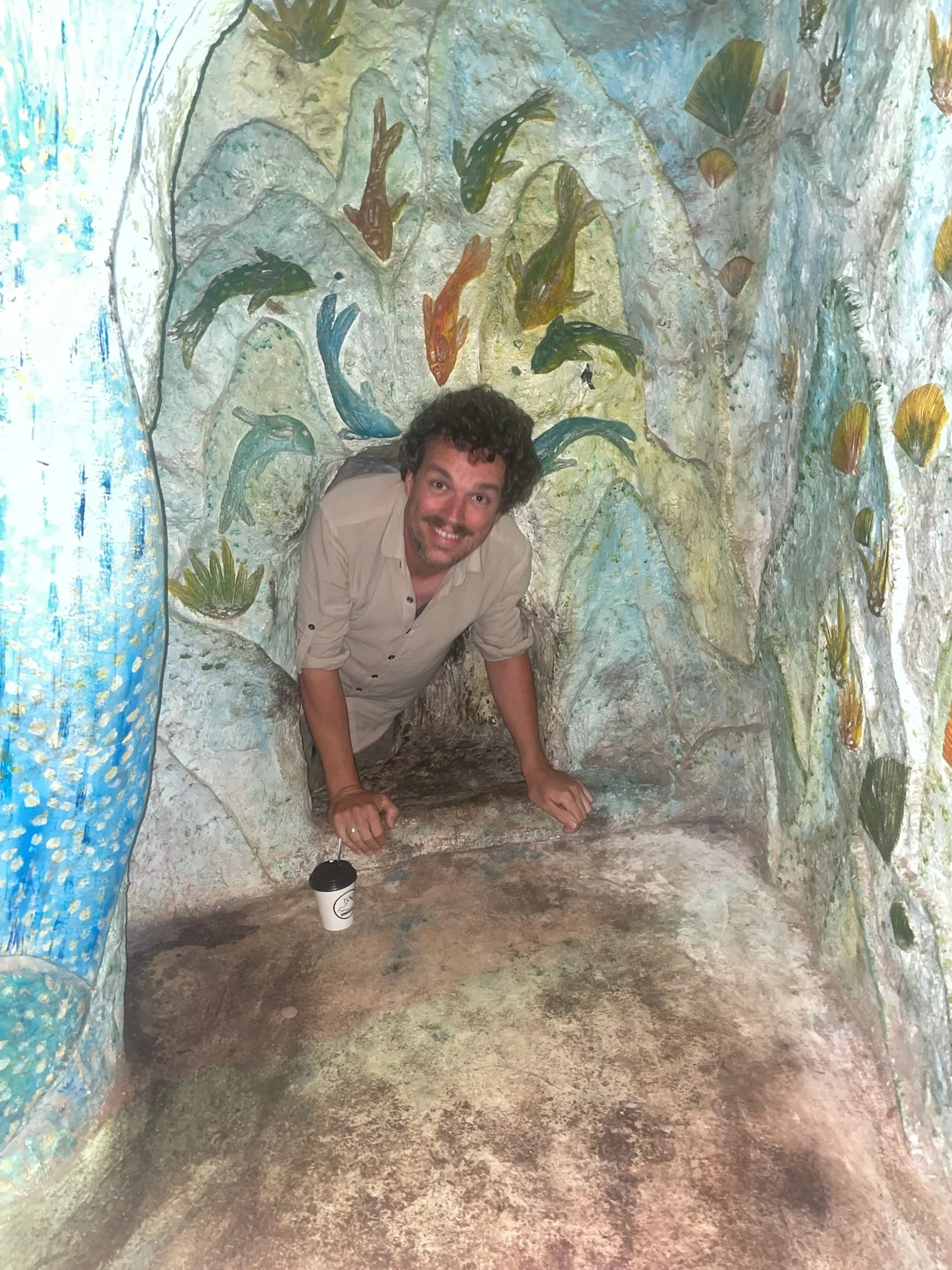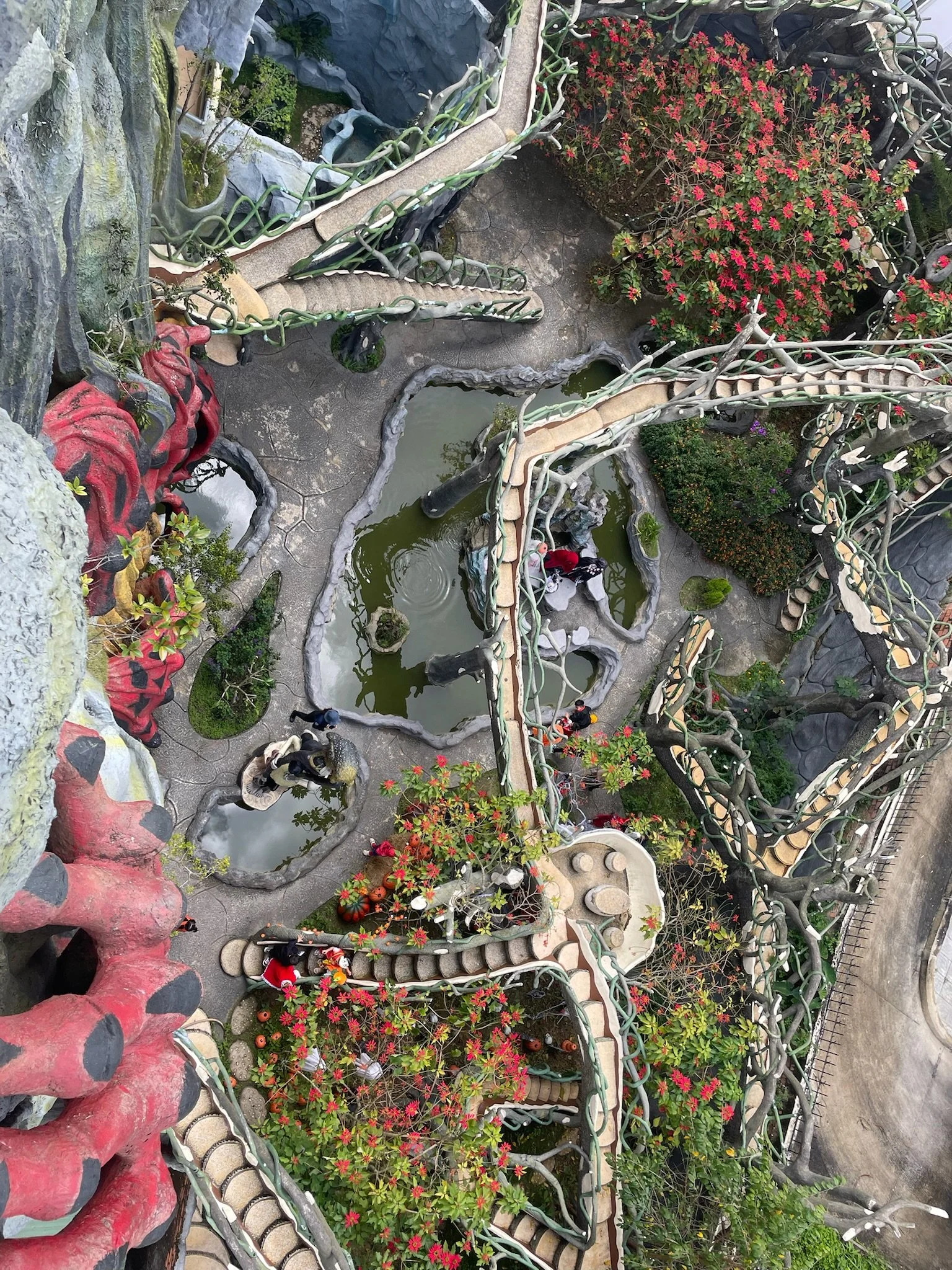 Een van de laatste dagen doen we nog een laatste vreemde architecturale wandeling, deze keer in een cafe genaamd The Maze. Het is een hoog smal huis waar je door een soort gebeeldhouwd bos loopt. Het doolhof loopt over de vier verdiepingen en eindigt op het dak. Voor je aan het doolhof begint moet je eerst beneden in de bar een drankje bestellen, waarna je naar een zitplaats naar keuze, verstopt doorheen de verdiepingen, op zoek mag gaan. Het is een beetje oncomfortabel om met een hete koffie en chocolademilkshake door de smalle gangen te klauteren, maar slechts een kniesoor die daarop let. Er hangt een crazy sfeer in Da Lat, zoveel is zeker.