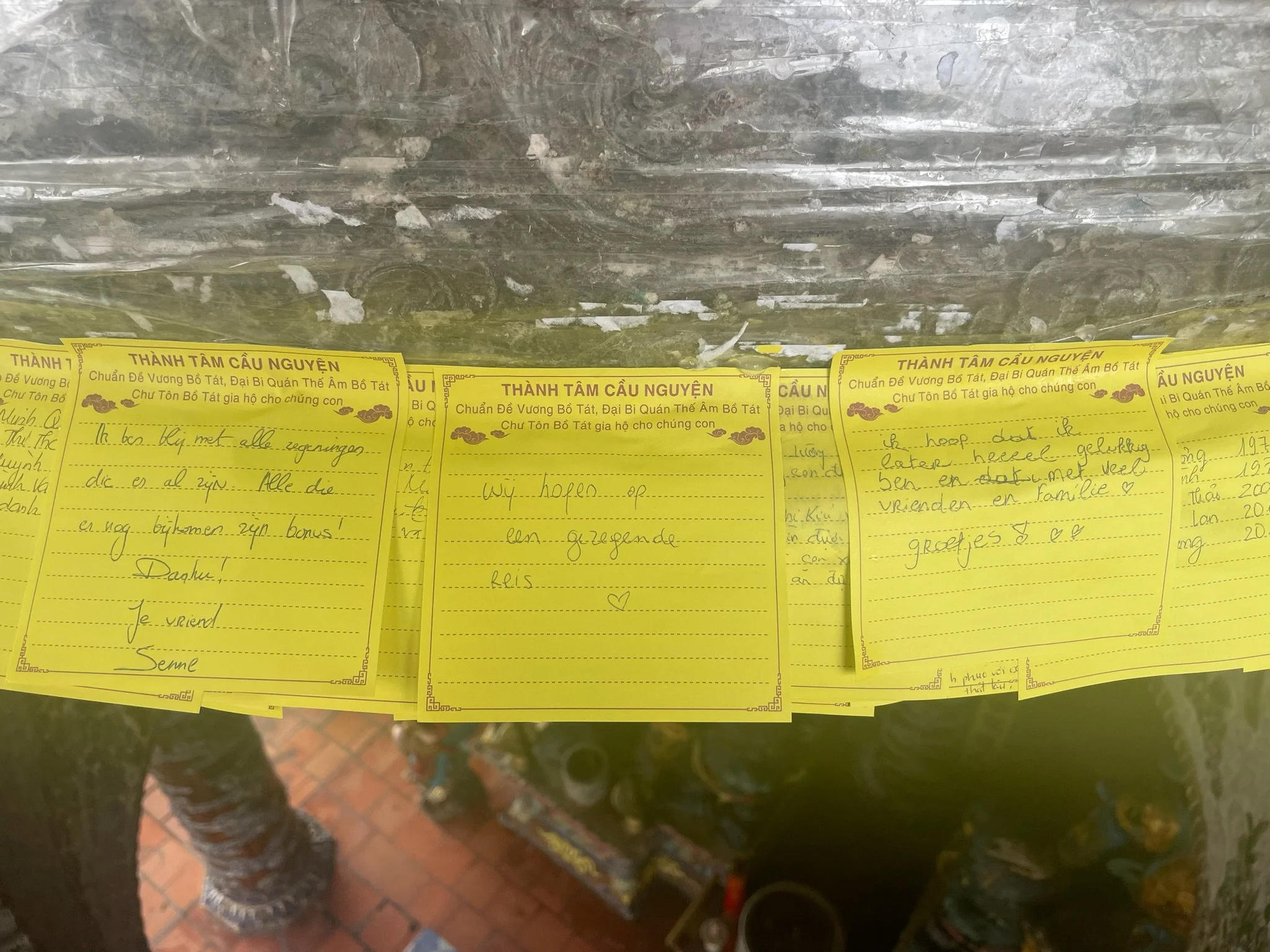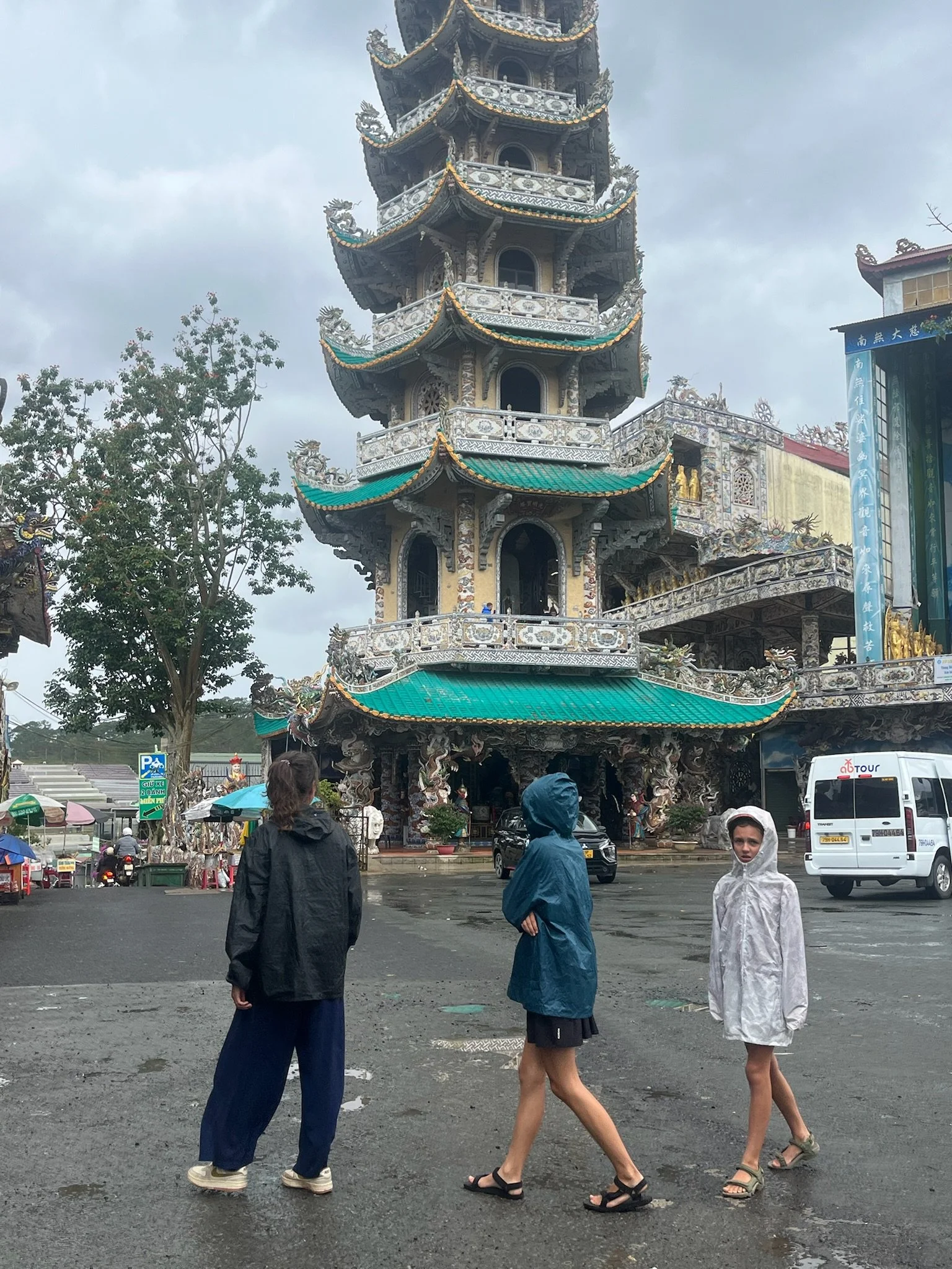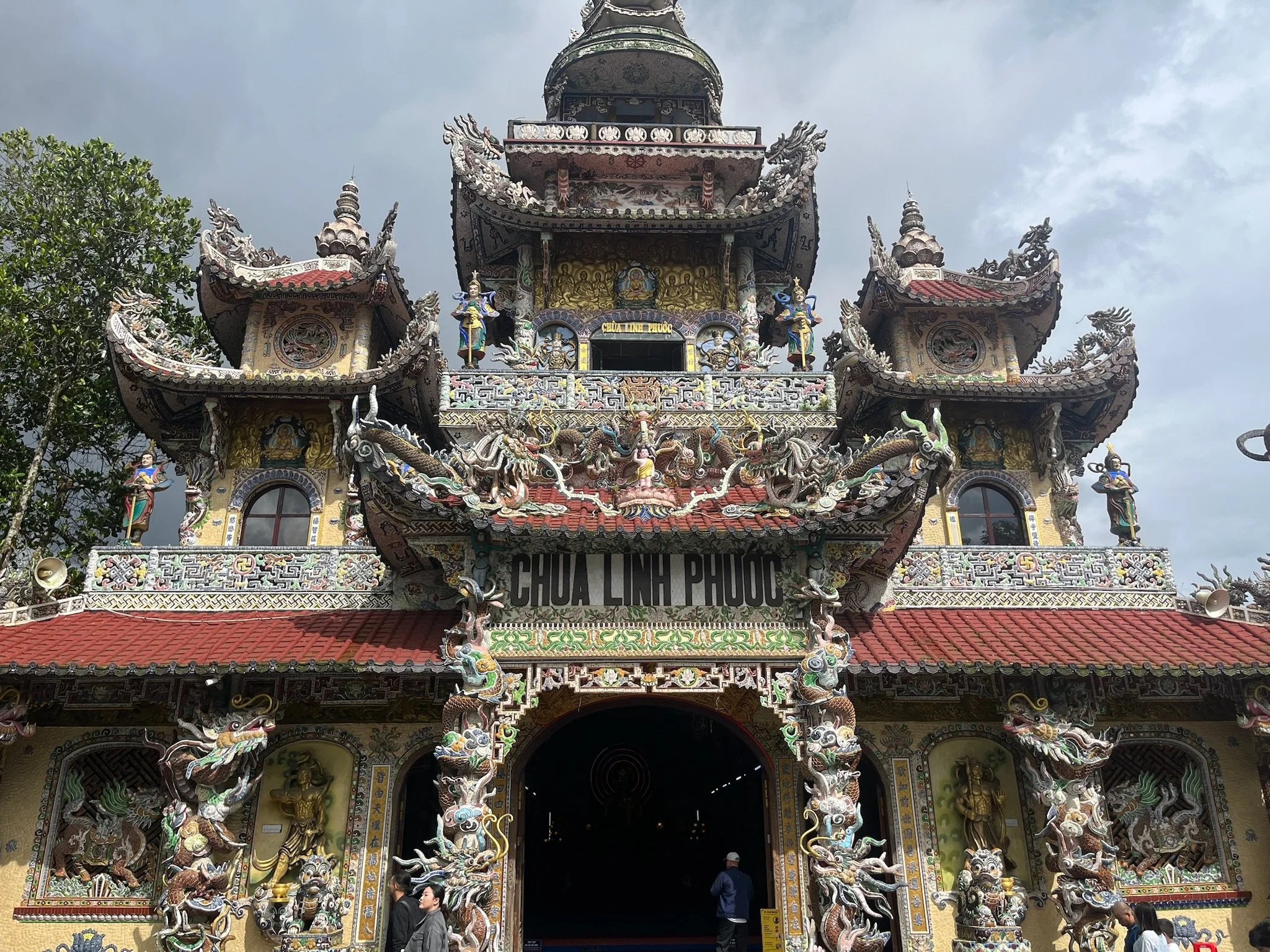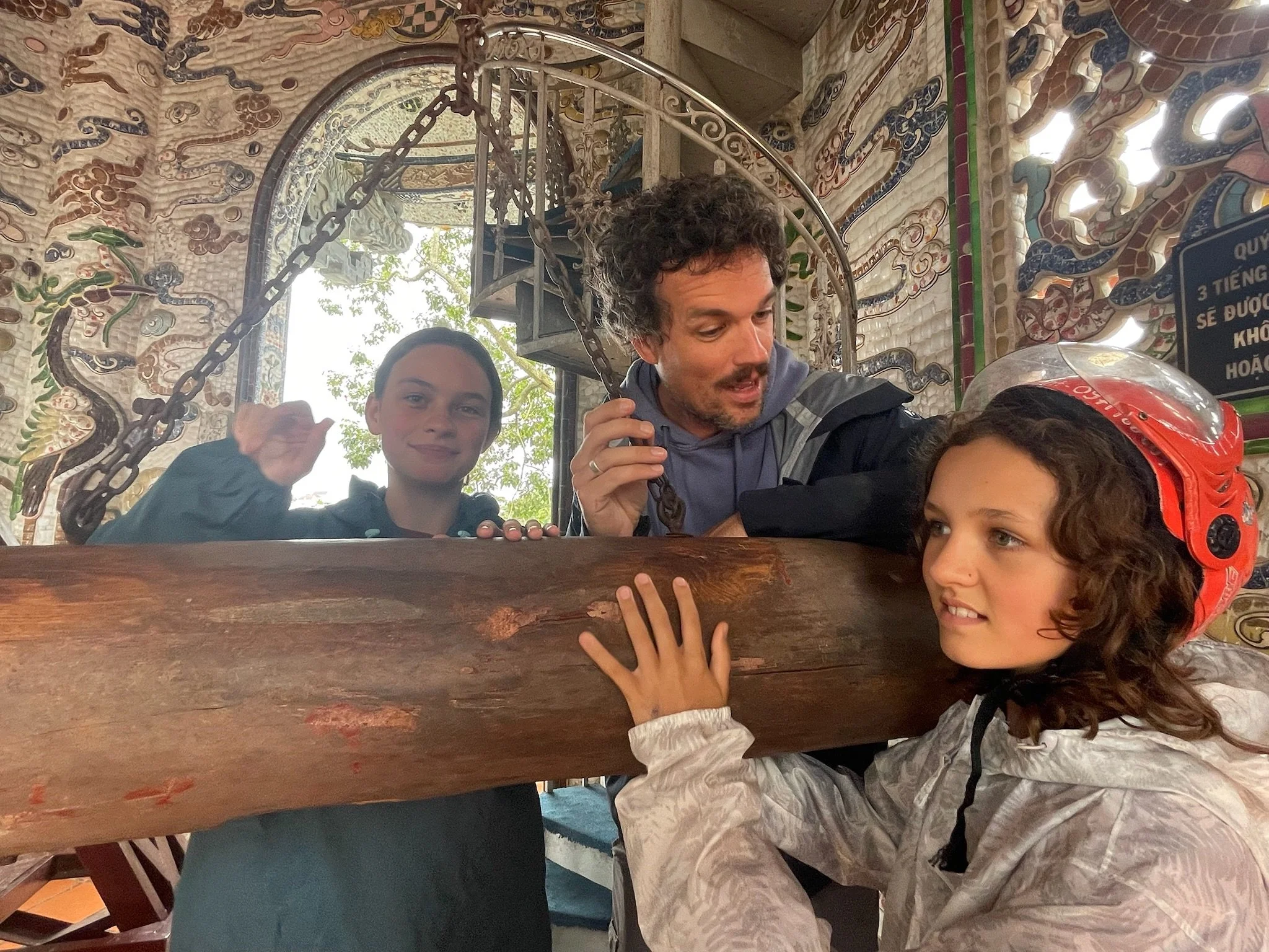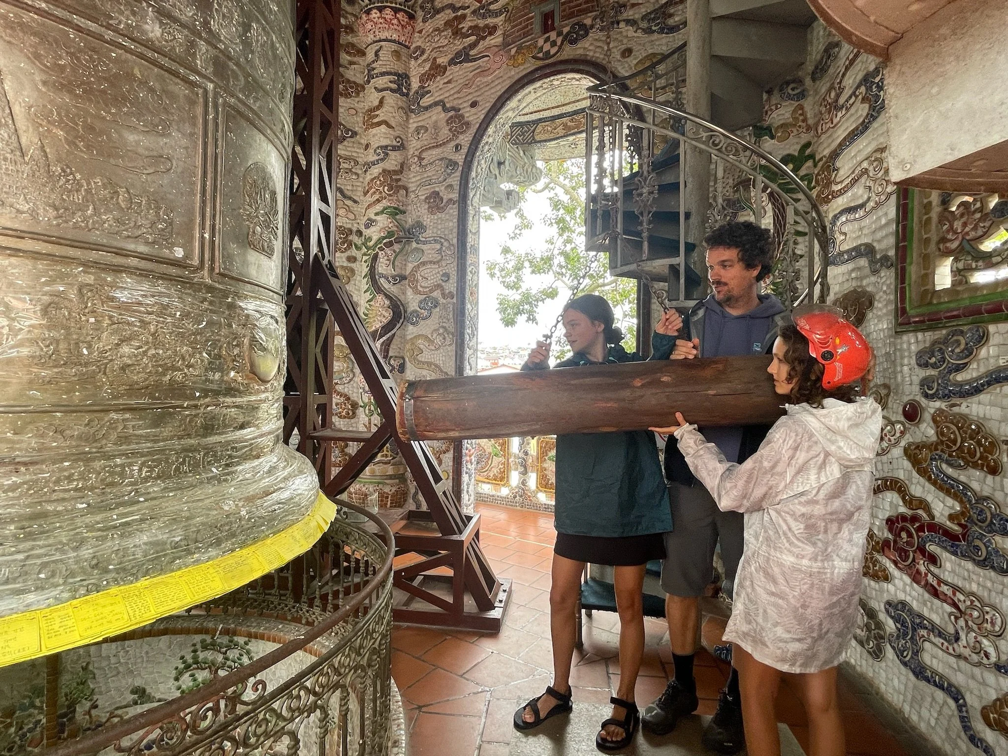 We brommeren verder naar de Linh Phuoc Pagode. Ook die staat bekend om zijn vreemde architectuur. De volledoge pagode is versierd met gerecylceerde stukjes aardewerk en glas. Daarnaast slingert er nog een 50 meter lange mozaieken draak rond de pagode, ook gemaakt van 12.000 stukjes gerecycleerd glas. Het geheel maakt wel indruk. Tegenover de pagode staat de Linh Thap klokkentoren van bijna 40 meter hoog, met binnenin de Dai Hong Chung Bell van bijna 9 ton. Je mag je zegeningen opschrijven, op de bel kleven en vervolgens een middeleeuwse stormram tegen de bel laten kletteren. Dat doen we natuurlijk, al zal later blijken dat niemand er aan gedacht had om wat beter weer te wensen voor deze reis.