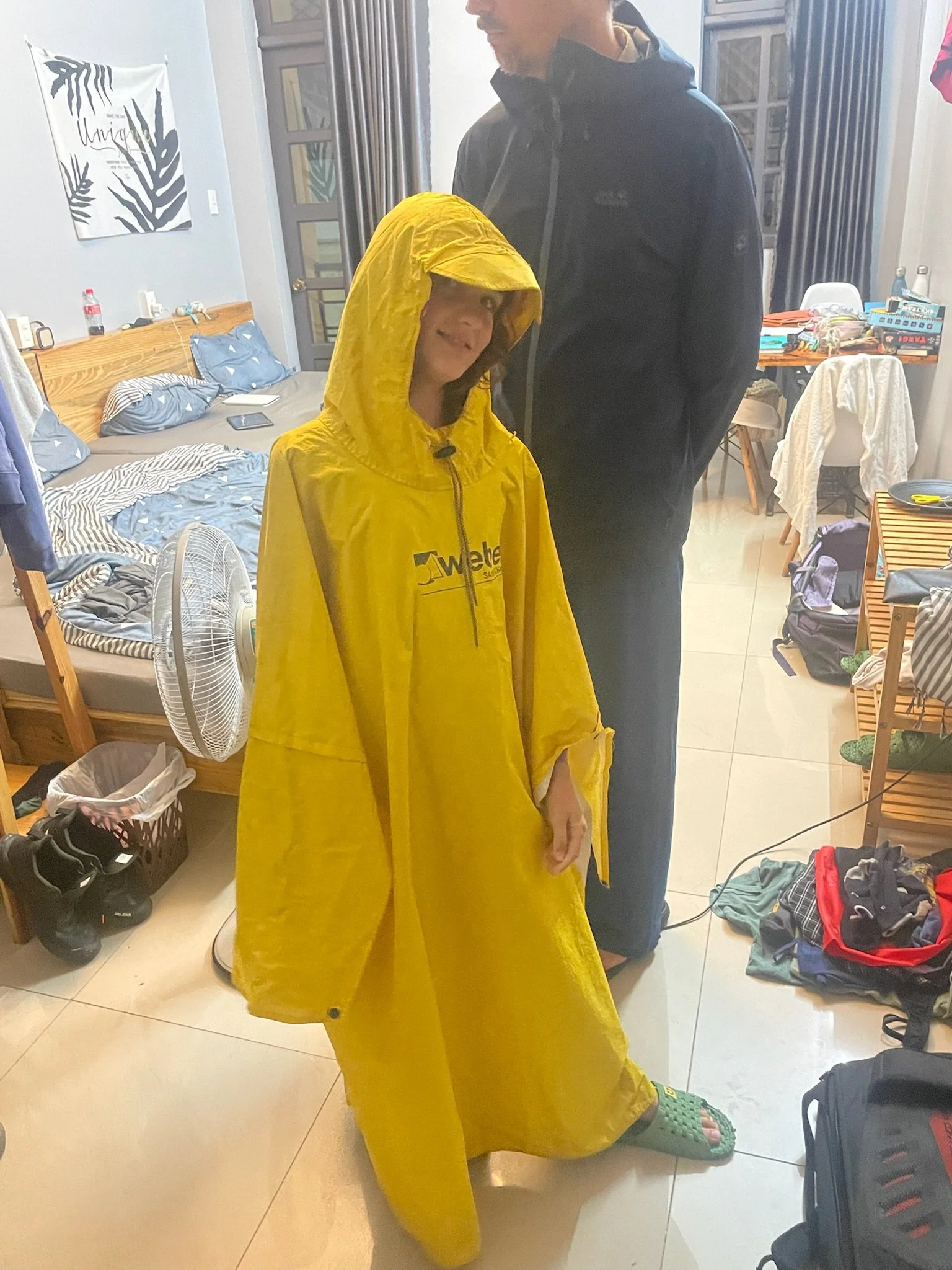 Maar goed, we hebben daar dus heerlijke noodlesoep gegeten en zijn klaar om op onze brommers te springen, maar de regen klettert alweer vrolijk naar beneden. Het vrouwtje van de noodleshop geeft ons nog een grote knalgele anorakdekzeil mee maar dat houdt slechts 1 van ons droog, de andere drie zijn nogmaals veroordeeld tot een kletsnatte brommerrit. Het is ondertussen een vast patroon geworden, deze regen elke dag in de namiddag. Maar we lezen dat in Hoi An opnieuw enkele stormen aan land komen, en het is daar ook weer helemaal flooded. Ook in Phu Quoc, het eiland van de Verdwenen Charme, staan de straten tot een meter diep onder water. De meeste stormen komen van de Filippijnen en worden nog wat sterker door het warmere zeewater, maar ook de eindeloze bouwactiviteiten doen er geen goed aan. Het Colosseum en de Trevi Fontein hebben natte voeten.