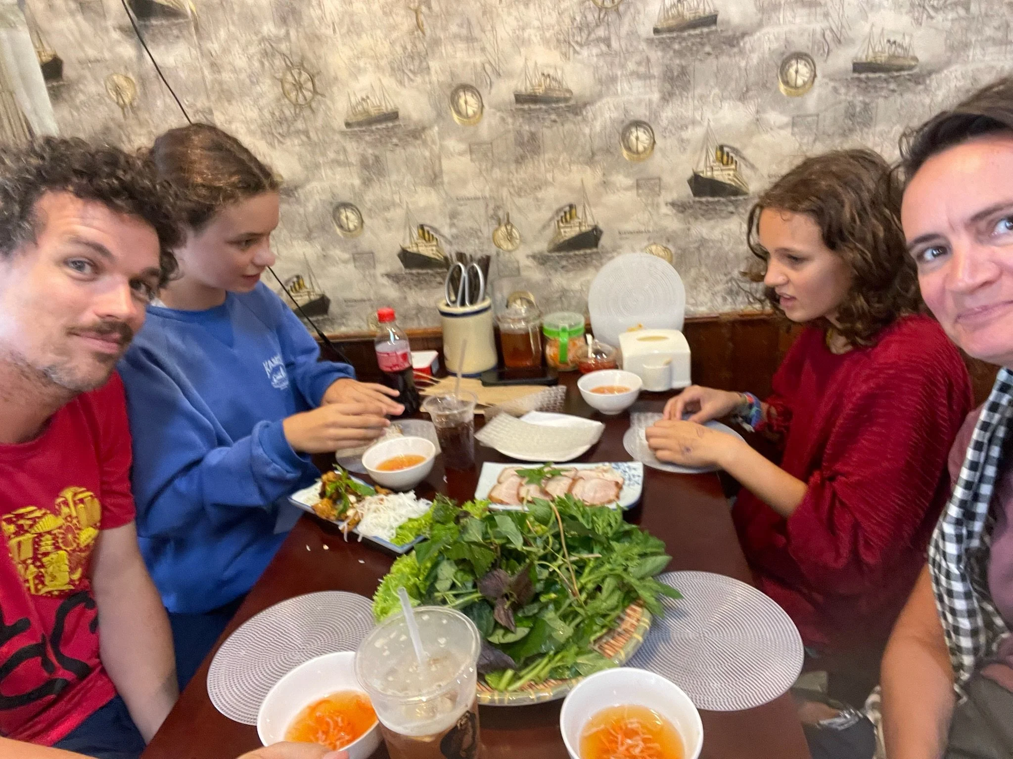 De Vietnamese taal is nogal hard, direct en absoluut ‘no nonsense’. We proberen er zoveel mogelijk van te spreken of te verstaan, maar het blijft toch vooral een aartsmoeilijke taal in verschillende toonhoogtes. Senne heeft zich toegelegd op het herkennen van woorden die verband houden met eten. Tenslotte is dat een handige kwaliteit als je bij een etenstalletje staat en moet kiezen tussen de verschillende delen van een kip die je tussen je broodje wil… Ik probeer de cijfers en de rekeningen, maar de kinderen doen dus al vlotjes mee. Het is belangrijk dat je vooral niet te omfloerst probeer te zijn. Voor de rekening moet je niet afkomen met de constructie ‘I would like to ask the bill to pay for our meals’, je zeg gewoon ‘Check.Pay’ oftewel in fonetisch Vietnamees ‘Tun Teejn’. Kort en duidelijk. Als je dit combineert met hun scherpe klanken krijg je al snel het gevoel dat je een scheldtirade krijgt, maar eigenlijk zijn ze dus gewoon heel duidelijk :) Als je op de nightmarket voor een madammetje haar kastanjekraam staat zal ze niet zeggen ‘willen jullie een beetje verder staan, je staat wat in de weg’, nee, ze slingert maximum drie korte woorden naar jou, en daarmee weet je wat je moet doen. Dat botst wat met mijn Europese ingebakken beleefdheid. Ik heb de neiging om alles wat omfloerster te zeggen, en veel te veel dankuwel. Maar uiteraard is er geen goede of slechte manier. Helaas, willens nillens zit er gelijk toch een kleine moraalridder in mij, maar gelukkig laat ik die tijdens zo’n reis meer en meer achter.
