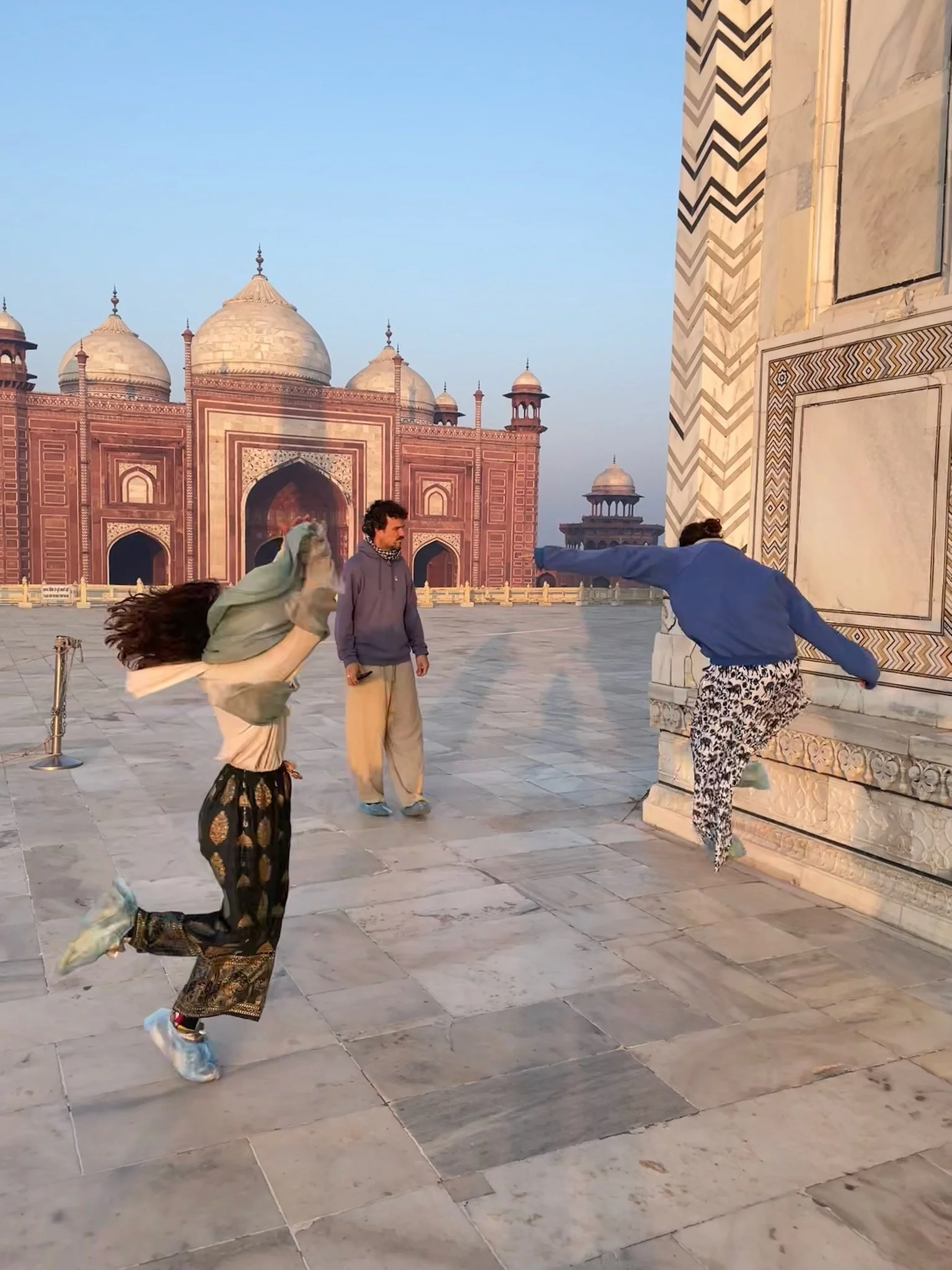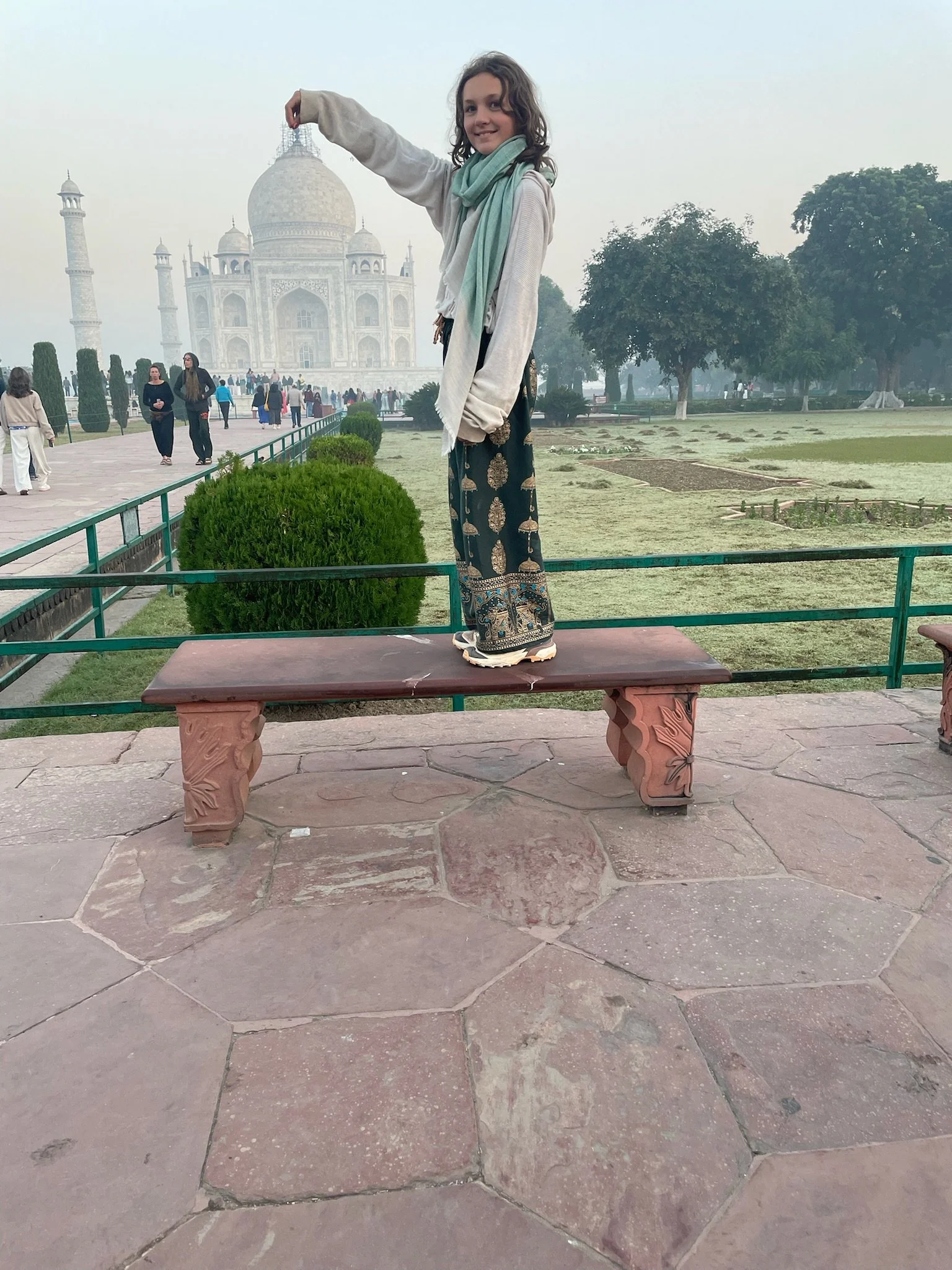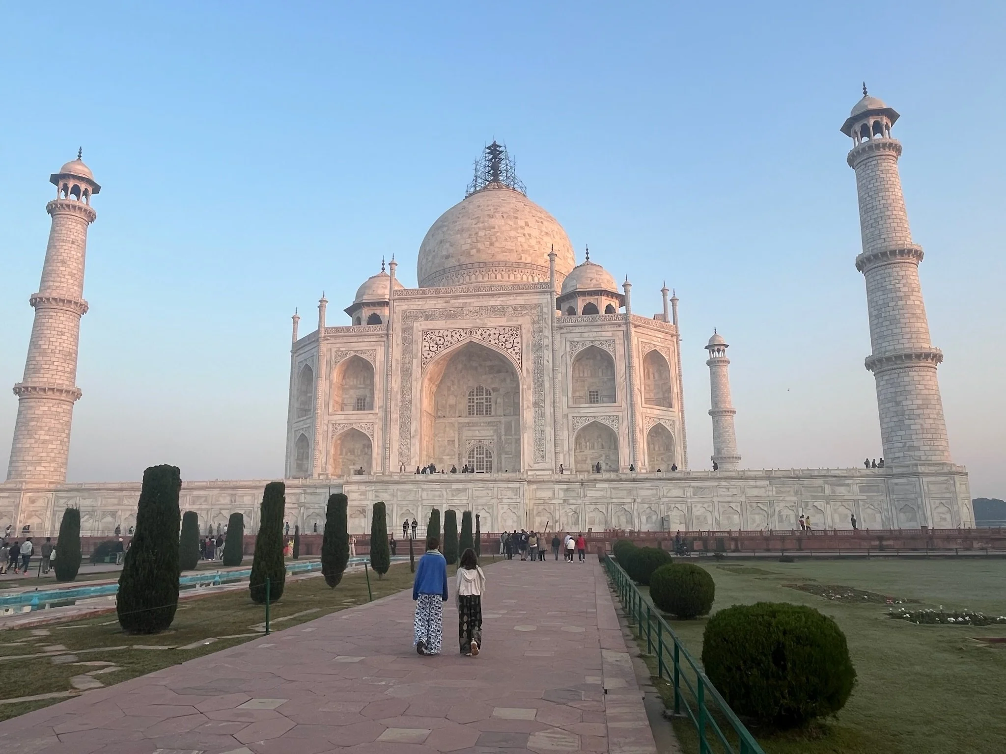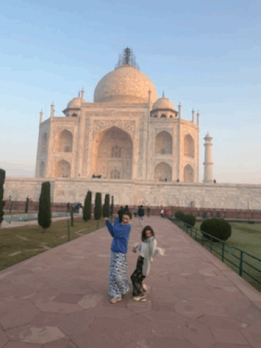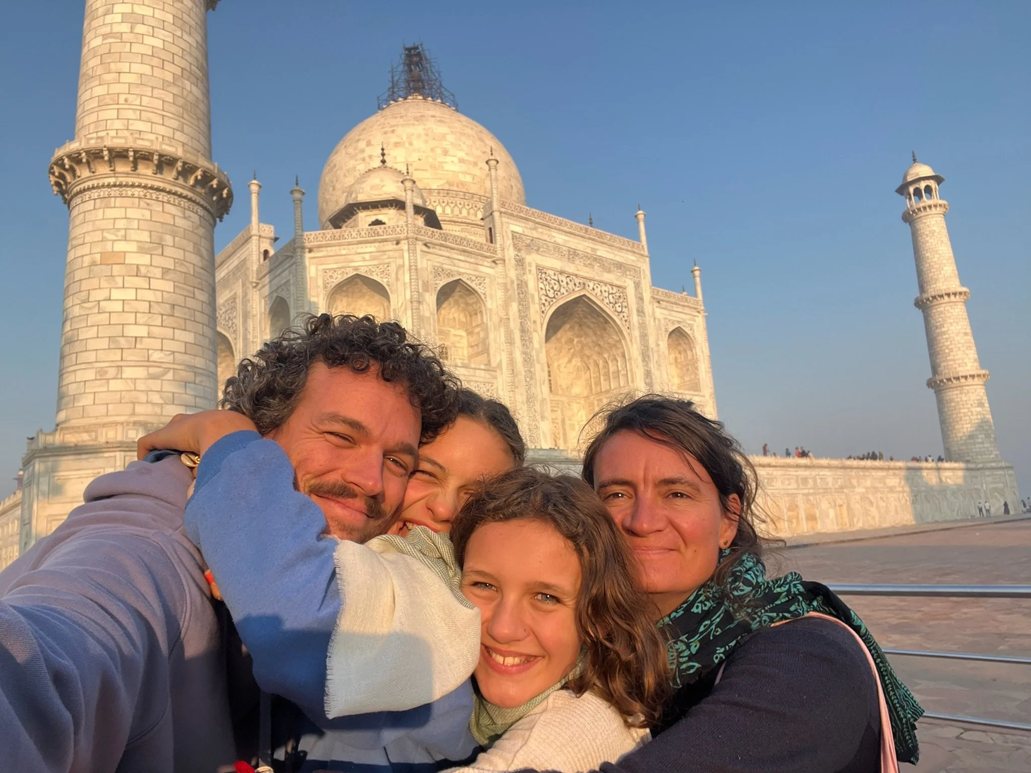 De Taj Mahal is naast een ongelofelijk indrukwekkend gebouw ook een prachtige green screen waar iedereen dezelfde foto neemt en denkt dat de zijne de origineelste is. Heel grappig om zien, maar we doen uiteraard gewoon vrolijk mee, met kleine oogjes. Eerst de ingang, dan het beeld waar het lijkt alsof je vinger op de top staat en dan de foto aan het water, waar er zelfs proper een rijtje wordt gevormd en er allerlei Indische fotografen “NEXT!” roepen, waarna ze 20 keer afdrukken alsof je ergens op een rode loper staat, De foto’s droppen ze daarna via een geheugenkaartje op je telefoon voor een paar honderd roepie, dhanyavad.