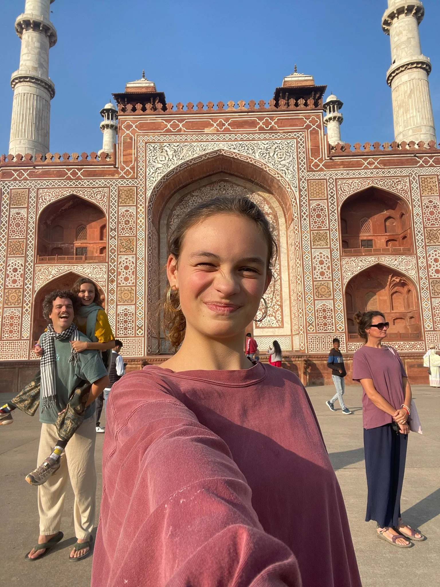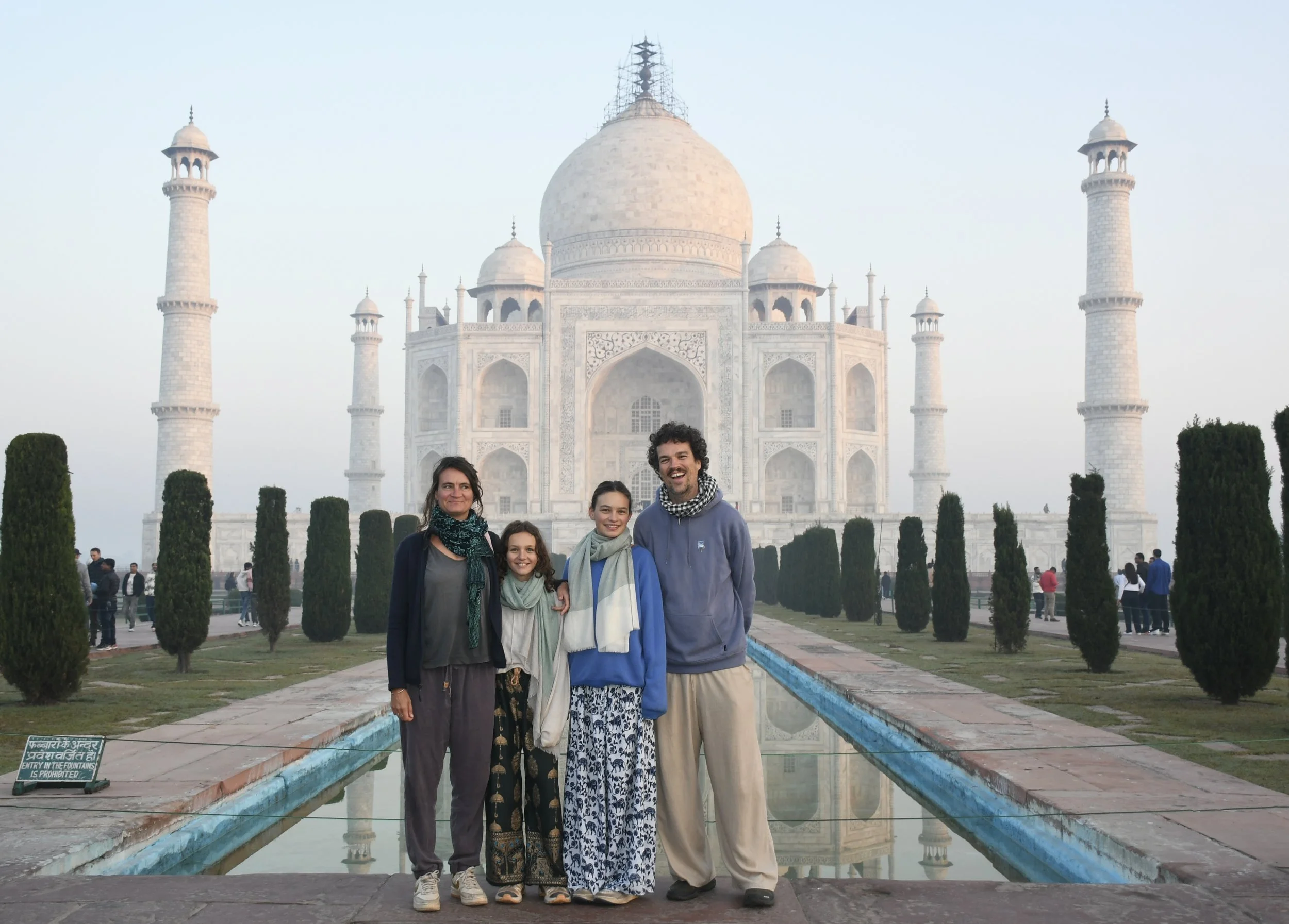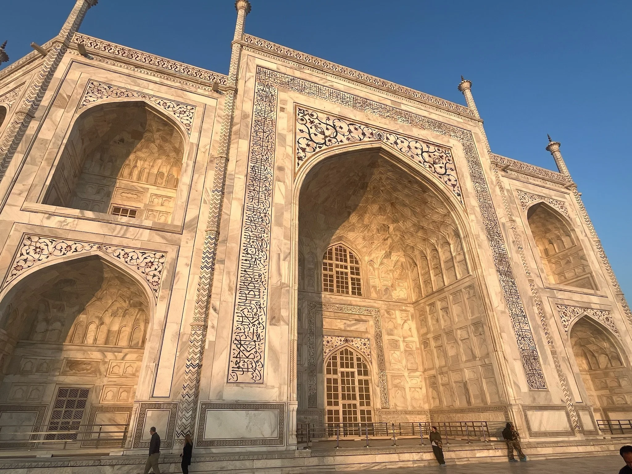 De Taj Mahal is naast een ongelofelijk indrukwekkend gebouw ook een prachtige green screen waar iedereen dezelfde foto neemt en denkt dat de zijne de origineelste is. Heel grappig om zien, maar we doen uiteraard gewoon vrolijk mee, met kleine oogjes. Eerst de ingang, dan het beeld waar het lijkt alsof je vinger op de top staat en dan de foto aan het water, waar er zelfs proper een rijtje wordt gevormd en er allerlei Indische fotografen “NEXT!” roepen, waarna ze 20 keer afdrukken alsof je ergens op een rode loper staat, De foto’s droppen ze daarna via een geheugenkaartje op je telefoon voor een paar honderd roepie, dhanyavad.