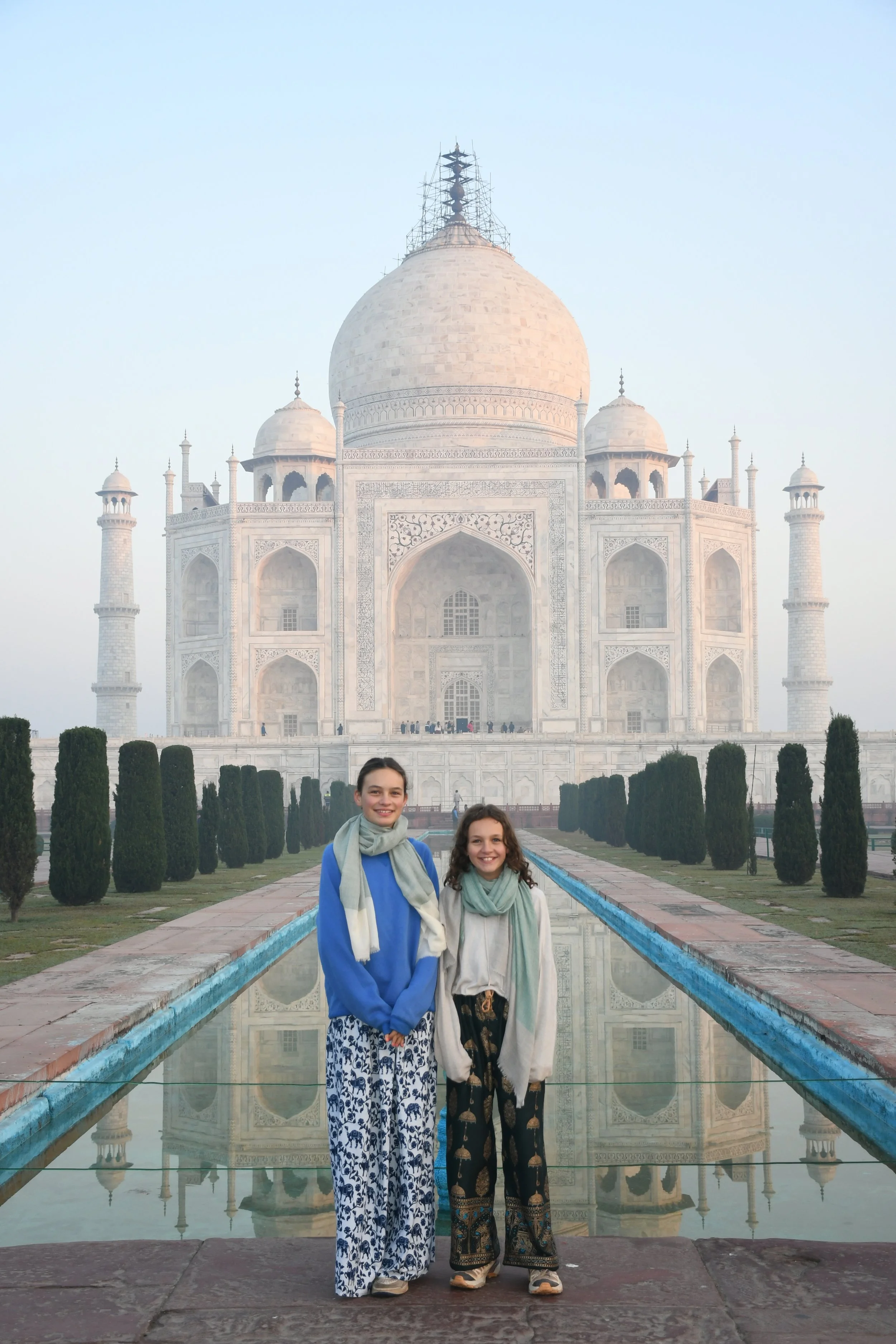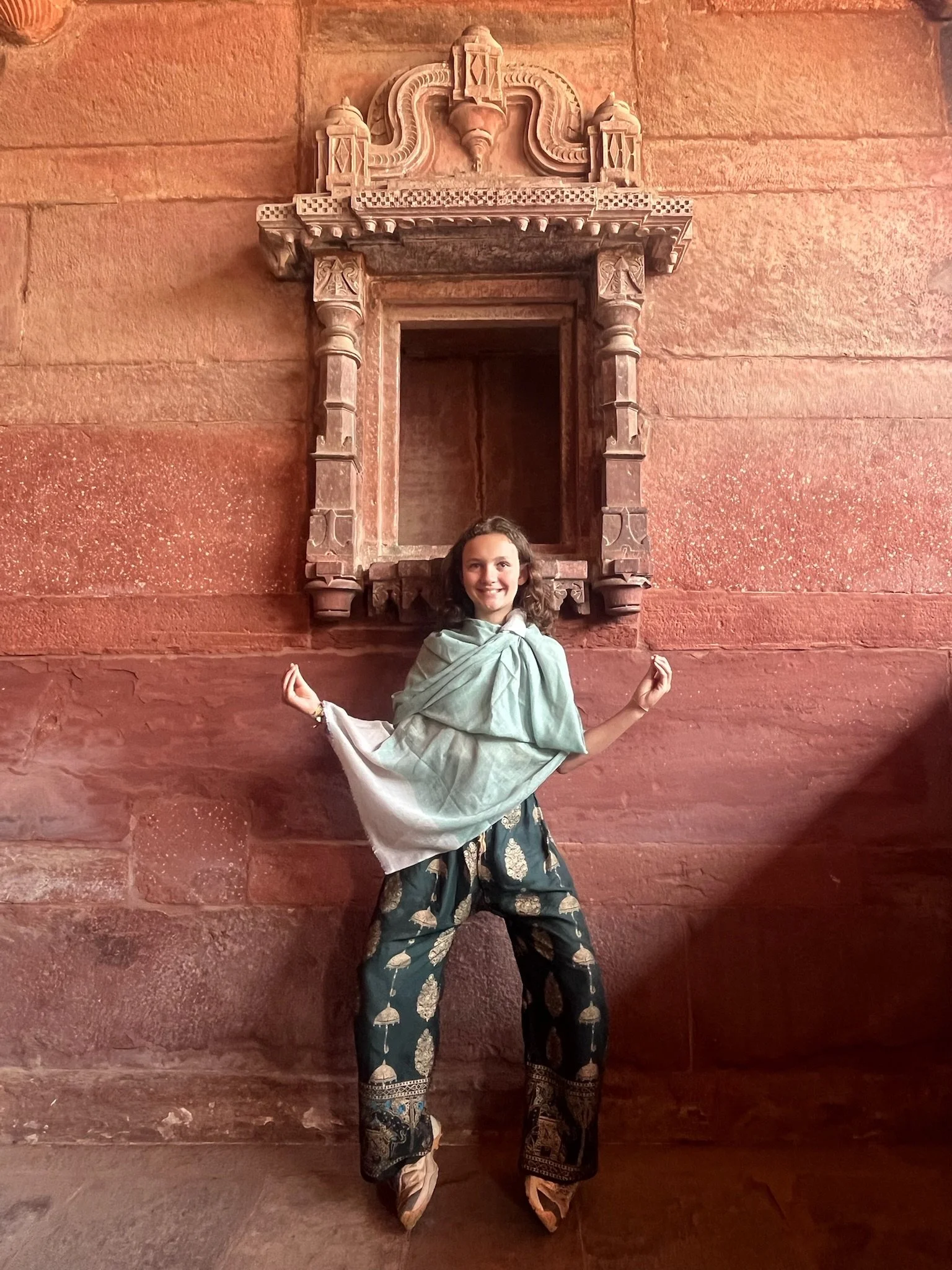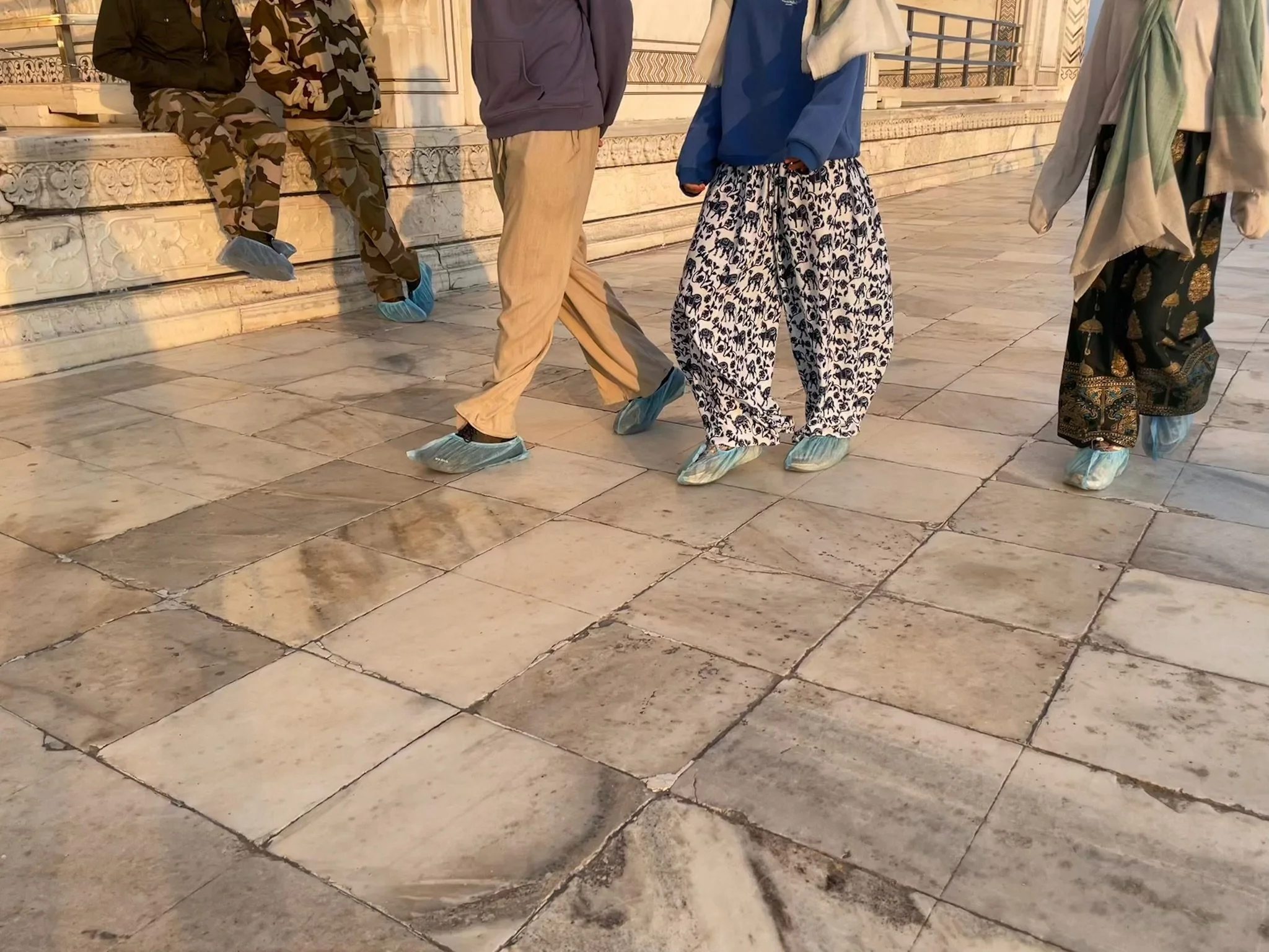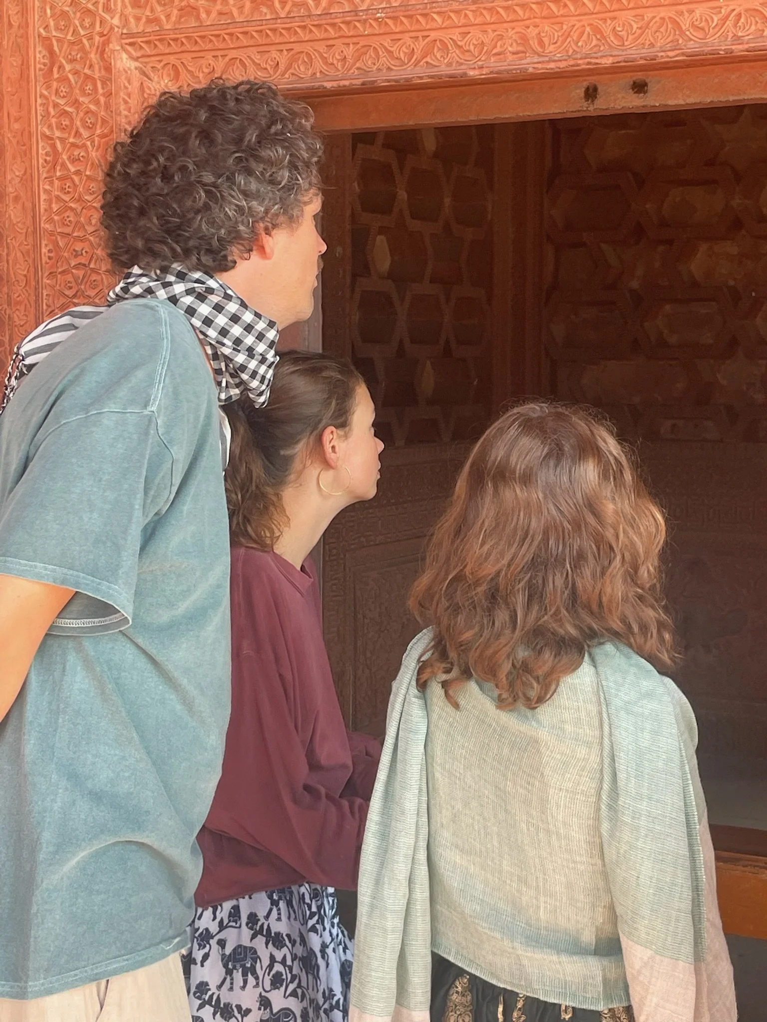 De Taj Mahal is naast een ongelofelijk indrukwekkend gebouw ook een prachtige green screen waar iedereen dezelfde foto neemt en denkt dat de zijne de origineelste is. Heel grappig om zien, maar we doen uiteraard gewoon vrolijk mee, met kleine oogjes. Eerst de ingang, dan het beeld waar het lijkt alsof je vinger op de top staat en dan de foto aan het water, waar er zelfs proper een rijtje wordt gevormd en er allerlei Indische fotografen “NEXT!” roepen, waarna ze 20 keer afdrukken alsof je ergens op een rode loper staat, De foto’s droppen ze daarna via een geheugenkaartje op je telefoon voor een paar honderd roepie, dhanyavad.