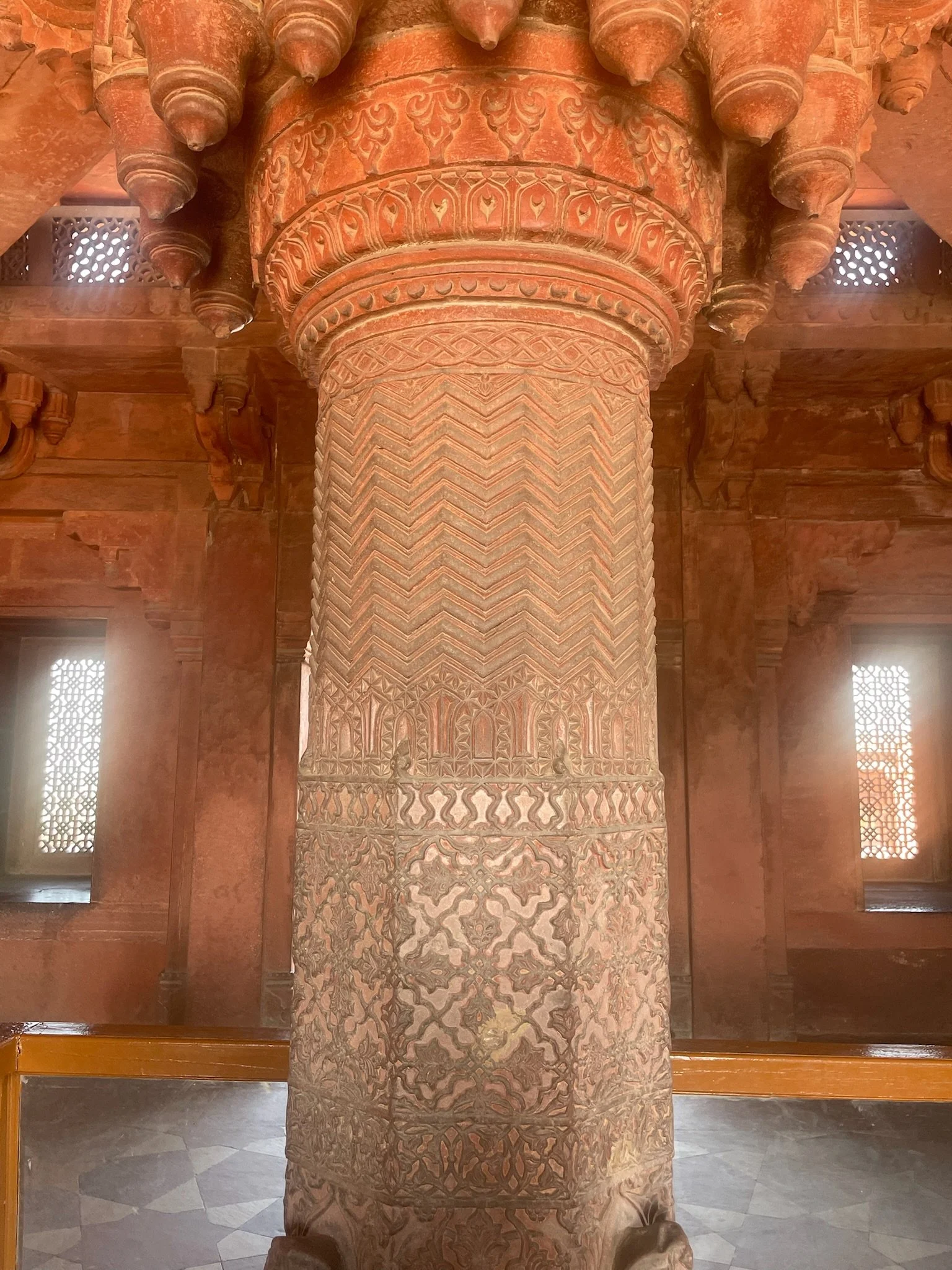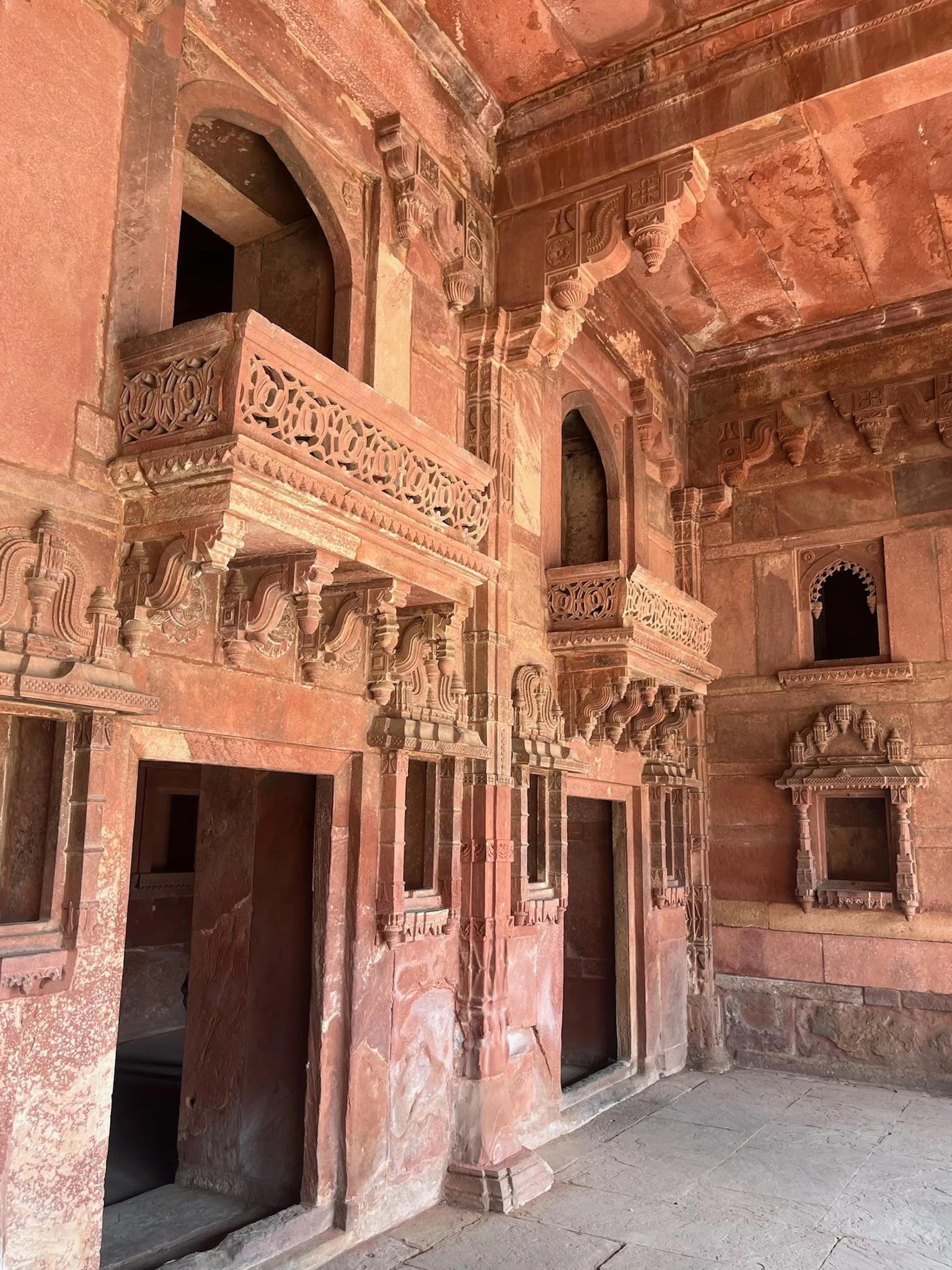 Fatehpur Sikri bestaat uit twee delen. Fatehpur, oftwel het paleis, en Sikri, het heiligdom. De huisjes en de straten errond bestaan niet langer, want als hoofdstad heeft Fatehpur Sikri maar 4 jaar gediend. Toen kwamen Akbar en z’n gevolg erachter dat er eigenlijk niet voldoende drinkwater voorradig was om een volledige bevolking te onderhouden. Dat had die soefi heilige misschien toch ook even mogen voorspellen alvorens Akbar aan z’n kolossaal bouwproject begon, maar goed, wat weet zo’n relatietherapeut daar ook van. Het paleis dat nu nog overeind staat is alleszins gigantisch. Dat was ook nodig, want Akbar had drie vrouwen en meer dan 500 vriendinnetjes. Dat van die drie vrouwen kon hij uitleggen: hij beschouwde zich als een religieus verzoener en had dus een moslim-vrouw, een christen-vrouw en een hindoe-vrouw. Die hebben elk uiteraard een eigen optrekje in het paleis, het ene al weelderiger dan het andere. In de pilaren is de symboliek van alle godsdiensten door mekaar verweven, mooi om zien. Er zijn winterslaapkamers en zomerslaapkamers, uitgestrekte ontvangstruimtes, keukens en aparte vegetarische keukens (voor de hindoe-vrouw), spiegelpaleizen en tempels, allemaal in rode zandsteen. De omvang is echt niet te schatten, allemaal om er vervolgens 4 jaar te wonen en het dan weer af te bollen. Crazy.