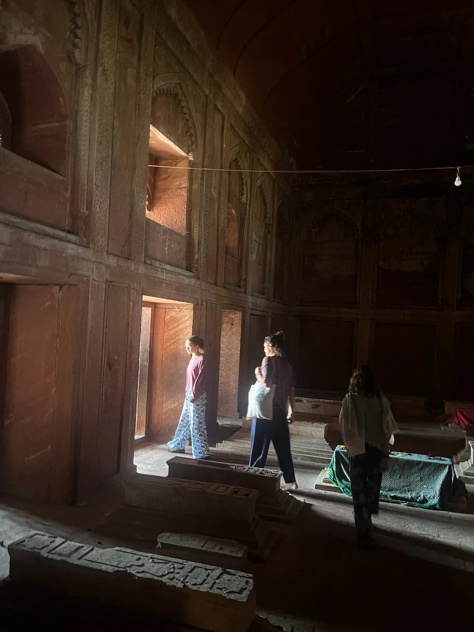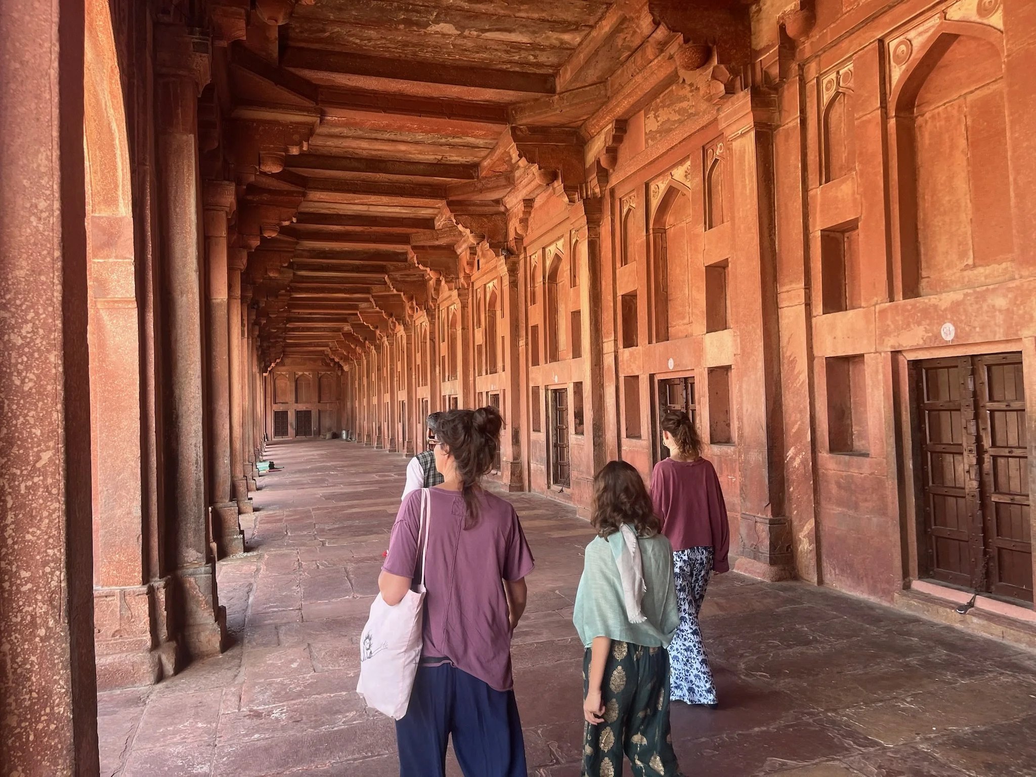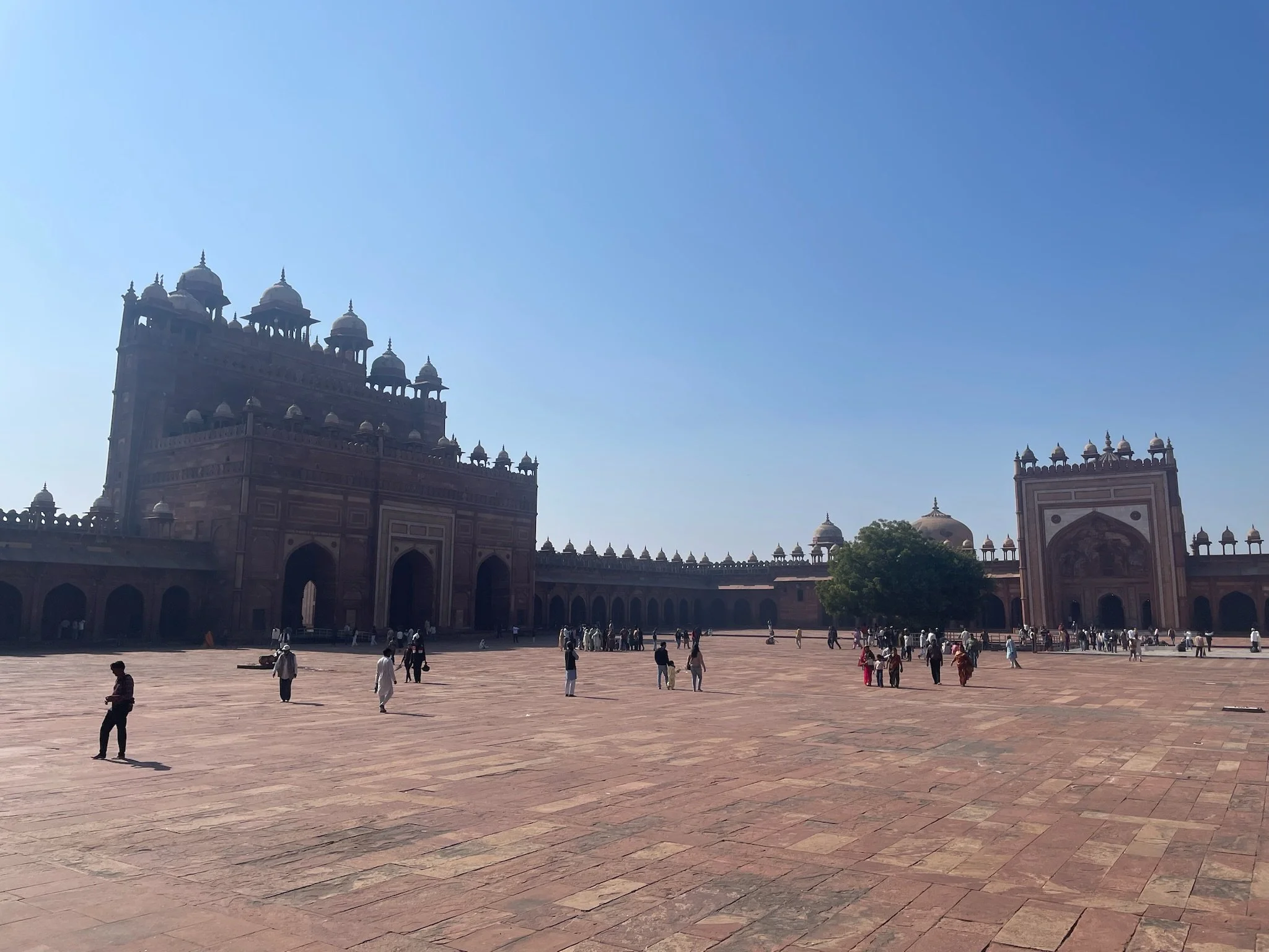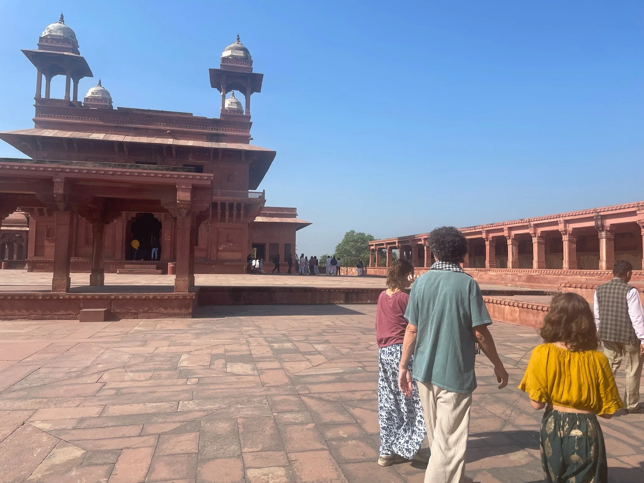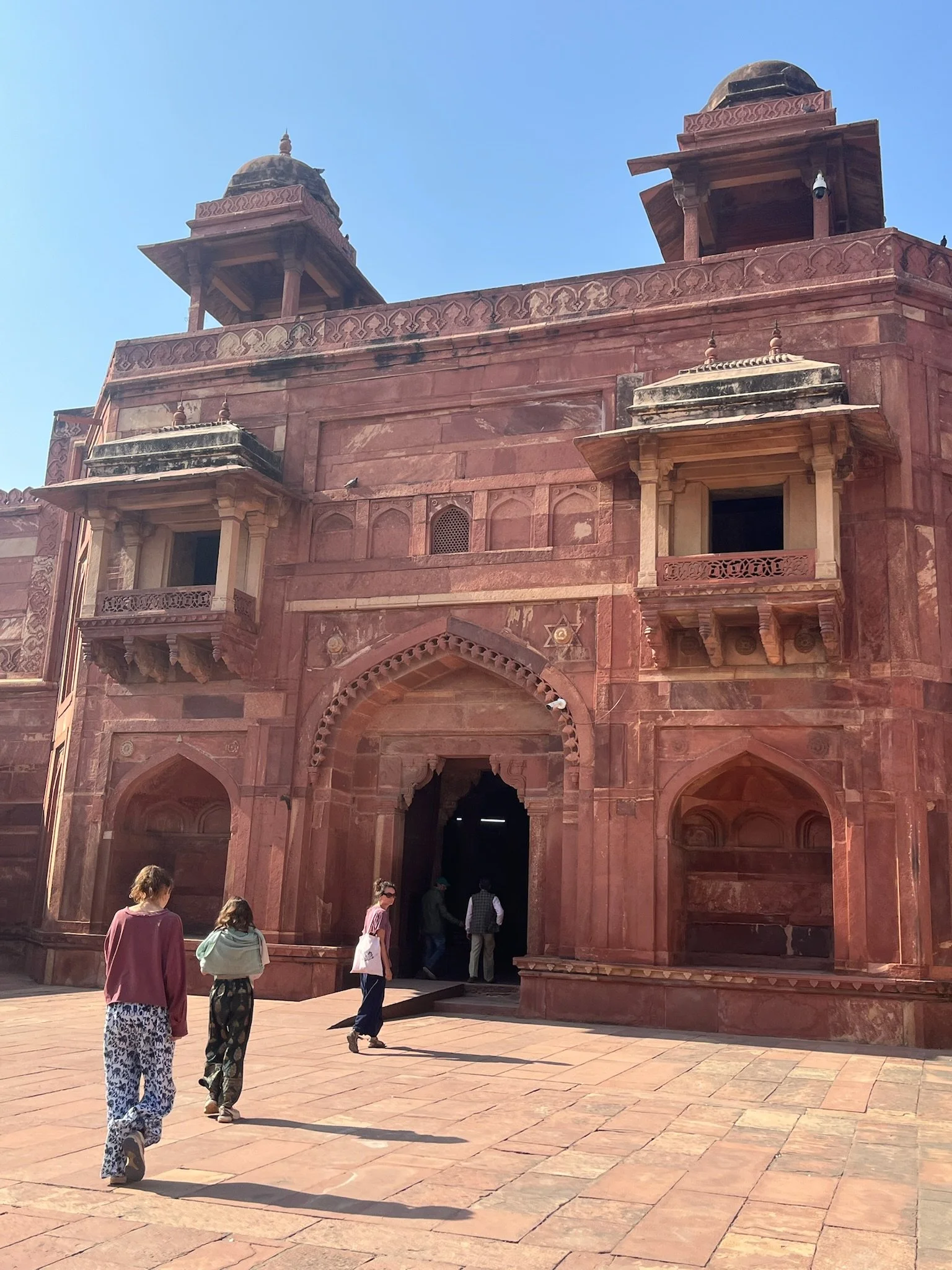 Onze gids - die volgens ons geen echte gids is en z’n “officiële” badge de hele tijd verbergt - wandelt met ons het woongedeelte uit richting Sikri, de moskee en de laatste rustplaats van de soefi heilige. De toegangspoort is impressionant en een van de hoogste van India. De moskee doet nog altijd dienst en de tombe van de heilige is een soort bedevaartsoord. Je mag er drie wensen doen en die komen bijna altijd allemaal uit. Sam en Robin worden razend enthousiast, maar als we vervolgens weigeren om een offerkleedje te kopen of extra geld te doneren, worden ze ongerust dat het op die manier niet zal werken. Time will tell, kinderen!