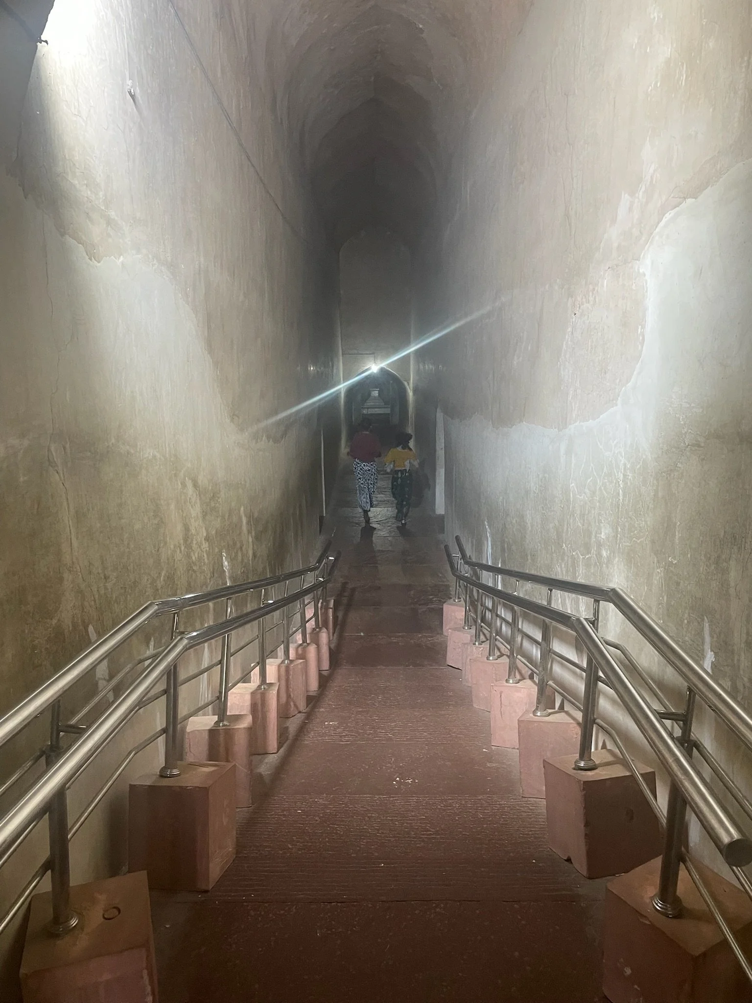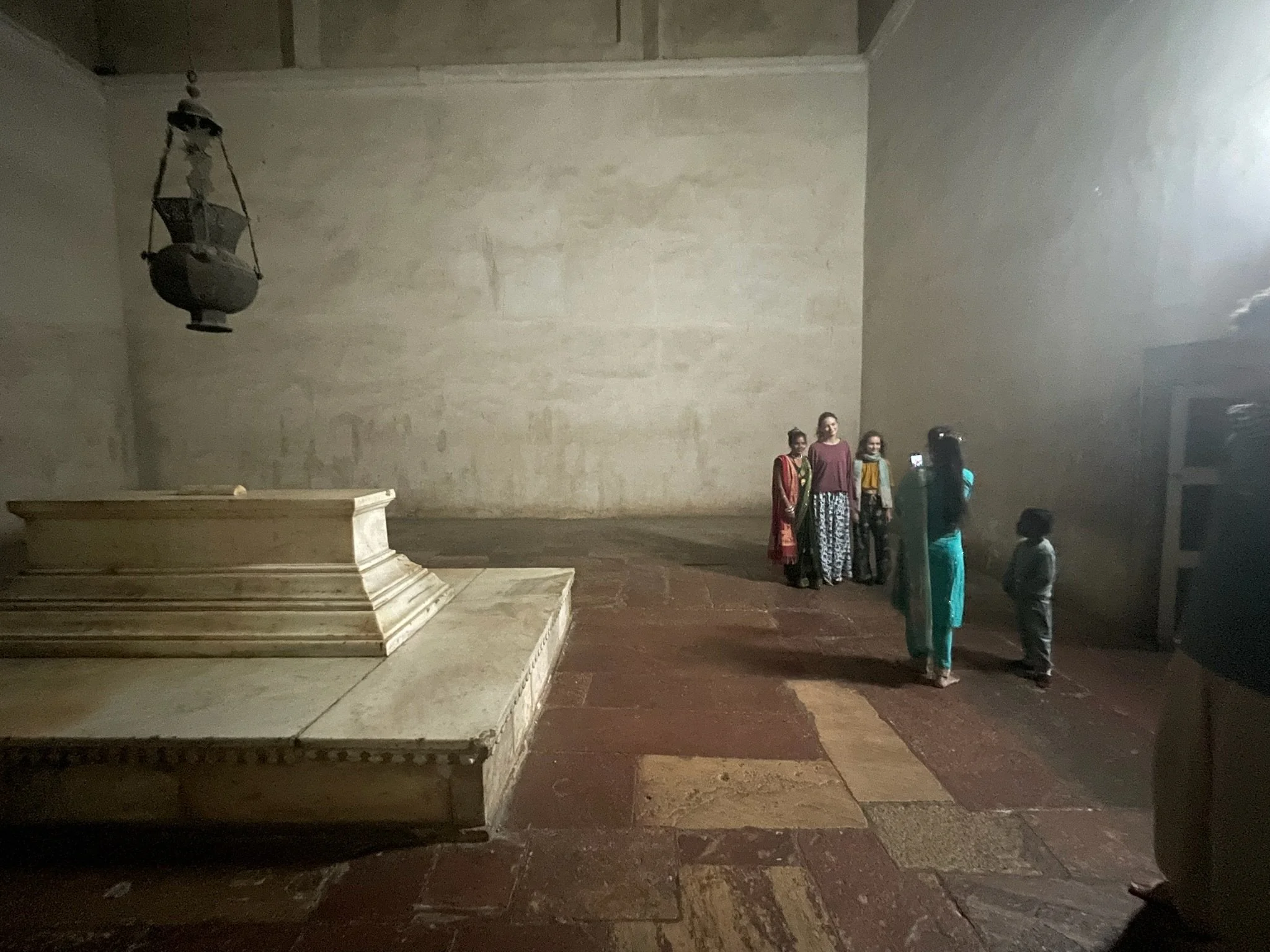 Op de terugweg van Fatehpur Sikri en op aanraden van meme Toren en Erna (die hier een paar dagen eerder gepasseerd zijn) stoppen we ook bij het graf van Akbar. Dat heeft hij zelf ontworpen en naar ‘t schijnt heeft hij het zelf ook voor een stukje meegebouwd. Misschien was Akbar The Great gewoon een reus of was er ergens miscommunicatie bij de omzetting van metrische eenheden, want ook deze graftombe is alweer kolossaal. Vier grote toegangspoorten leiden vanuit elke windrichting naar het hoofdgebouw. Het eigenlijke graf van Akbar staat helemaal in ‘t midden aan het einde van een lange gang die uitkomt op een hele grote, donkere, sobere ruimte. Heel mooi na al die overdaad aan de buitenkant. En ook een prachtige echo. Sam en Robin The Great gaan gewillig op de foto. In tegenstelling tot alle forten en paleizen in Rajasthan is hier eindelijk ook eens wat minder volk, dus we genieten van de rust en maken een avondwandelingetje langs de gaanderijen rond de graftombe.