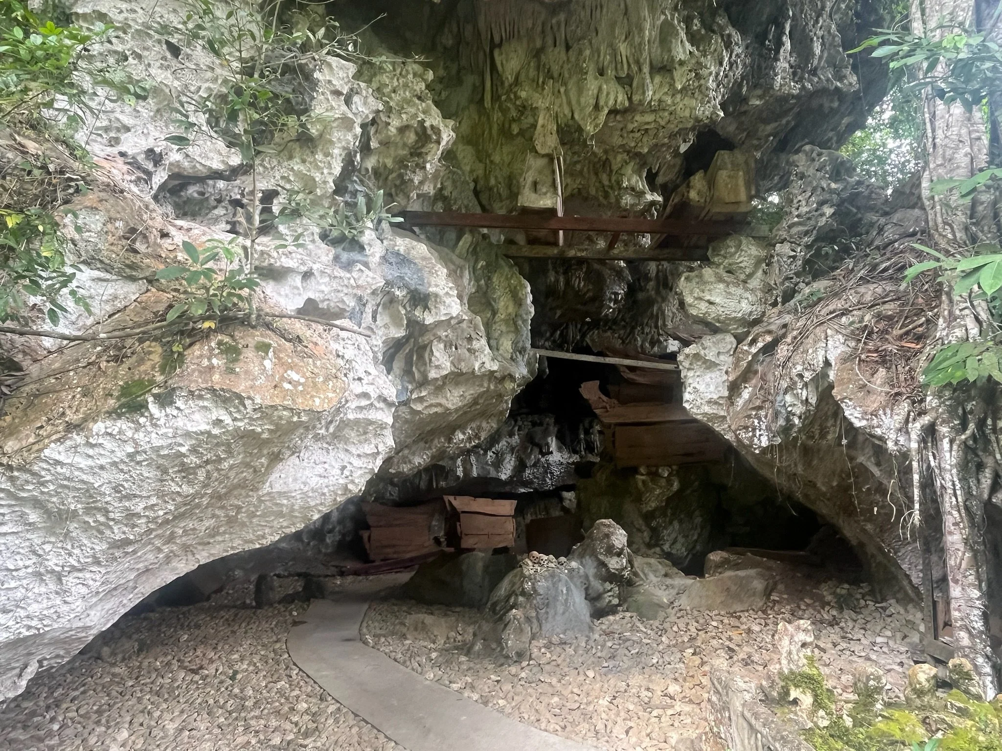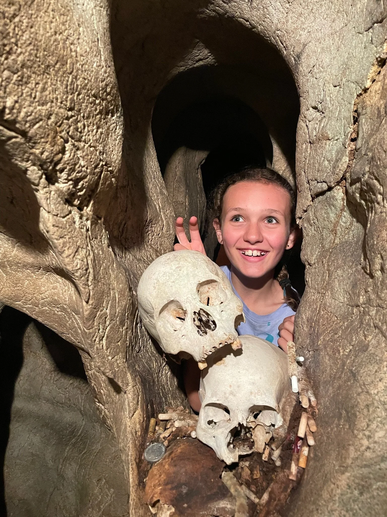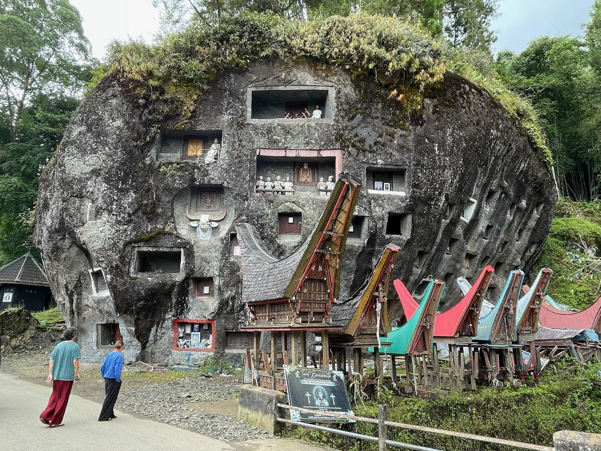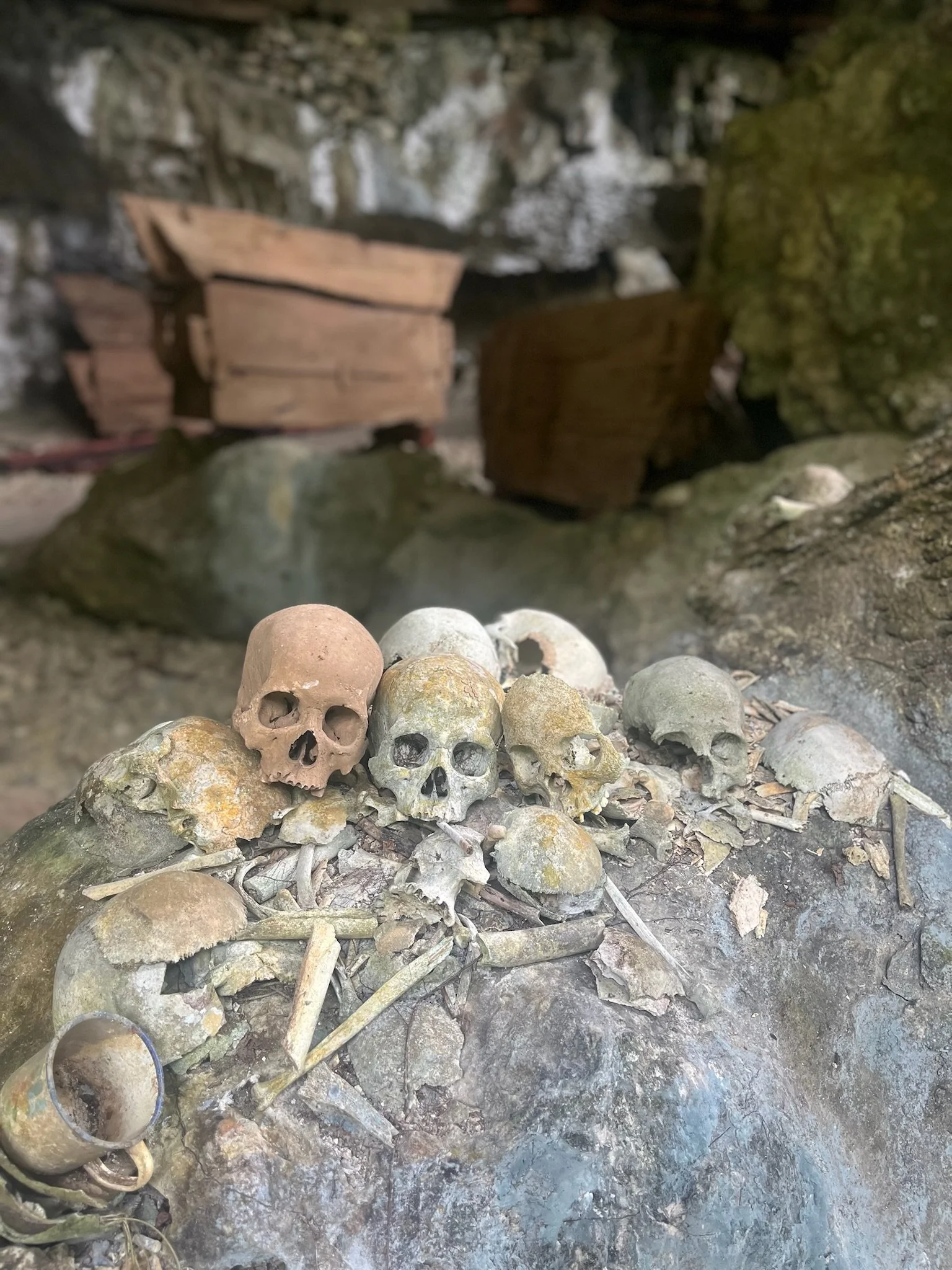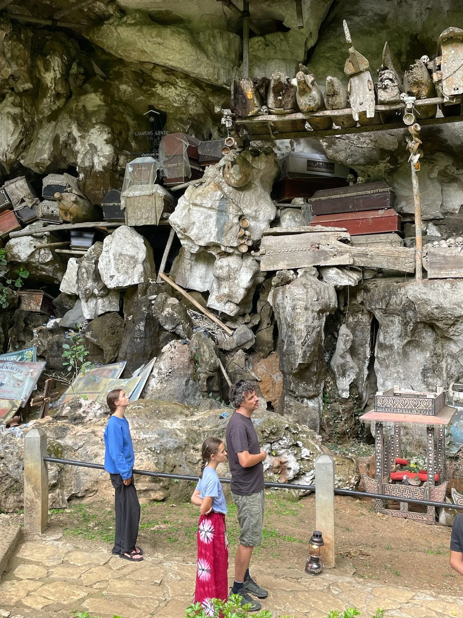 Omdat we in de buurt zijn, houden we op de terugweg nog halt bij Suaya - een koningsgraf - en Tampang Allo, een natuurlijke grot die dienst deed (en nog altijd doet) als grafkamer. Dit graf is ouder, de doodskisten zijn versleten, soms vermolmd en kapot, waardoor de botten en skeletten als het ware terug een eigen leven zijn gaan leiden en links en rechts bijeengepuzzeld liggen te slapen. Alsof je rondwandelt op het pirateneiland in een pretpark, alleen met échte skeletten en doodshoofden. Dat lijkt luguber, maar zo voelt het eigenlijk niet; na de aanval op de zintuigen tijdens de ceremonie hangt hier op een bepaalde manier een heel ingetogen sfeer. Sam en Robin zal het worst wezen, zij blijven hier aan de ingang zitten en hebben nu wel genoeg graven gezien. ‘s Avonds eten we bij gebrek aan andere opties nóg maar eens in Kaana Coffee, zeer tegen de zin van Robin, die vermoed dat ze daarvan ziek geworden is. Misschien had ze wel gelijk, want na deze avond heb ik het vlaggen. Of misschien waren het ook nu weer de blikken van de buffels, l’histoire se repète. Toraja is een bijzondere plek. Zó ver verwijderd van wat wij bij ons “normaal” noemen, maar als ik dit een week later in Darwin schrijf tussen een hoop obese bejaarden die zich tijdens een all inclusief breakfast te pletter fretten aan bacon en saucage, weet ik niet meer zeker of het zoveel beter is als je de varkens niét hoort en ziet. We gaan het niet romantiseren, maar de heel tastbare (en voor ons ongemakkelijke) connectie tussen dier en mens en leven en dood is echt een unieke ervaring.