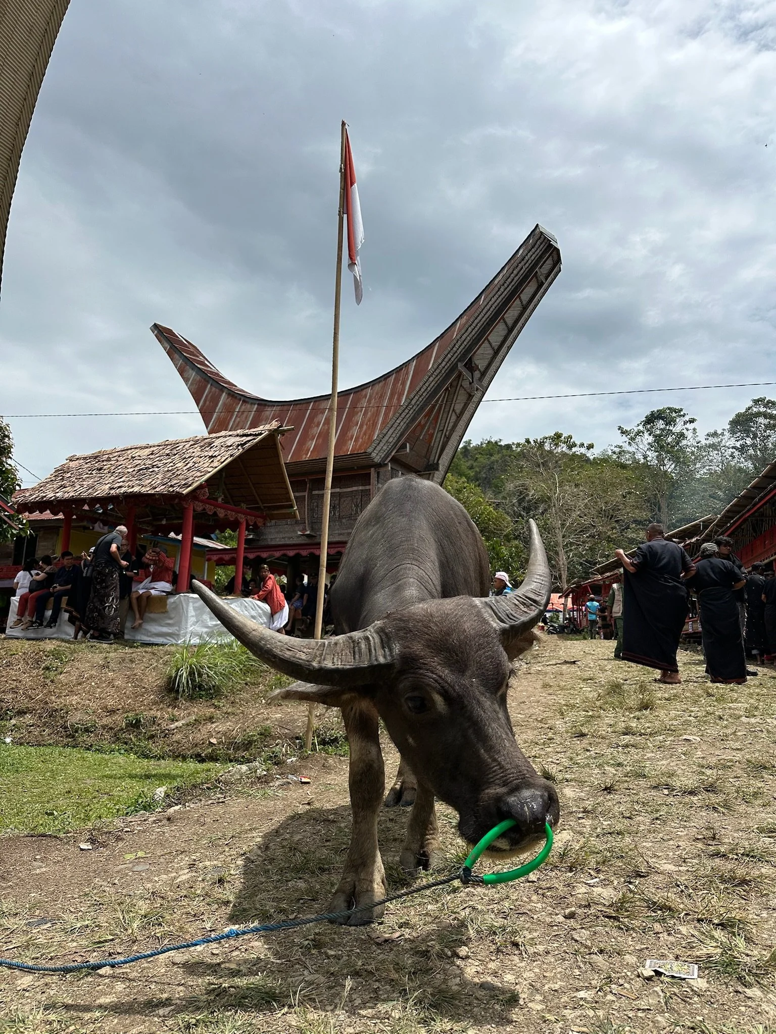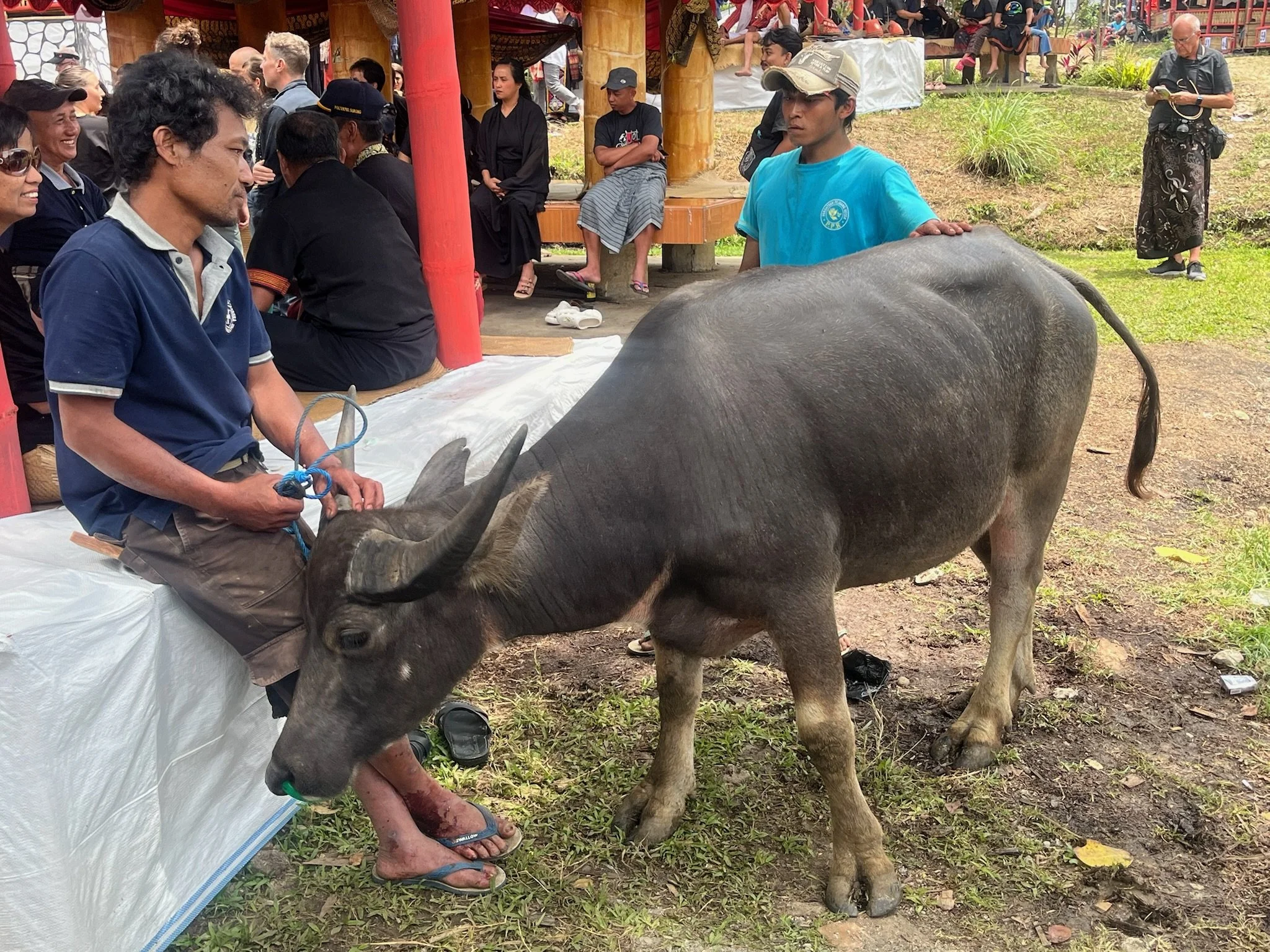 “Maybe they kill one buffalo today”, zegt Enos. We zien er twee staan tussen de mensen; ze lijken heel rustig, eentje vleit zich met z’n kop tegen z’n verzorger aan. “Or yes, maybe two.” Ok dan, Enos, thanks for the heads-off, ik bedoel heads-up. Nadat alle cadeaus overhandigd zijn en iedereen verwelkomd is, wordt de overledene in een prachtig versierde kist op de tweede verdieping van de tongkonan gezet. Vanaf beneden geven de mensen commentaar, ze lachen en sturen bij: beetje meer naar links, omgekeerd, nee, de kader met de foto staat niet waterpas, haha, zie ‘m daar hangen, rechts wat hoger, hoger, hoger, ja, prima! En plots, voor ik ‘t goed en wel besef, staat de buffel aan de centrale paal midden op ‘t plein. Ik zie iemand met een groot mes dichterbij stappen en ik draai instinctief m’n hoofd weg. Als ik terugkijk ligt het massieve beest al op de grond. Oef denk ik, dat ging relatief snel en pijnloos, maar als ik beter kijk merk ik dat de buffel nog een lange doodstrijd levert, terwijl de verzorger ondertussen al met het tweede, kleinere exemplaar komt aangewandeld. Het dier oogt heel rustig aan de hand van z’n baasje en pas nét voor het fatale moment lijk je een soort verschrikking en verwarring in de ogen te zien, alsof het ineens lijkt te beseffen: hola, vriend, wat zijn we van plan? Rondom rond staan toeristen met de hand voor hun mond te kijken, sommigen filmen en nemen foto’s, ik weet eigenlijk niet zo goed wat ik moet doen, maar probeer het toch ook vast te leggen, tegen beter weten in. Griet komt ook eens kijken en ook Sam is wel benieuwd. Robin is locked out en houdt zich in stilte bezig door op Griet haar gsm alle apps op een andere plaats te zetten. De locals blijven er heel rustig bij, geven commentaar over hoe sterk het dier wel is en steken nog een sigaret op. ‘t Is echt een surreëel tafereel. Eens ook de tweede buffel geofferd is, hebben we ‘t wel een beetje gehad. “Robin wil graag naar huis nu.” Dat treft, ik ook; Maaike, wir reinigen hier unseren Schaufel abf! Ze bezorgt ons als dank voor de lift nog een aantal prachtige foto’s (de close-up van de buffel hierboven) en een filmpje van het moment van de slachting, op verzoek te bekijken tijdens een bordje gemengd in Café Congé.