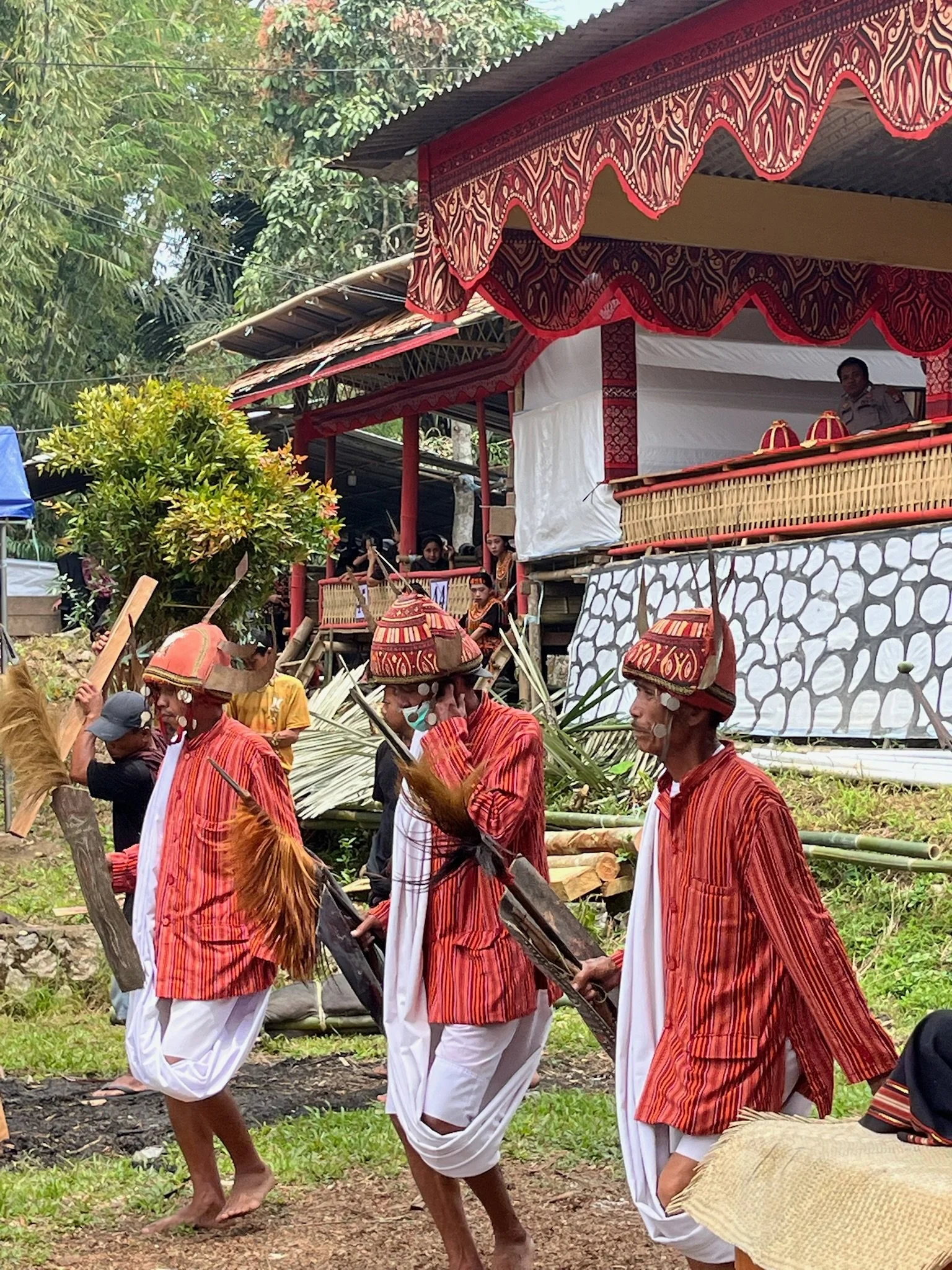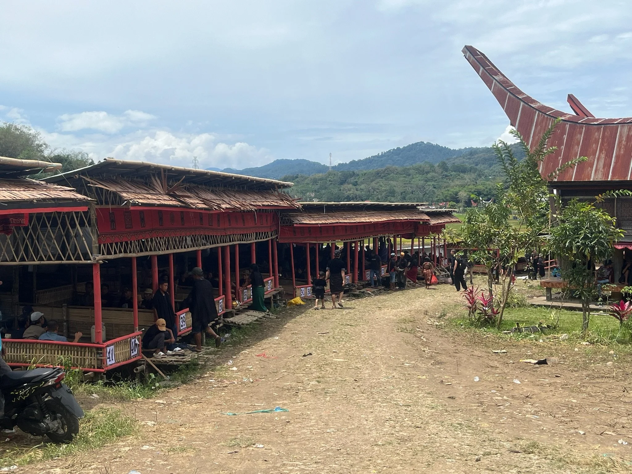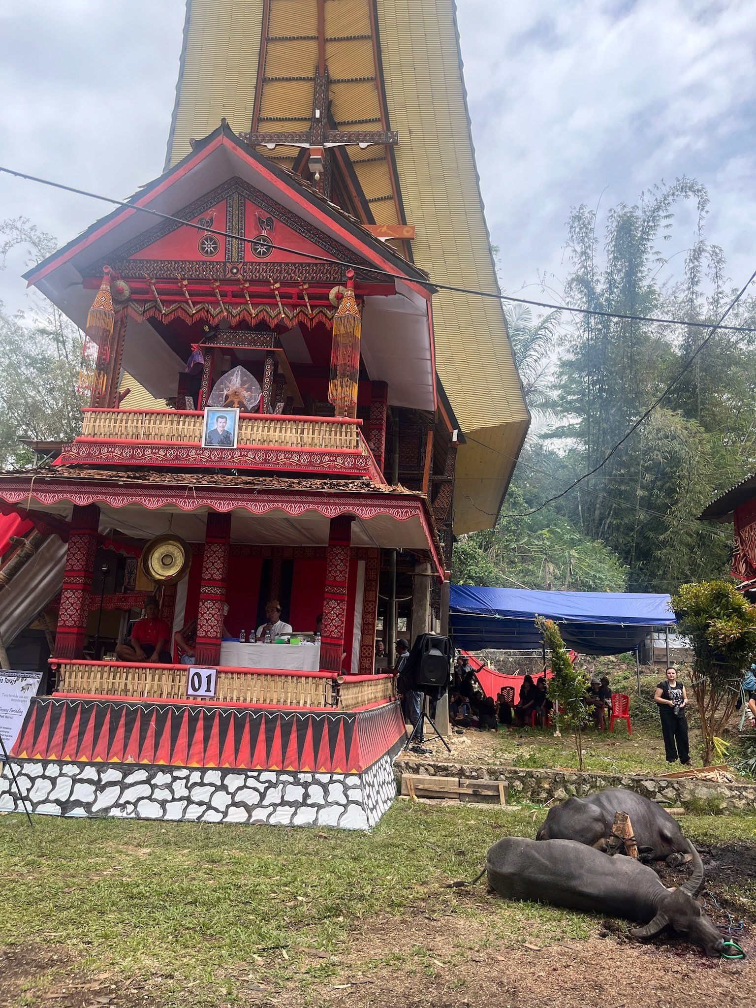De ceremonie gaat door in de Turunan-village, op een uurtje rijden van de homestay, gelukkig voor Robin niet via al te kronkelige bergbaantjes. Rond de tongkonan-huizen hebben ze uit bamboe tijdelijke stalletjes gebouwd, die allemaal een nummer gekregen hebben om aan te duiden waar familie, vrienden, vage kennissen, Belgen, verdwaalde Duitsers en andere toeristen mogen plaatsnemen. De vastgebonden en schreeuwende varkens liggen her en der verspreid. Griet moet er meteen van huilen, Robin gaat in survival-modus en sluit zich af voor het hele gebeuren. In ons stalletje komt de familie ons welkom heten en krijgen we koffie, thee en wat koekjes. Er is echt heel veel volk en ‘t begint me te dagen dat dit een beetje het equivalent is van een braderie bij ons. Er heerst allerminst een begrafenisstemming en ‘t is ook niet dat het allemaal heel sacraal verloopt. ‘t Gaat om verbinden, om mensen samenbrengen, eten, drinken, babbelen, lachen. Familie (en iets uitgebreider: dorp/clan) is het fundament in de Toraja-samenleving. Ergens is die collectieve gedachte natuurlijk heel mooi, maar dat wil ook zeggen dat er weinig plaats is voor individuele stemmen, vertelt Enos ons later: kinderen worden niet geacht (kritische) vragen te stellen of nieuwsgierig op onderzoek te gaan naar waar die tradities vandaan komen, wat de symboliek is of hoe ze evolueert. Ze leren het ook niet op school, het is wat het is, “don’t ask questions!”, zegt hij en hij gooit er het teken van een veeg rond de oren achteraan.