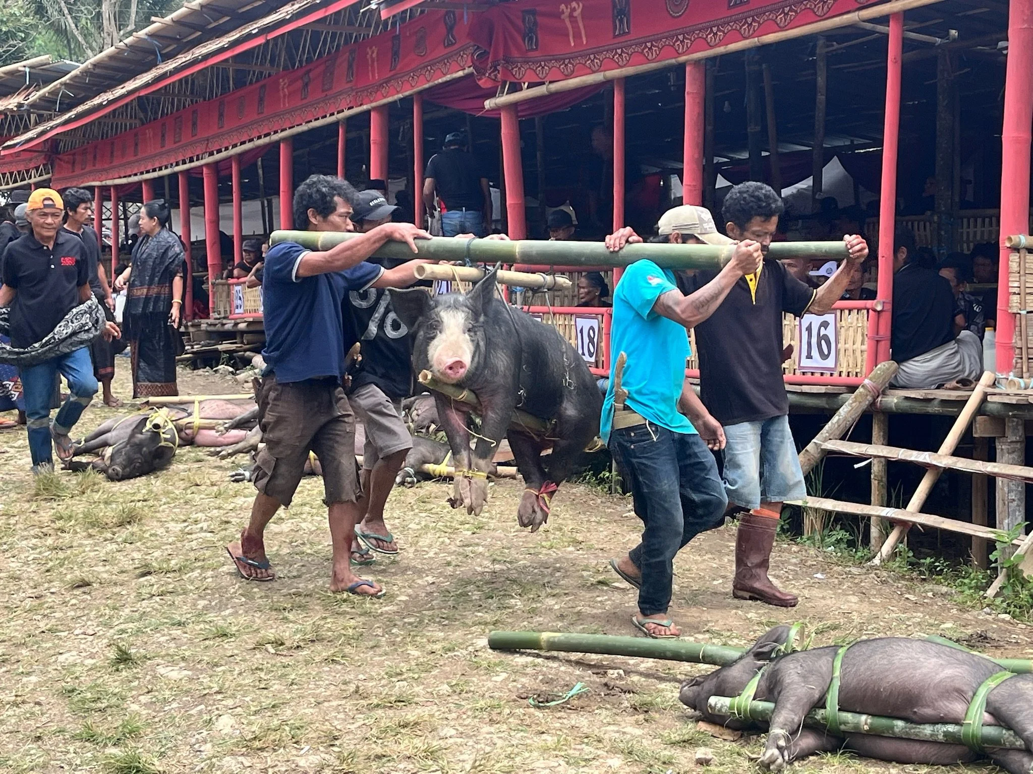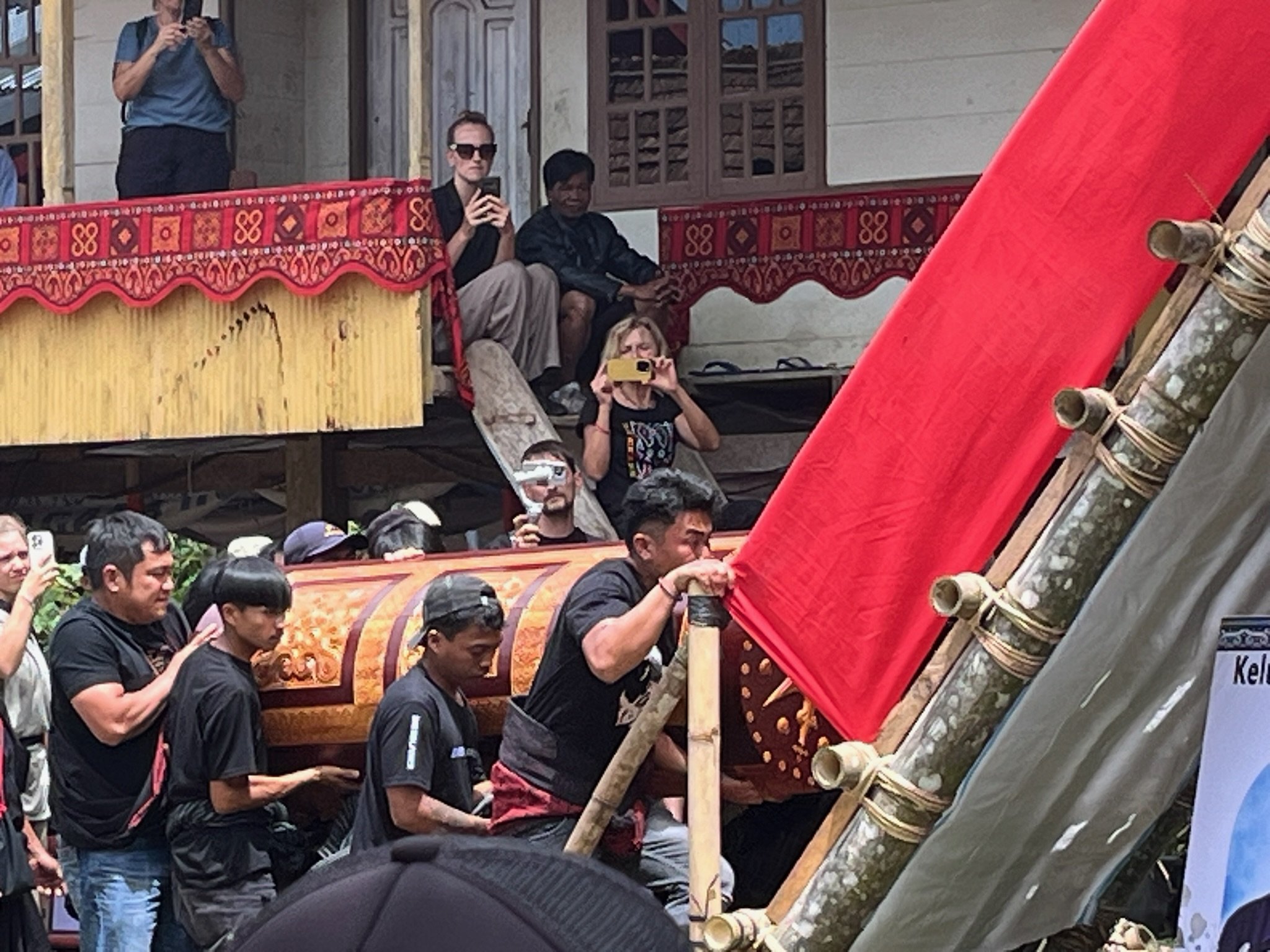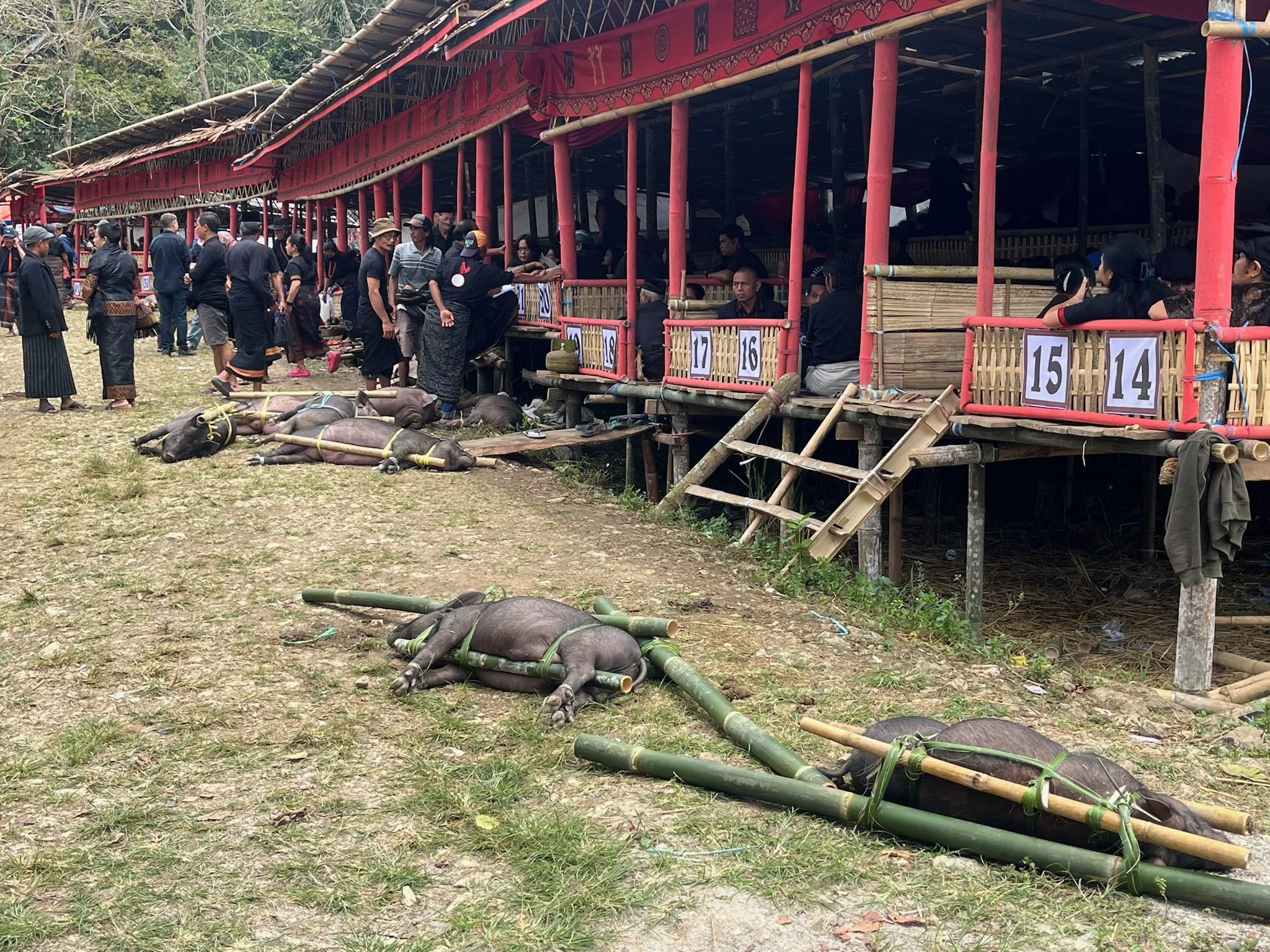 De ceremonie gaat door in de Turunan-village, op een uurtje rijden van de homestay, gelukkig voor Robin niet via al te kronkelige bergbaantjes. Rond de tongkonan-huizen hebben ze uit bamboe tijdelijke stalletjes gebouwd, die allemaal een nummer gekregen hebben om aan te duiden waar familie, vrienden, vage kennissen, Belgen, verdwaalde Duitsers en andere toeristen mogen plaatsnemen. De vastgebonden en schreeuwende varkens liggen her en der verspreid. Griet moet er meteen van huilen, Robin gaat in survival-modus en sluit zich af voor het hele gebeuren. In ons stalletje komt de familie ons welkom heten en krijgen we koffie, thee en wat koekjes. Er is echt heel veel volk en ‘t begint me te dagen dat dit een beetje het equivalent is van een braderie bij ons. Er heerst allerminst een begrafenisstemming en ‘t is ook niet dat het allemaal heel sacraal verloopt. ‘t Gaat om verbinden, om mensen samenbrengen, eten, drinken, babbelen, lachen. Familie (en iets uitgebreider: dorp/clan) is het fundament in de Toraja-samenleving. Ergens is die collectieve gedachte natuurlijk heel mooi, maar dat wil ook zeggen dat er weinig plaats is voor individuele stemmen, vertelt Enos ons later: kinderen worden niet geacht (kritische) vragen te stellen of nieuwsgierig op onderzoek te gaan naar waar die tradities vandaan komen, wat de symboliek is of hoe ze evolueert. Ze leren het ook niet op school, het is wat het is, “don’t ask questions!”, zegt hij en hij gooit er het teken van een veeg rond de oren achteraan.