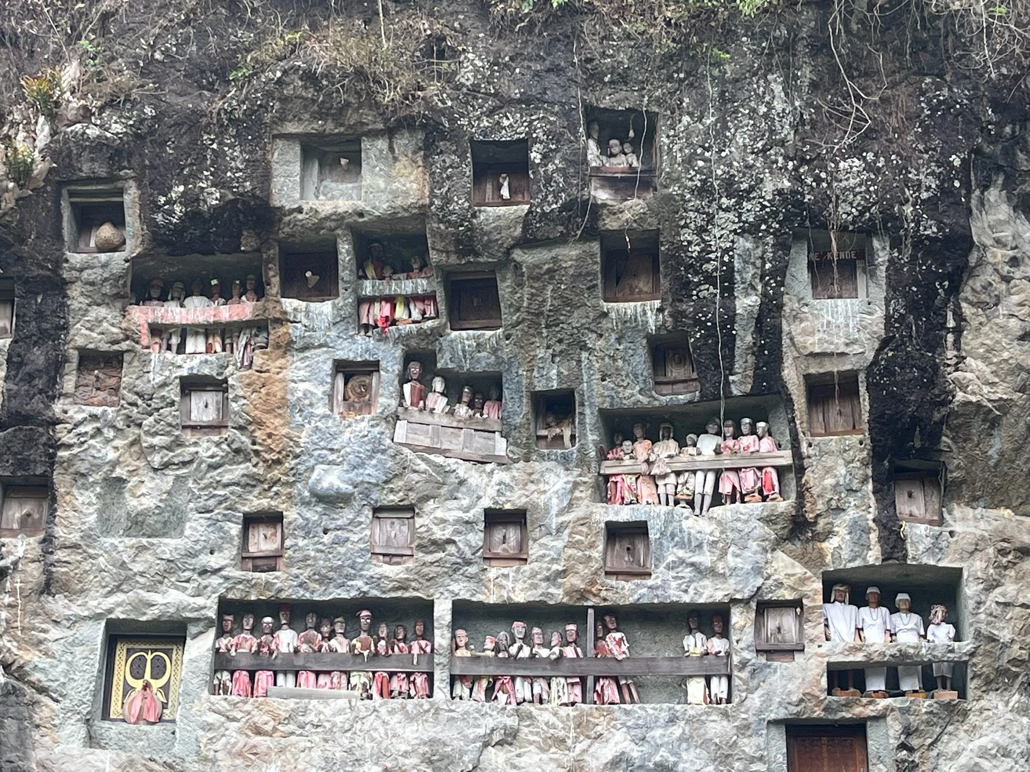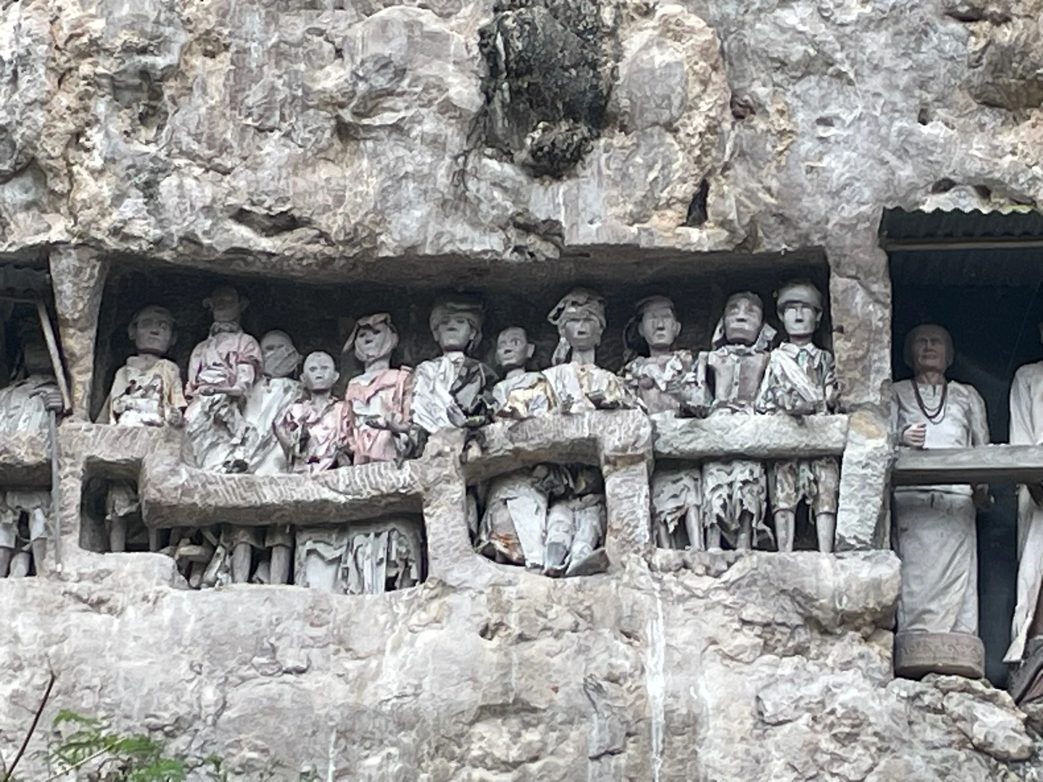 We eten iets met een prachtig uitzicht over de valei met rijstterrassen en villages en rijden verder de bergen in, met een stop bij de stenen grafheuvel Loko Mata. Eens de ceremonie voorbij is worden de doden begraven in de rotsen. De grafkamers worden met de hand uitgehouwen in de massieve stenen en voorzien van deurtjes met een slotje erop en soms een portretfoto van de bewoner. Families die “complete ceremony” gedaan hebben mogen de overledene eren met een tau tau, een houten standbeeld. “But ONLY when complete ceremony!”, dus wees maar zeker dat de buffalo’s geturfd worden. ‘t Is een bijzonder zicht, die houten popjes op een rijtje die je vanop hun tribune in de rotsen vanuit het hiernamaals aanstaren. De recentere tau tau’s zijn op basis van foto’s nogal kitscherig gemodelleerd naar hun ooit levend evenbeeld, de oudere (en mooiere) zijn gewoon houten mannetjes of vrouwtjes. Er staat geen naam bij en ook geen datum; ze worden samen gezet per familie of clan, maar de achterkleinkinderen hebben geen idee meer wie de overgrootmoeder was. Aan conservatie doen ze niet. Onderaan de rotsen is het ook een grote rommelboel. ‘t Ligt er vol met pancartes met scheve lettertypes en vage foto’s van de doden, die ooit als een soort reclameborden werden meegedragen naar de graven en daar dan werden gedumpt, samen met de houten gondels waarin de kisten werden vervoerd, sigaretten, kleren, plastic waterflesjes en andere “offers”. Zo ongeveer om de 3 jaar worden de doden ook naar buiten gehaald en krijgt de mummie nieuwe kleren. Zo’n ceremonie heet een manene en ook die kan je live bijwonen als je wil, maar iets dat je uitspreekt als “ma nee nee”, dat slaan wij vriendelijk over.