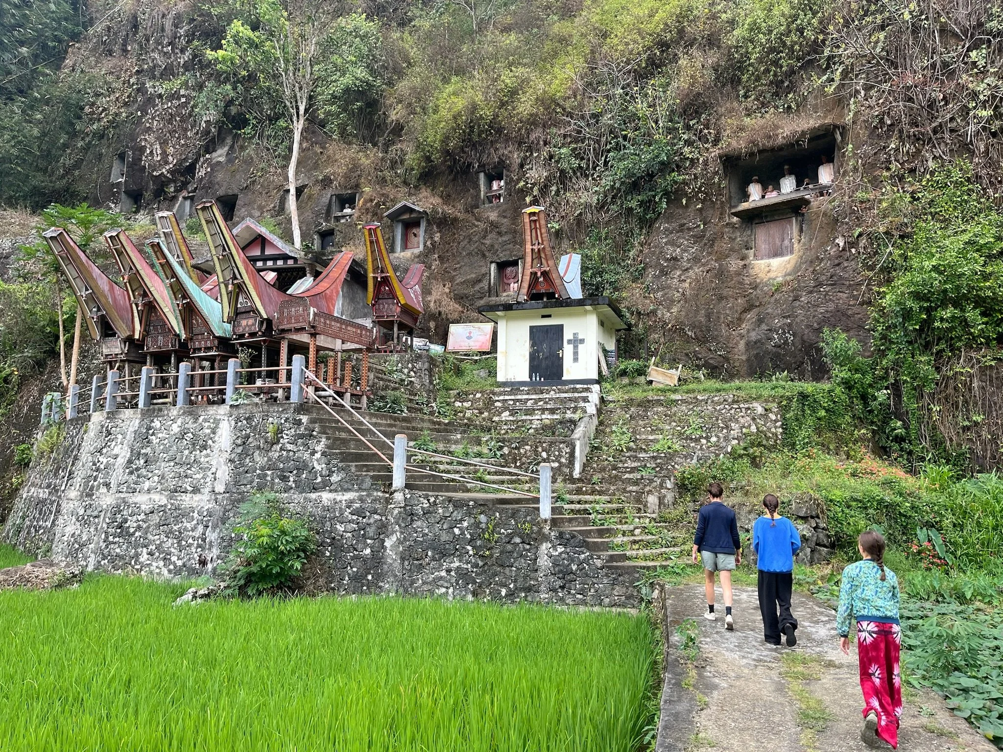 We rijden terug naar de homestay langs verschillende rante’s. Dat zijn Stonehenge-achtige cirkels van grote, soms wel 3 tot 4 meter hoge megalieten, ook ter nagedachtenis van de overledene. Vroeger werd hier naast de grote begrafenisceremonie soms nog een tweede ceremonie gehouden, maar dat vindt de kerk tegenwoordig niet meer zo tof. Ik vraag Enos of de Toraja ook echt gelovig zijn, of ze christendom enkel pro forma hebben aangekruist bij de volkstelling, maar hij verzekert me: “oh yes, church on sunday is quiet full”. En in de zondagsmis heeft mijnheer pastoor dus blijkbaar laten weten dat massaal buffels en varkens slachten allemaal goed en wel is, maar ritueel rond wat stenen dansen: dat gaan we niet meer doen he, vrienden. Gods wegen zijn ondoorgrondelijk. We verzetten onze zinnen wat door in de namiddag een beetje te homeschoolen en ‘s avonds nog eens te gaan eten bij Kaana Coffee. De spaghetti valt daar deze keer bij 1 gezinslid wat minder in de smaak (of ‘t waren toch de blikken van de buffels) en Robin mag zich officieel de eerste zieke van deze reis noemen. Alsof dat nog niet genoeg zum kotzen is, hebben haar knettergekke ouders de dag erop ook nog eens uitgekozen om zo’n begrafenisceremonie bij te wonen.