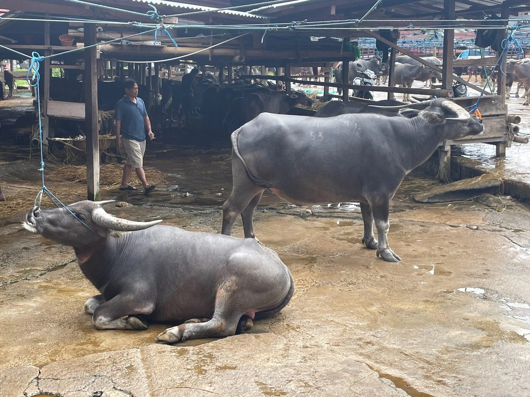 We zien ze met tientallen staan op de traditionele Bolu-markt, vastgehaakt met een neusring, in alle maten en vormen, sommige met blauwe ogen. “Blue eyes is more worth!”, zegt Enos, om vervolgens bij elke “buffalo” de prijs te duiden. “This one is like Lamborghini, 200 million rupiah’s!” Omgerekend €100.000. Als je bedenkt dat ze hier maandelijks gemiddeld tussen de €200 en €300 verdienen doet dat de wenkbrauwen fronsen, maar hij meent het: in Toraja meet je status aan de hand van de hoeveelheid buffalo’s die worden geofferd tijdens een ceremonie. Sinds de Nederlanders hier het klassensysteem hebben afgeschaft, zijn ceremonies niet langer exclusief voor de adel en kan ook Toraja-met-de-pet meedoen. Die wil uiteraard graag laten zien dat hij goed boert, daar in het verre Papoea. “Complete ceremony is minimum 24 buffalo’s”, legt Enos uit. Met geloof heeft dat niet veel meer te maken, ‘t gaat grotendeels om aanzien. De dode zelf heeft ook weinig in de pap te brokken. Opa wordt niet gevraagd of hij dat allemaal een goed idee vindt, of hij recent een lidkaart van GAIA heeft aangeschaft en welke liedjes er op zijn komende ceremonie moeten worden gespeeld. ‘t Zijn de nabestaanden die alles voorbereiden, de buffels kopen (“Big family is more childeren, so more buffalo!”) en de uitnodigingen versturen. De buffels op de markt staan hier soms wel een maand te koop, dus ‘t is niet dat ze tussendoor naar de wei mogen gaan grazen. Ze hangen vast met een ring in de neus, zodat ze hun hoofd rechtop moeten houden en sterkere nekspieren krijgen (ook dat vergroot hun waarde). Geen idee wat ze ervan denken; hun blik - “waddist, heb ik iets van u aan?” - verraadt weinig, maar comfortabel ziet het er niet uit. ‘t Zijn echter vooral de varkens die op de dierenwelzijn-gevoelens werken.