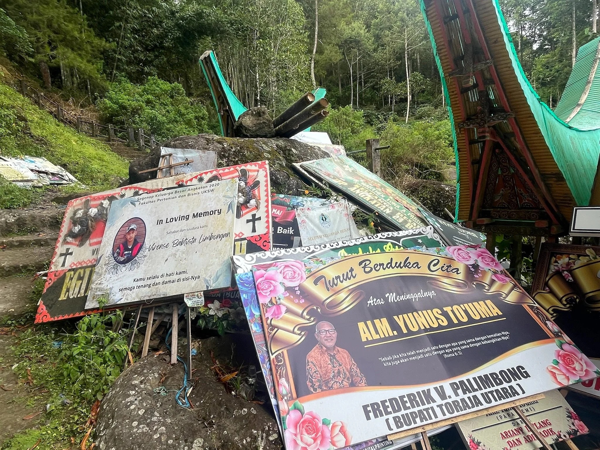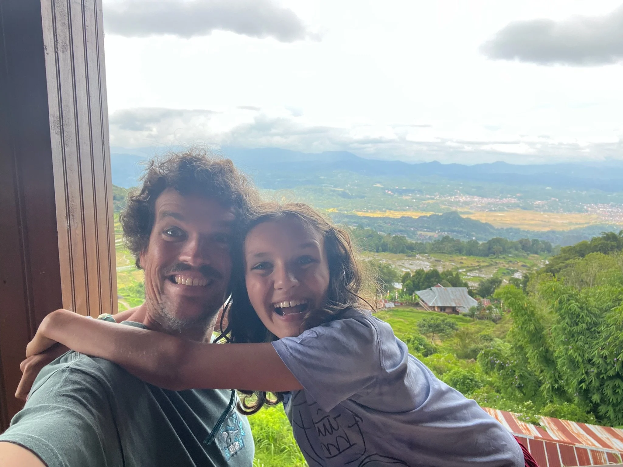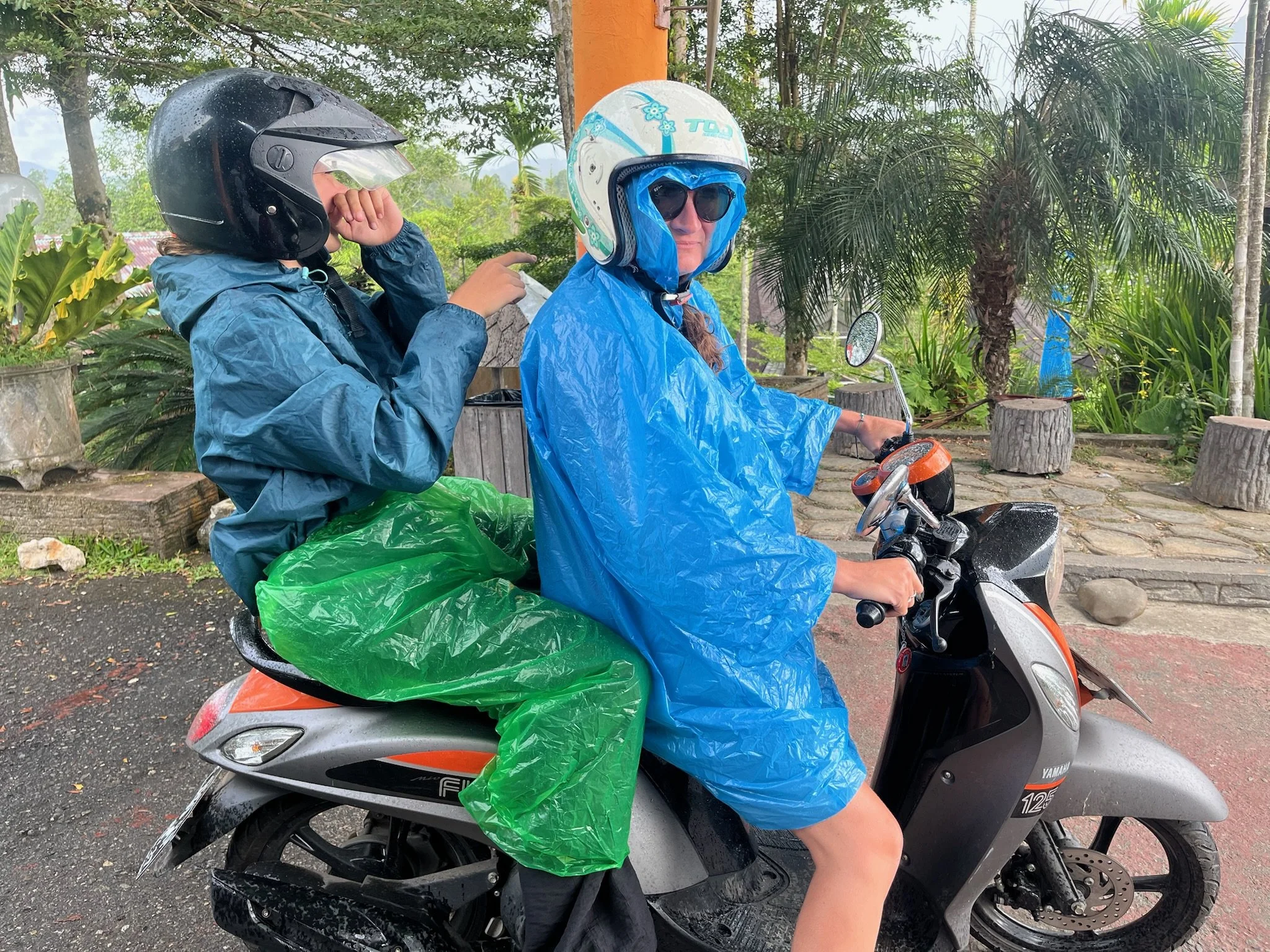 We sluiten Toraja af met een brommertochtje langs de 3 laatste graftombes, Lemo, Londa en Kete Kesu. ‘t Is een druilerige dag, maar we vinden in het zadel van de brommer uit-ste-ken-de waterbestendige, fotogenieke regenkledij. In Lemo wandelen we door tot achter de grafheuvel en belanden daar in een winkeltje waar tau tau’s worden gemaakt. We zien er eentje waar we onmiddellijk allebei helemaal weg van zijn en besluiten - tot groot onbegrip van Sam en Robin - het houten mannetje van om en bij de 40cm en een kilo of 8 als derde kind mee te zeulen in onze Nike-tas. ‘s Middag eten we in het Toraja Heritage, een hotel dat eigenhandig het begrip “vergane glorie” herdefinieert. Een gigantische plek met minstens 100 kamers, slechts 2 verdwaalde Portugezen als gast, een zwembad met stilstaand water, maar wel alles op de menukaart beschikbaar, zelfs - Robin kan haar ogen niet geloven - pasta pesto! Al is die helaas (weerom) niet om over naar huis te schrijven. Dat eten hier in Sulawesi, ‘t is behalve in Bunaken een - komt ie - beproeving geweest. We eten uiteraard vooral mie en nasi goreng, maar elke poging om eens van de standaard Indonesische keuken af te wijken, mislukt spectaculair. Op aanraden van Enos gaan we voor ons laatste avondmaal naar Aras 2 (de halal-versie van Aras 1), “because they have pizza!” Na heeeel lang wachten krijgen we een vel veel te kort gebakken deeg op een houten plank met als topping een gigantische hoeveelheid gesmolten kaas, kort gebakken ajuintjes en ranzige rode pepers. Gelukkig verkopen ze er ook juwelen (because why not), dus Sam wandelt er toch heel blij buiten met een pre-verjaardagsring. Morgen is het 27 augustus en wordt ze 14, tijd om Toraja achter ons te laten en een ceremonie te houden om het leven te vieren. Hoera!