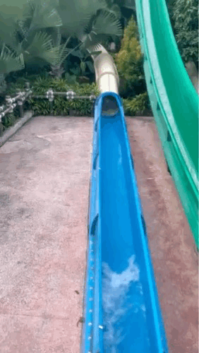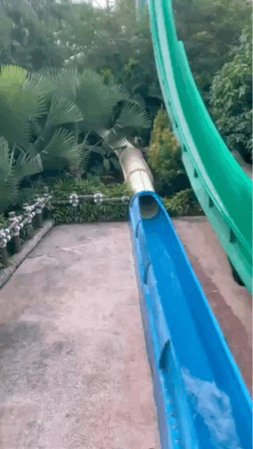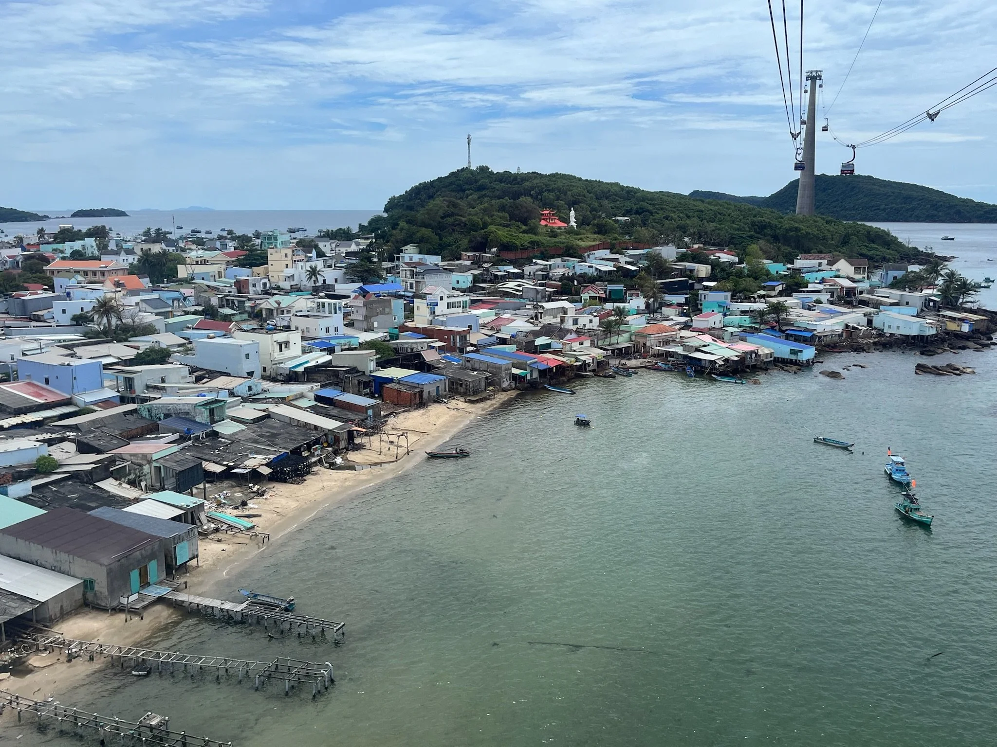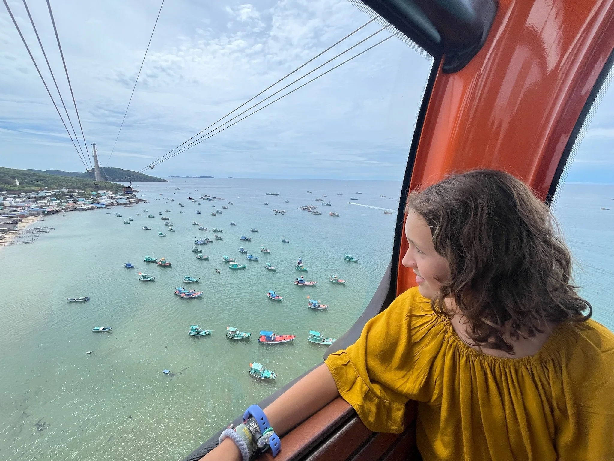 De kabelbaan brengt ons in 20 minuutjes 8 kilometer verder langs een pyloon of 9 die elk ongeveer 175 meter boven de zee staan. We gaan daar niet flauw over doen: het hele gezin knijpt z’n billen dicht als de gondel zo’n pyloon passeert en extra vaart krijgt vlak voor de volgende bergaf. Het zicht is wel ongelofelijk: de azuurblauwe zee en de vissersbootjes zien er prachtig uit, de quasi sloppenwijk vlak naast Italië laat vooral zien dat het in de communistische versie van het kapitalisme niet voor iedereen Sunsettown is. We komen uit bij Hon Thom, een klein eilandje ten zuiden van Phu Quoc, waar ook weer gigantische projecten met Griekse huisjes in de steigers staan, een half afgewerkte houten rollercoaster en een volledig afgewerkt Aquatopia. We kopen een plastic hoesje om de gsm in te steken, zodat we stijlvol al vloggend door het waterpark kunnen paraderen, alleen maar om erachter te komen dat we’m op geen enkele attractie mogen meenemen. Laat het ons dus houden op het feit dat er naast veel Indiërs, Chinezen en Russen ook echt veel glijbanen zijn, dat ze hoog zijn, geel, groen of blauw, wreed plezant, lekker snel gaan, met rubberbanden of matjes, en dat ik het na 12 attracties gehad heb, de kinderen na 14 en Griet na 9, waarschijnlijk door het vooruitzicht dat ze straks die fucking kabelbaan nog moet terugnemen ook.