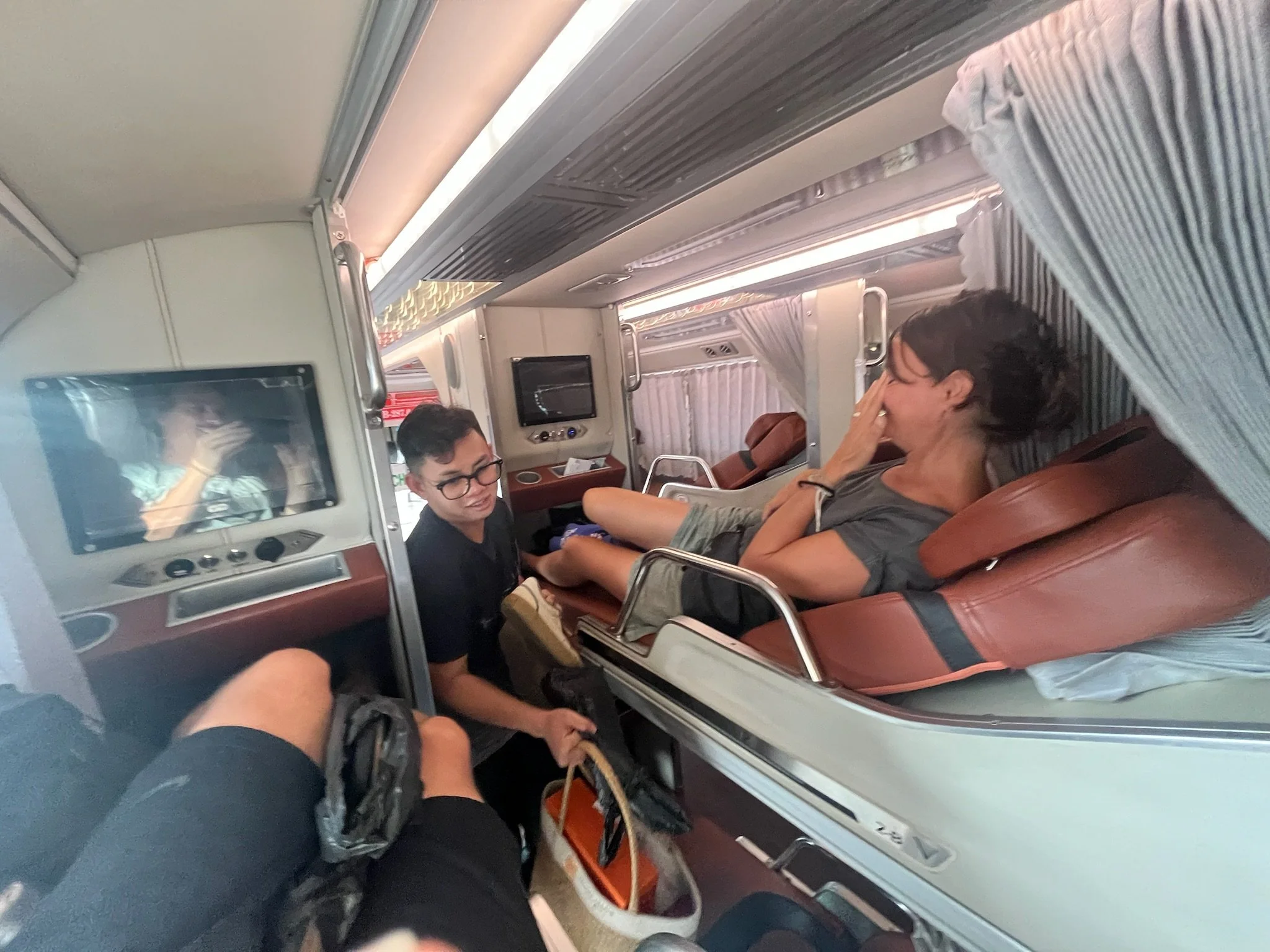 Ik had er nochtans over gelezen in m’n trouwe vriend, Lonely Planet, die het ook wel eens mis heeft, maar hier toch al weinig subtiel waarschuwde dat “impressive megaprojects are now transforming the north and south of this once relatively low-key area.” Anderzijds is het nu wel nog altijd “glitzy, energetic and family friendly” en dat spreekt ons stiekem ook wel aan na de backwaters en grootsteden in de Mekong-delta. Glitzy, ik wist niet eens dat het een woord was, maar we besluiten ervoor te gaan. Ten slotte is ‘t ook herfstvakantie in België, alle glitzy’s nog aan toe. Boeken die handel! We nemen een FutaBus die in zes uur van Can Tho naar de havenstad Rach Gia rijdt. Hoewel we dat overdag doen, is het een sleeperbus, waar we dus comfortabel - nouja - gestapeld liggen in zetelbedjes, boven mekaar, in 3 kolommen, met twee gangpadjes die net breed genoeg zijn voor een soort zijwaartse bijtrekpas. De bedjes zijn ook niet rechtop te zetten, dus slapen is verplicht. Robin vindt het geweldig, doet de gordijntjes dicht en wil deze bus ook absoluut eens nemen als échte nachtbus. Hoe dat verloopt lees je in Griet haar volgend verslag, ten minste, als haar boek uit is en ze de plaats de moeite waard vindt.