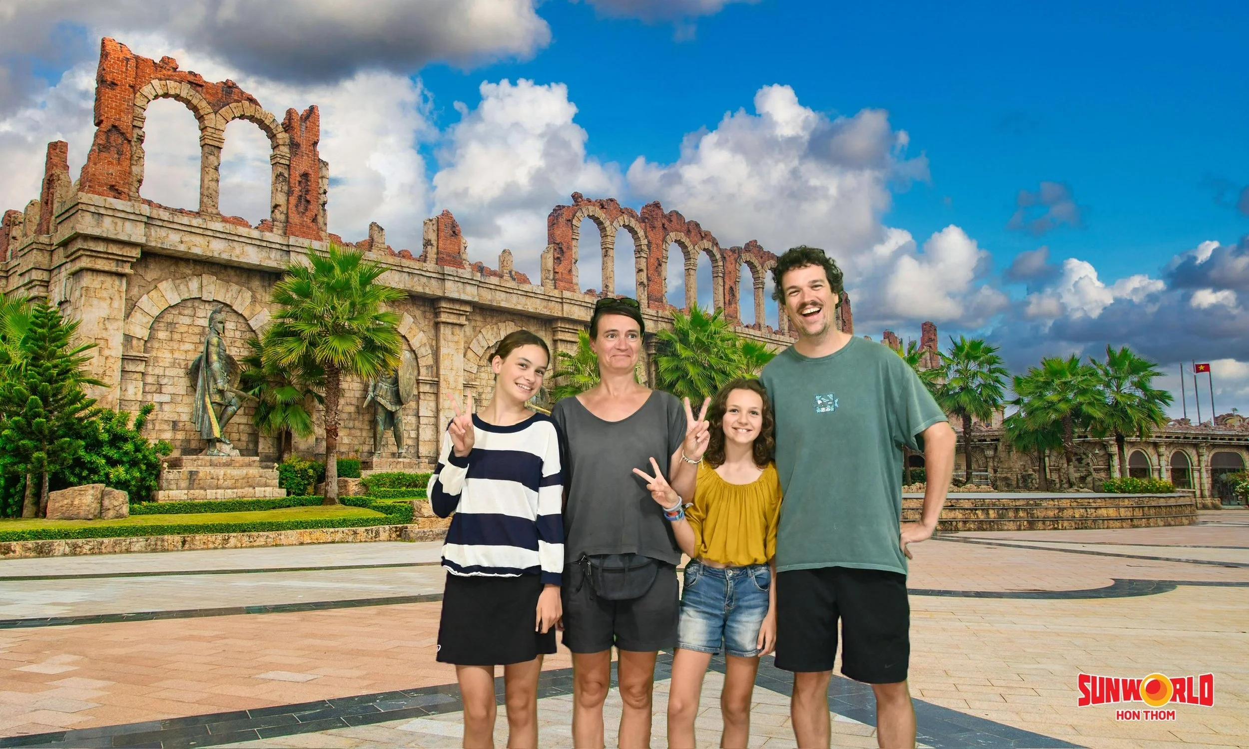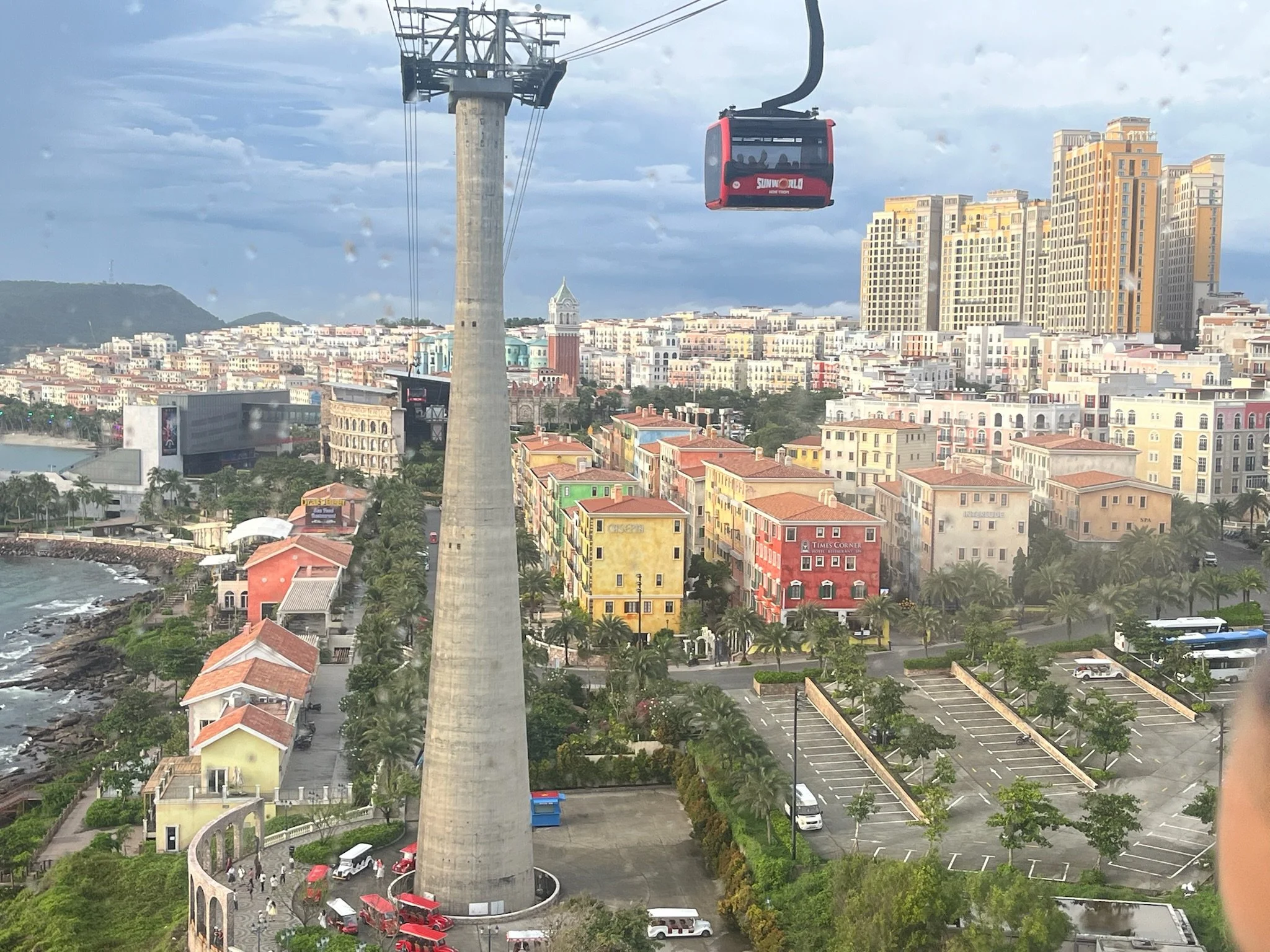 Je kan in Phu Quoc een brommertochtje doen naar het noorden, omdat het daar nog wat ongerepter en authentieker is, maar waarom zou je voor ongerept en authentiek gaan als ze in het zuiden de langste kabelbaan ter wereld hebben gebouwd, die dan ook nog eens uitkomt bij een waterpark? Sam en Robin laten er alvast geen enkele twijfel over bestaan. Griet heeft kabelbanofobie, maar gaat die op een rationele manier te lijf door de avond op voorhand alles op te zoeken over het vervoersmiddel in kwestie: bouwjaar, ophangsysteem, lengte, hoogte en nooduitgangen (helaas: geen). De brommertocht naar het zuiden duurt ongeveer een uur en Het Eiland Van De Verdwenen Charme doet z’n naam eer aan: te grote tweevaksbanen, grotendeels door niemandsland, vaak via megalomane resorts in aanbouw en dan soms plots langs chaotische en veel te drukke stadjes die de groeispurt niet kunnen bijbenen. Land speculation blijkt hier een ding te zijn en dat wordt in het zuiden pas helemaal duidelijk, wanneer we de laatste 3 kilometer echt door een totaal absurde remake van Italië rijden. Sunsettown heet het hier, met ronkende straatnamen als Duong Milan en Duong Amalfi en een remake van de klokkentoren van Venetië. In werkelijkheid is het een spookdorp waar zo goed als alles leegstaat. “Denk je dat het hier op dit eiland over 10 jaar veel drukker gaat zijn of net helemaal leeg?”, vraagt Robin. Ik zou het oprecht niet weten. Meer dan de helft oogt verlaten of is vaak maar half afgewerkt, met een blitse toegangspoort en daarachter niet meer dan enkele betonnen funderingen. Op andere plaatsen bouwen ze ondertussen maar voort, alsof Vietnamees Italië maar een probeersel was en Griekenland de nieuwe place to be wordt. Bizar. We parkeren onze brommers aan de ingang van de kabelbaan, onderaan het Colosseum (I kid you not). Voor we de lift op mogen, worden we eerst nog - als enige - uit de rij geplukt om een foto te nemen voor een greenscreen. ‘t Mag duidelijk wezen: dit zijn de meest fotogenieke mensen van de dag.