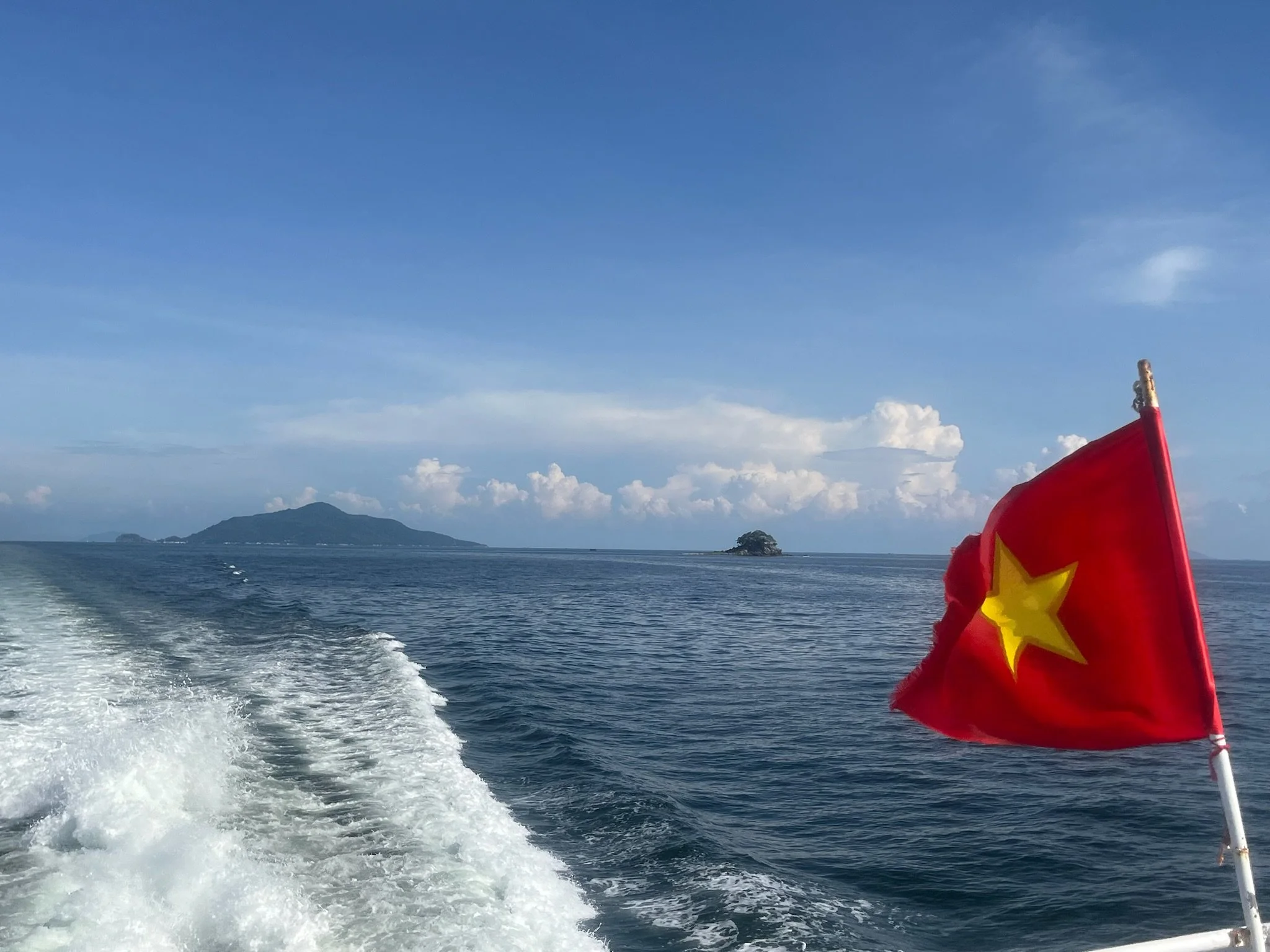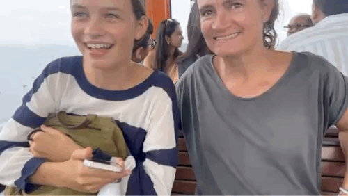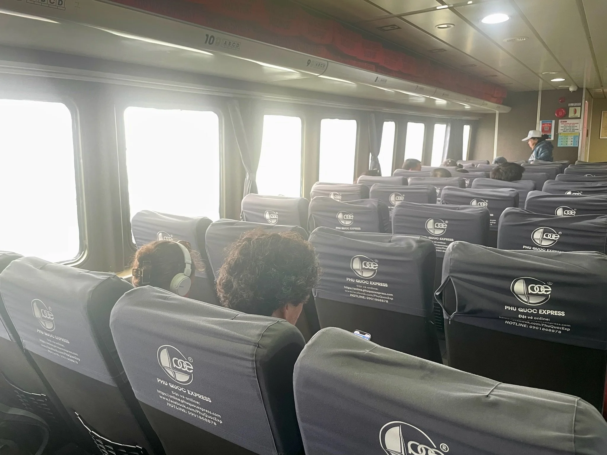 In Rach Gia vertrekt de ferry naar Phu Quoc. We zijn er een uurtje op voorhand, dus we eten nog snel een noedelsoepje in een kraampje, maar het volk stroomt toe, dus we besluiten om ook maar aan te sluiten in de rij, of wat daarvoor moet doorgaan. Aziatischer wordt het niet. Aan de linkerkant moet een doorgang worden vrijgelaten voor de mensen die uitstappen, maar daar trekt de meerderheid zich niets van aan. Behalve personen worden er ook een hele hoop kartonnen dozen, valiezen en een stuk of 40 scooters uitgeladen, waar mensen ook meteen op beginnen te rijden, slalommend en toeterend door de rij met wachtenden. En dat allemaal onder een blakende zon en een graad of 38. Wanneer we eindelijk mogen instappen, moeten we eerst nog langs twee Vietnamese uniformen voor een paspoortcontrole, maar vier brave Belgen blijken gelukkig geen probleem. Op de boot is het al even chaotisch. De bagage wordt vooraan allemaal op een hoop gegooid en nog voor de deur goed en wel dicht is, zwiert de kapitein de motor in gang en weg zijn we. We tellen de reddingsvesten boven ons en zoeken de nooduitgangen, maar veel geruster worden we daar niet van in deze licht claustrofobische ruimte vol met rochelende en hoestende Vietnamezen (en ondertussen maar mondmaskers dragen). Griet besluit boven op het dek te gaan zitten en we proberen de kinderen nog even te overtuigen om dat ook te doen, maar die zijn al lang blij dat ze een stoel hebben en een film mogen kijken. Gelukkig is het prachtig weer en verloopt de overtocht verder even rimpelloos als de zee.