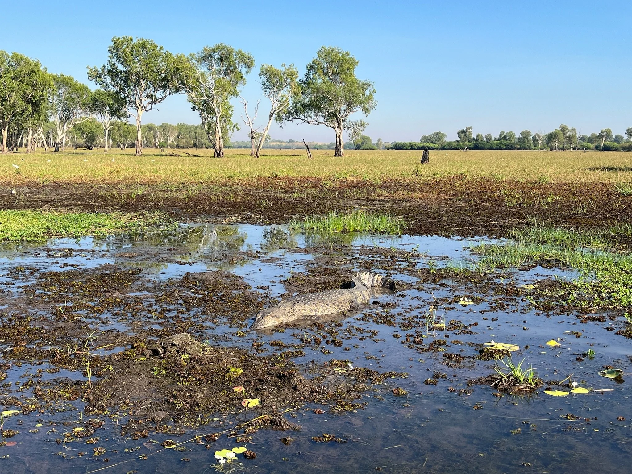 Door de extra dag Litchfield proberen we zoveel mogelijk van Kakadu te zien op 1 dag tijd. De spectaculairste watervallen zijn enkel toegankelijk met een 4x4, dus die water-vallen sowieso af (danku). Maar Cooinda ligt vlakbij de Alligator River (hoewel hier nergens alligators zitten) en daar kan je de Yellow Water Cruise doen, doorheen de billabong, zoals ze dat hier noemen, het drasland, soit, de plaatselijke Bourgoyen. “Het is redelijk prijzig, maar we zijn hier nu toch” is een zin die we ons over een aantal weken gaan beklagen, maar goed, we waren hier nu toch. De boottocht is echt fantastisch. Al na 200 meter spotten we een zonnende salty, een zoutwaterkrokodil (die zich dus ook in zoetwater thuisvoelt). De salty’s zijn de grootste en gevaarlijkste dieren (ze hebben de freshy’s hier ook volledig weggeconcurreerd; die zien we nergens) en Griet omschrijft ze dan ook treffend als “echt voze beesten”. ‘t Wordt al snel duidelijk dat we genoeg foto’s gaan kunnen nemen, want die krokodillen liggen en zwemmen hier echt overal, de grootste tot wel 6m lang. ‘T Is absurd om dat gewoon in het wild te zien en zelfs al zien we geen spectaculaire actiescènes (ze laten de dieren gewoon met rust, ‘t is geen jumping croc tourist trap), toch gaat er de hele tijd een soort zotte dreiging van uit.