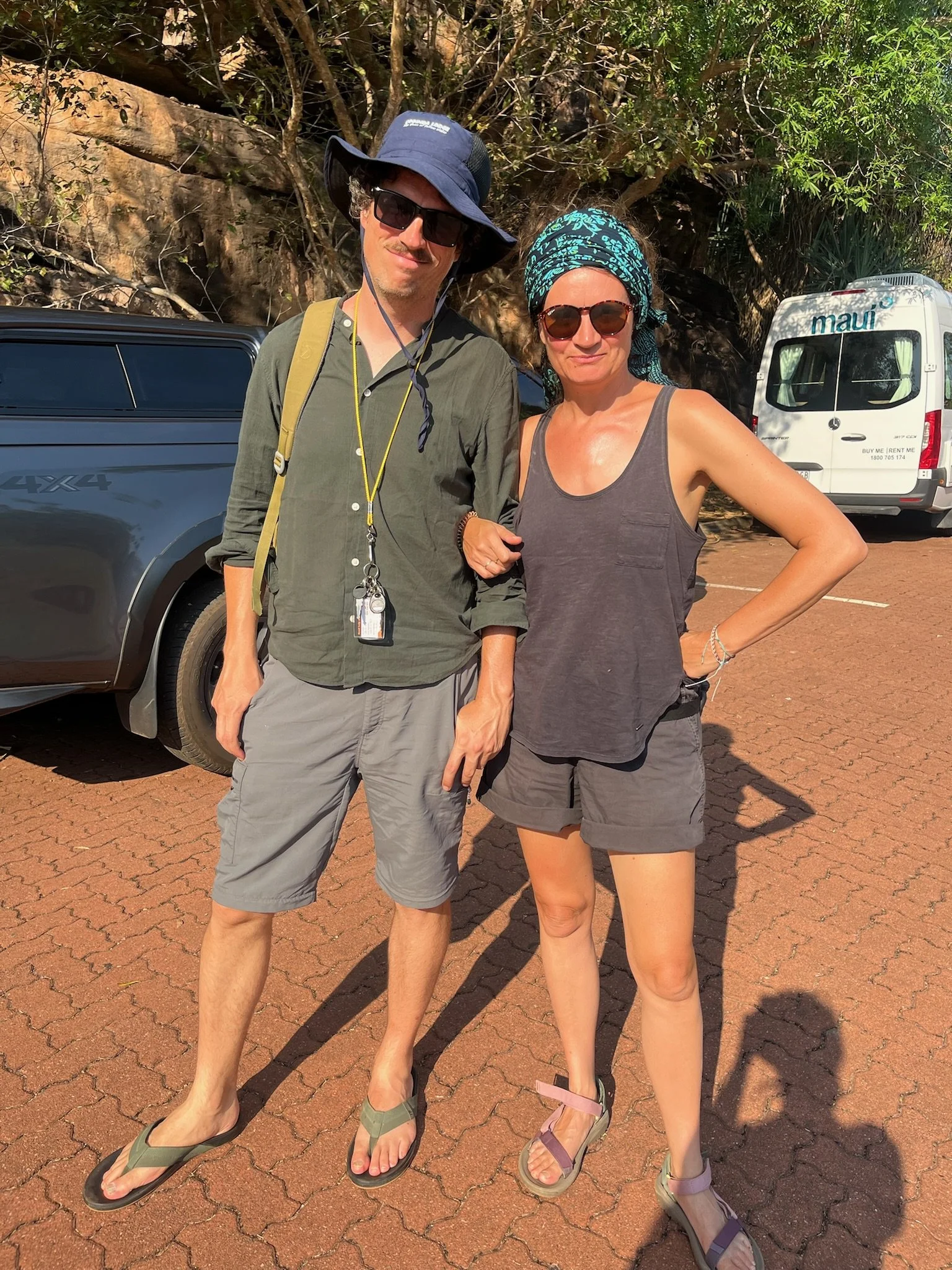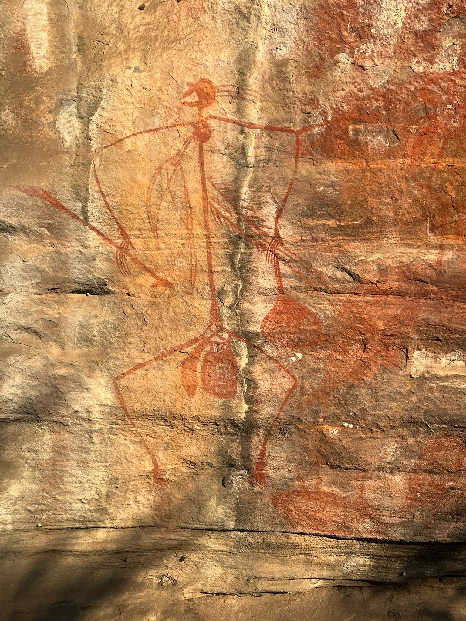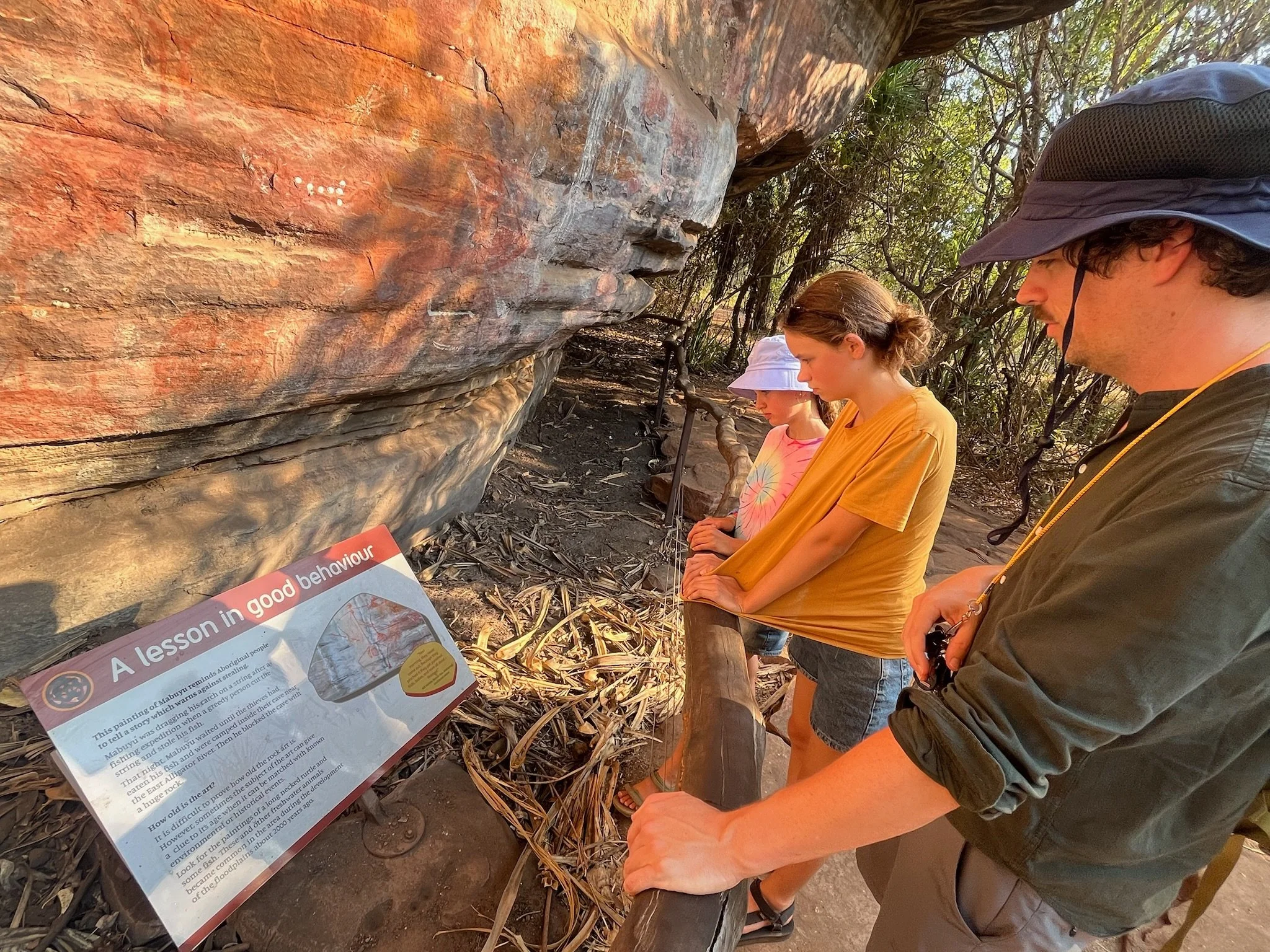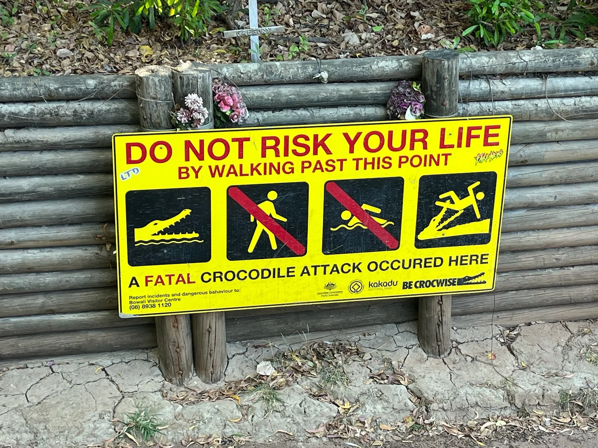 We rusten wat uit op de camping en rijden in de vooravond een uurtje noordelijker naar de aboriginal rotschilderingen in Ubirr. Die zijn volgens allerlei bronnen fantastisch, maar tekenen kunnen ze minstens zo goed in Lascaux. Allez, vinden wij he. Gelukkig is er vlak naast Ubirr ook Cahill’s Crossing, zo’n plek waarvan je denkt dat die alleen in Crocodile Dundee films bestaat. Omdat ze hier niet graag bruggen bouwen ofzo steken mensen met 4x4’s de rivier over door erdoor te rijden (voor mensen met gewone auto’s stopt Australië hier). Er is dus wel een soort weg, maar die staat eigenlijk altijd half - en bij hoog tij helemaal - onder water, met links en rechts van de oversteekplaats hongerige krokodillen. Klinkt als een perfecte scene voor een actiefilm en naar ‘t schijnt is het hier in het wet season ook wel spectaculair, maar in the dry staat het water hier redelijk laag en lijken de krokodillen niet echt geïnteresseerd. Er staan zelfs vissers op de crossing, die waarschijnlijk wat testosteron aan hun haak gehangen hebben en daarmee een baramundi (de lokale specialiteit) proberen vangen. Na drie 4x4’s die zonder problemen oversteken houden we ‘t voor bekeken; we gaan hier geen 2 avonden op rij in ‘t donker naar huis rijden. Morgen laten we Kakadu alweer achter ons, op naar Katherine en Nitmiluk Park en alweer een kilometer of 400 dichter bij Uluru. Zoef!