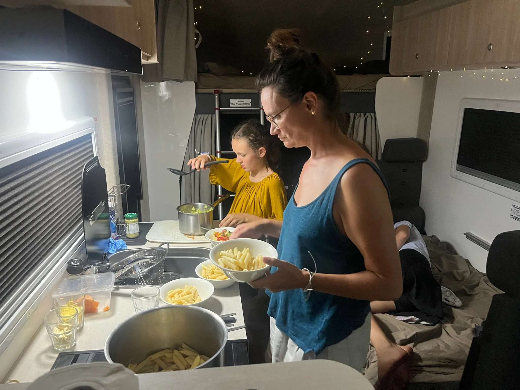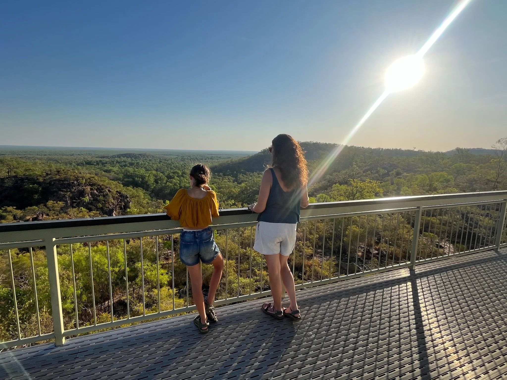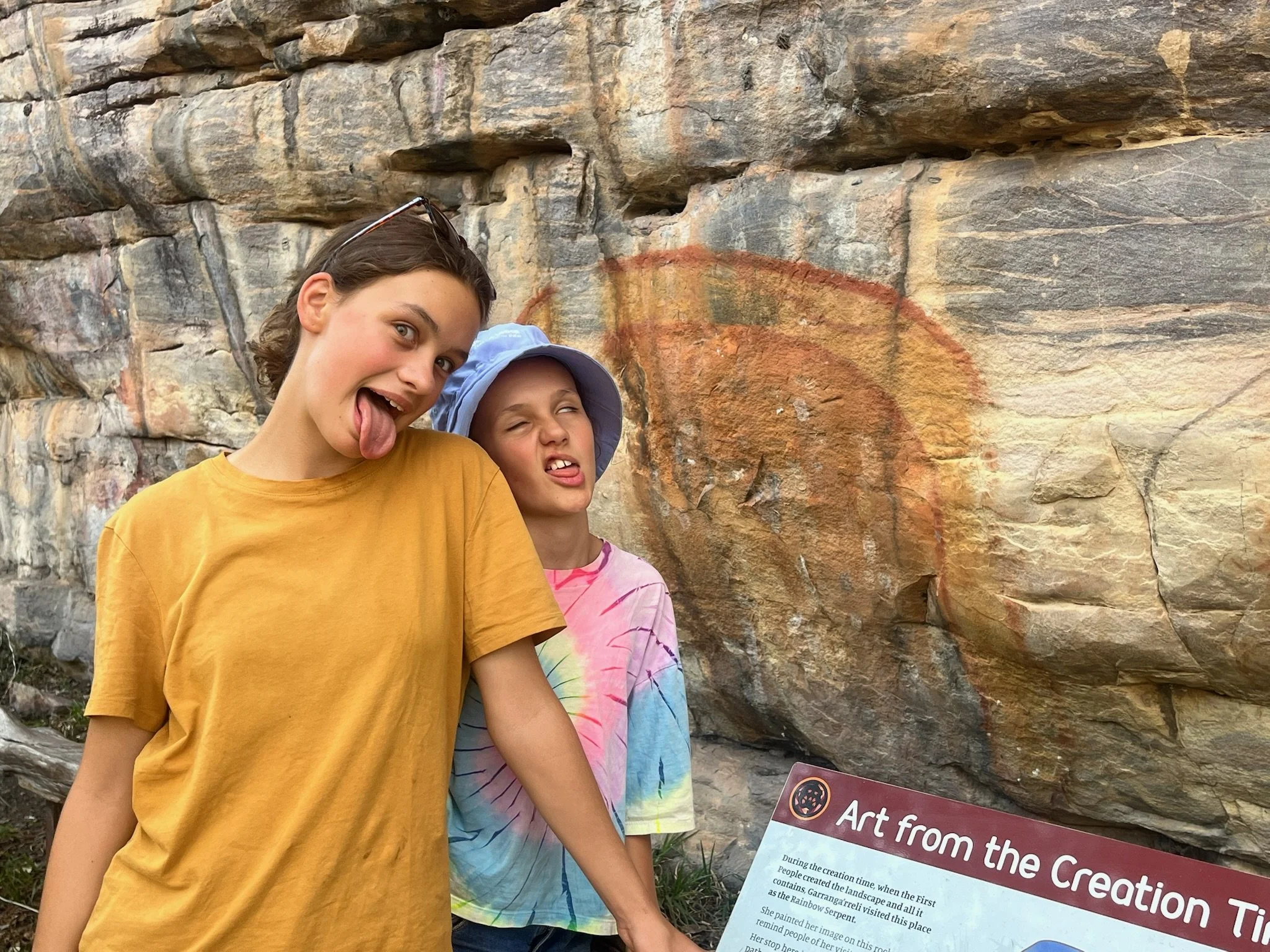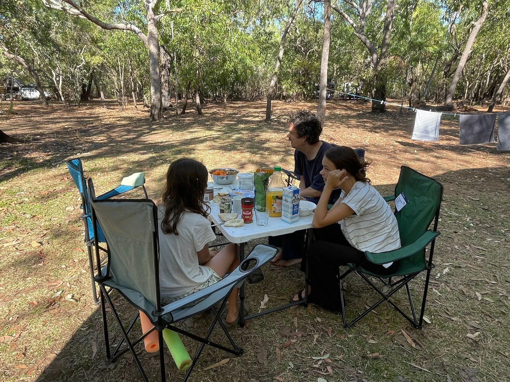 Na de middag zetten we koers richting Cooinda, in het midden van Kakadu. Opgestart in de jaren 70 door Tom en Judy Opitz, die in the middle of nowhere tussen de tropische vogels, watervallen, krokodillen en dingo’s (wilde honden) dachten: awel, hier gaan de mensen graag naar toe komen. Blijkt dat ze gelijk hadden, ondanks de afstand. De meeste locals vinden Litchfield iets makkelijker, omdat het toegankelijker is met een 2-wheel drive, maar vooral ook omdat het veel minder uitgestrekt is dan Kakadu. Vanuit Darwin is ‘t 375 km tot in Cooinda en dan ben je eigenlijk nog maar halverwege het park. We ondervinden al snel dat dat een stevig eind rijden is en ook dat de wegen niet altijd in supergoeie staat zijn. Er zitten geen putten of onverharde stukken in zoals in Indonesië, maar het asfalt is grillig en hobbelig en de camper schudt en beeft alle kanten uit, wat zich op de achterbank dubbel laat voelen. Tot daar onze ambitie om tijdens de lange afstanden wat te homeschoolen, of het moet die les over gebroken lijnstukken zijn. Ons plan om net voor zonsondergang te arriveren mislukt, dus het laatste half uurtje moeten we met dichtgeknepen billen in het donker afleggen, hopend dat al het wildlife zich koest houdt. Griet manoeuvreert er ons vakkundig door, terwijl ik op de achterbank al de wortels en patatjes probeer te schillen. Op de camping is het pikdonker, dus het duurt even voor we onze plaats vinden, maar er is power, airco, kokend water en uiteindelijk ook sauciskes en puree, dus iedereen blij!