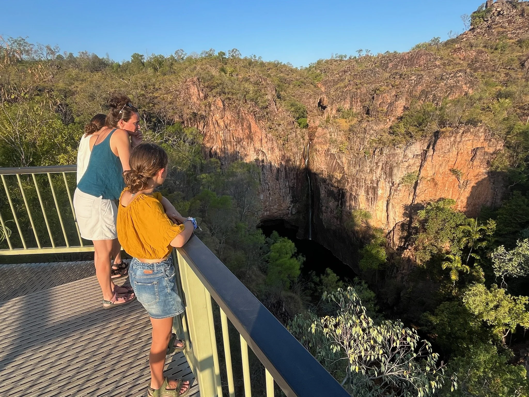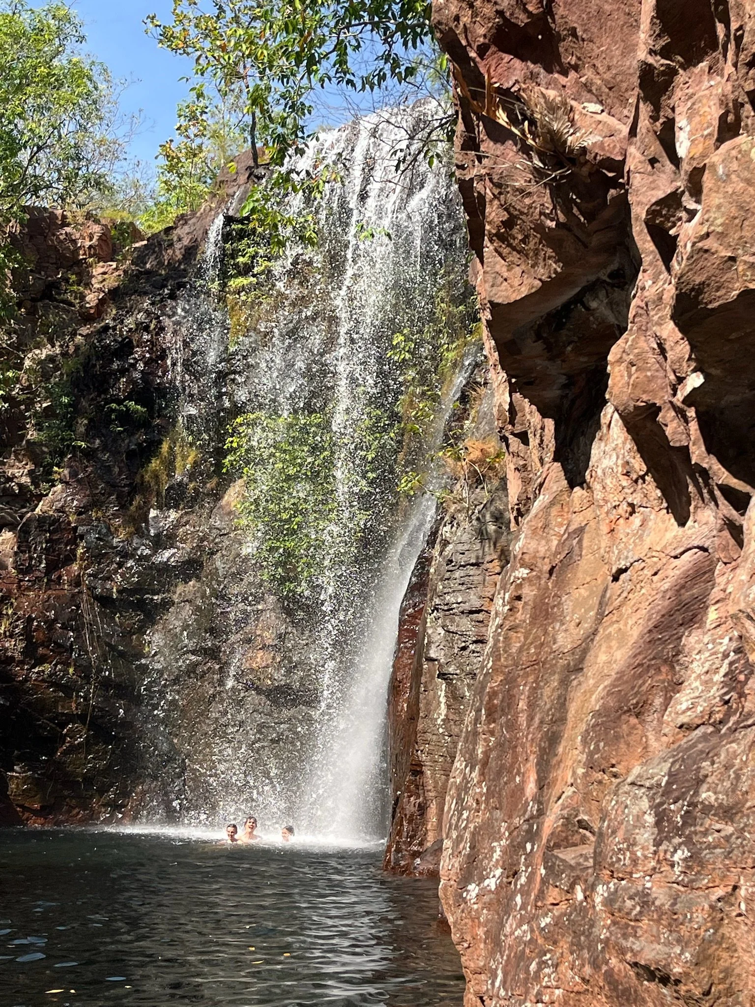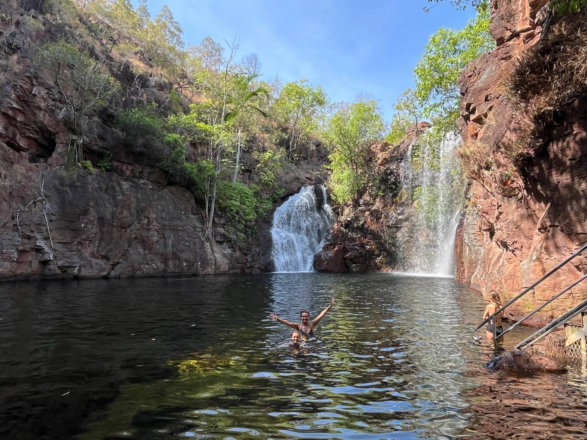 Australië is zo belachelijk groot dat de nationale parken eigenlijk gewoon gigantische autoroutes zijn, met af en toe eens een stop links of rechts voor een waterval, een creek (beek), een gorge (kloof) of een krokodil. De volledige “loop” rond Litchfield-park is vanuit Darwin een dikke 300 km. Wij willen ‘m tot ongeveer halverwege doen en slapen bij Florence Falls. Die parken zijn hier echt op een supertoffe manier georganiseerd. Ik heb parkpassen besteld en betaald, maar er is nergens echt een ingang of een loket met iemand die dat controleert. Eens je de rijbewijs-horde genomen hebt mag hier echt álles. Elke stop staat heel duidelijk aangegeven, er is een parking, een bordje met info en een plannetje met mogelijke wandelroutes, waarbij de kortste meestal op maat is van toeristen met weinig tijd of mensen op leeftijd (“Australië loopt vol bejaarden, ik zeg het u.”, GVH). We rijden Litchfield in langs het noorden en stoppen bij Wangi-falls, twee spectaculaire watervallen en een poel waar je mag zwemmen. Dat is hier niet evident up north, want bij elke plas water staat er een bordje met “Be Croc-wise!” en daaronder de kans dat je er levend uitkomt. Wangi Falls heeft “very low risk” en hoewel dat dus nog altijd niet nul is, volgen we de locals en springen we erin, zalig. Een krokodil zien we (gelukkig) niet, enkel een grote varaan, maar die geniet ook gewoon maar van de zon. We rijden verder langs Tolmer Falls (prachtig zicht) en komen tegen de duisternis aan bij Florence Falls, onze eerste stop. Dat is een eenvoudige kampeerplaats in het national park, unpowered (zonder stroom), wat dus ook betekent dat we de airco niet kunnen gebruiken en begin dan maar eens voor een eerste keer uit te zoeken hoe je de bedjes moet opmaken, bij 35 graden. We puffen en zweten er ons door en Robin maakt ondertussen een heerlijke pastasalade. ‘s Nachts koelt het gelukkig een mini klein beetje af (‘t is hier een tropisch klimaat), dus we slapen toch een beetje.