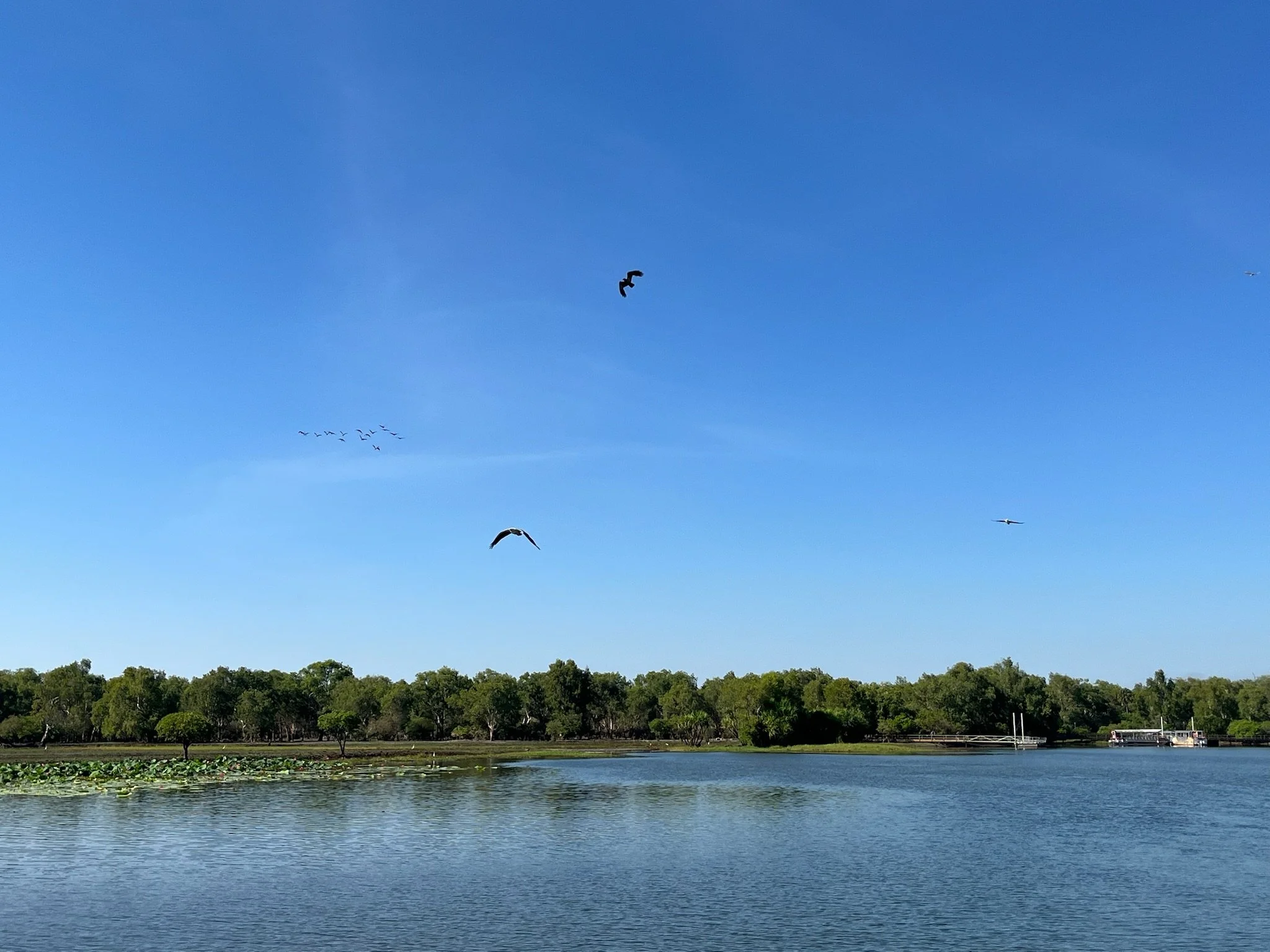 ‘t Zijn echter niet alleen de salty’s die met alle aandacht gaan lopen. We zien ook fantastische vogels, waaronder 2 majestueuze zee-arenden (Griet moet er al weer van huilen), een pelikaan, jabiru’s (zwartnek-ooievaren), lepelaars, ibissen (die vogels met hun lange snavel, bin chickens noemen ze die hier, omdat ze de vuilbakken leegeten), whistling kites (een wouw), magpie goose, eenden (die onbekommerd langs de krokodillen marcheren - “croc’s not interested; they’re too small”, aldus onze gids) en een waterbuffel. De gids praat het allemaal heel tof aan mekaar en de 2 uur vliegen (letterlijk) voorbij, zalig.