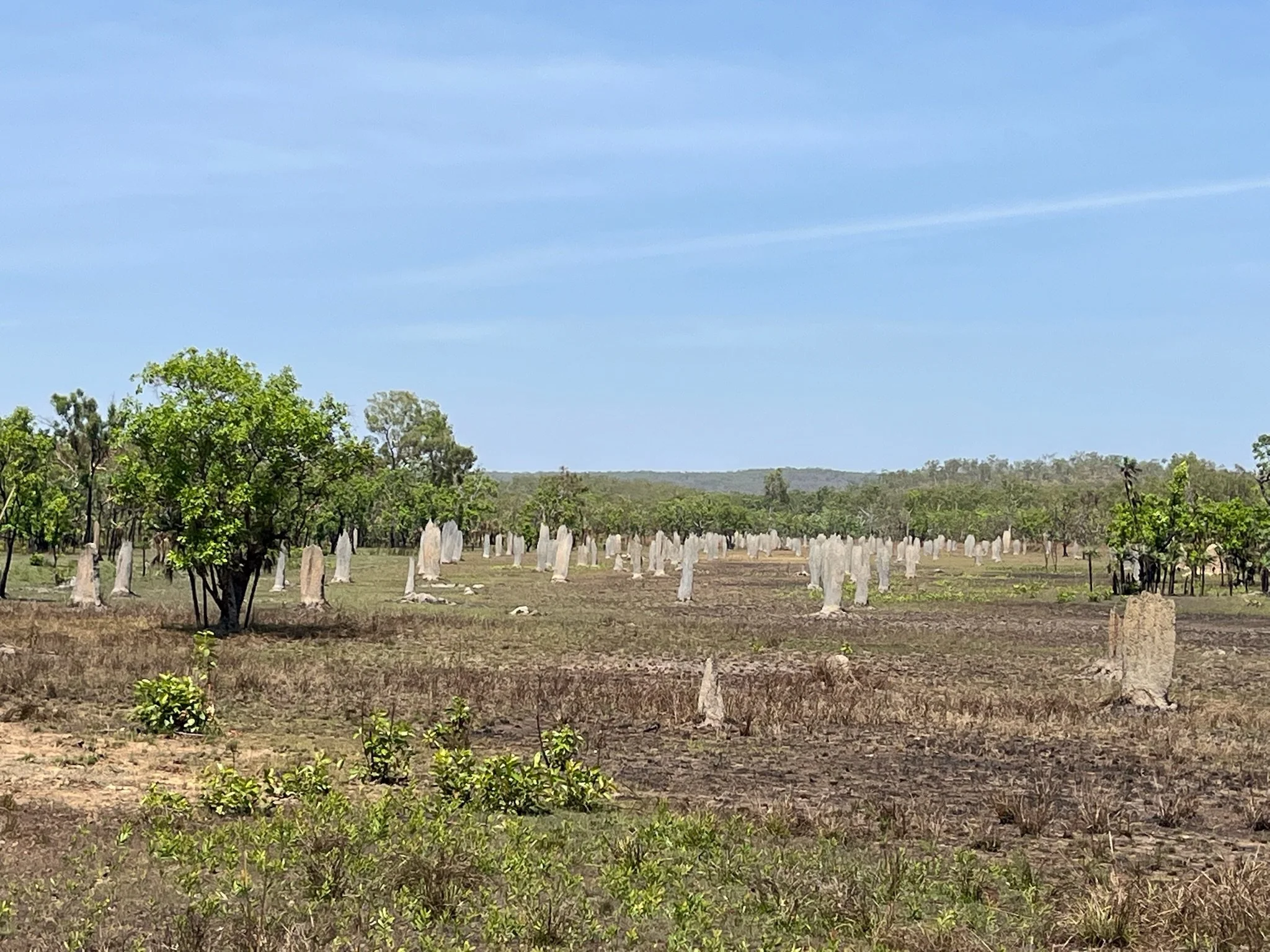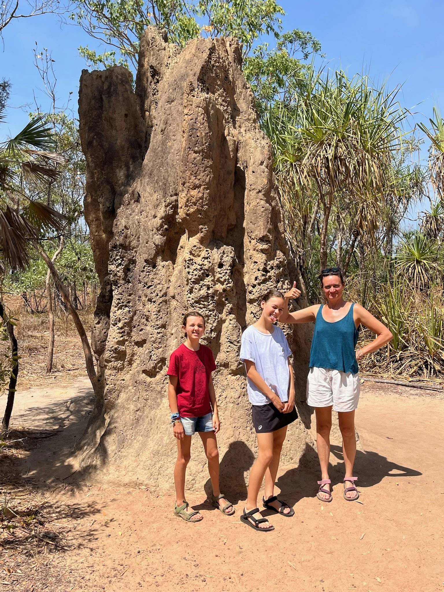 De volgende ochtend gaan we vanop de camping zo’n 150 trappen omlaag richting Florence Falls zelf en nemen een verfrissende douche onder de waterval. De laatste halte in Litchield is een stop bij de Magnetic Termite Mounds. Heel Litchfield (en eigenlijk de hele eerste 400 km onder Darwin) staat tussen de eucalyptussen vol met termietenheuvels, maar deze zijn bijzonder omdat ze zo gigantisch groot zijn (tot wel 4 meter) én ook uniek, omdat er naast gewone termieten ook kompastermieten aan het werk zijn, die er op een of andere manier in slagen om hun heuvels als een soort rechthoekige monoliet perfect op de noord-zuid-as te bouwen (waardoor het grootste vlak de minste zon neemt). Die beesten komen enkel in Australië voor en nu weten die dus ook eens hoe vier bezwete Belgen eruit zien, ‘t is graag gedaan. We rijden terug richting Darwin en halen daar rond de middag - tromgeroffel - de rijbewijzen op! Laat die speeding tickets maar komen! Griet heeft ook al zin in Vietnam en ziet dat er vlakbij het DHL-filiaal een Vietnamees restaurant is met volgens Google de beste banh mi (broodjes) in Darwin, maar wellicht is er gewoon maar 1 banh mi ding in Darwin. Enfin, ‘t was niet slecht. Omdat we hier nu toch terug in de buurt van de shopping mall zijn, laten we ons gaan en kopen we een klein ventilatorke (ze gaan ons hier geen 2 keer liggen hebben. Of misschien toch wel, want ‘t is een prutsding) en 12 pintjes, op vertoon van ons paspoort, om te kijken of we niet op een banned drinker list staan. Gelukkig heeft Sjimmie onze jaarrekening van Café Congé nog niet naar hier doorgestuurd.