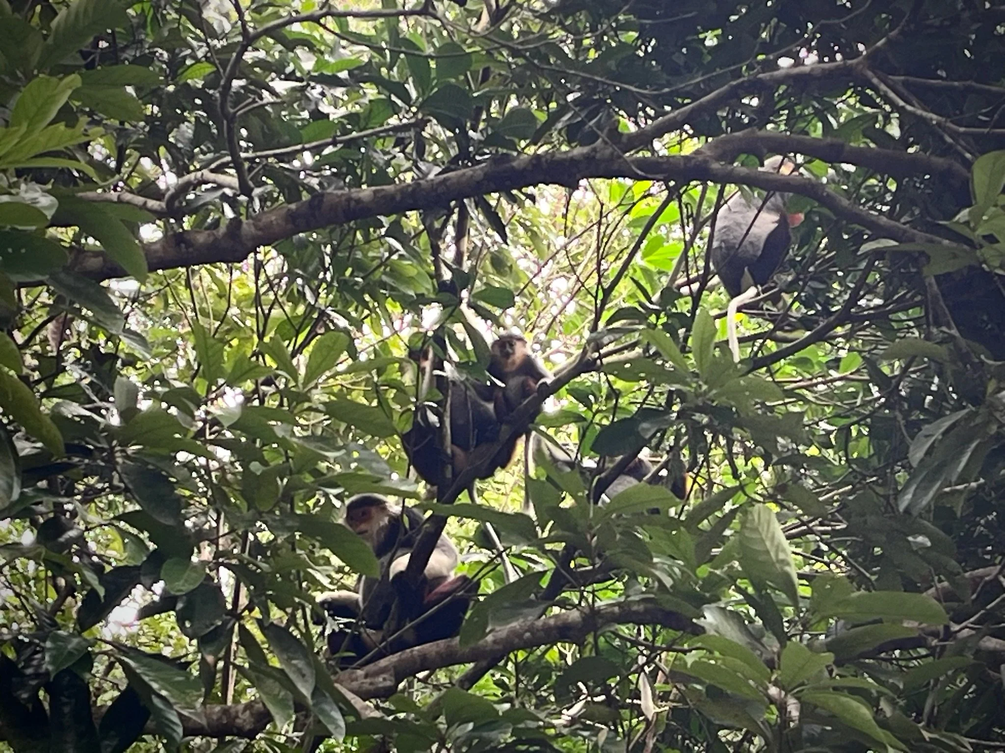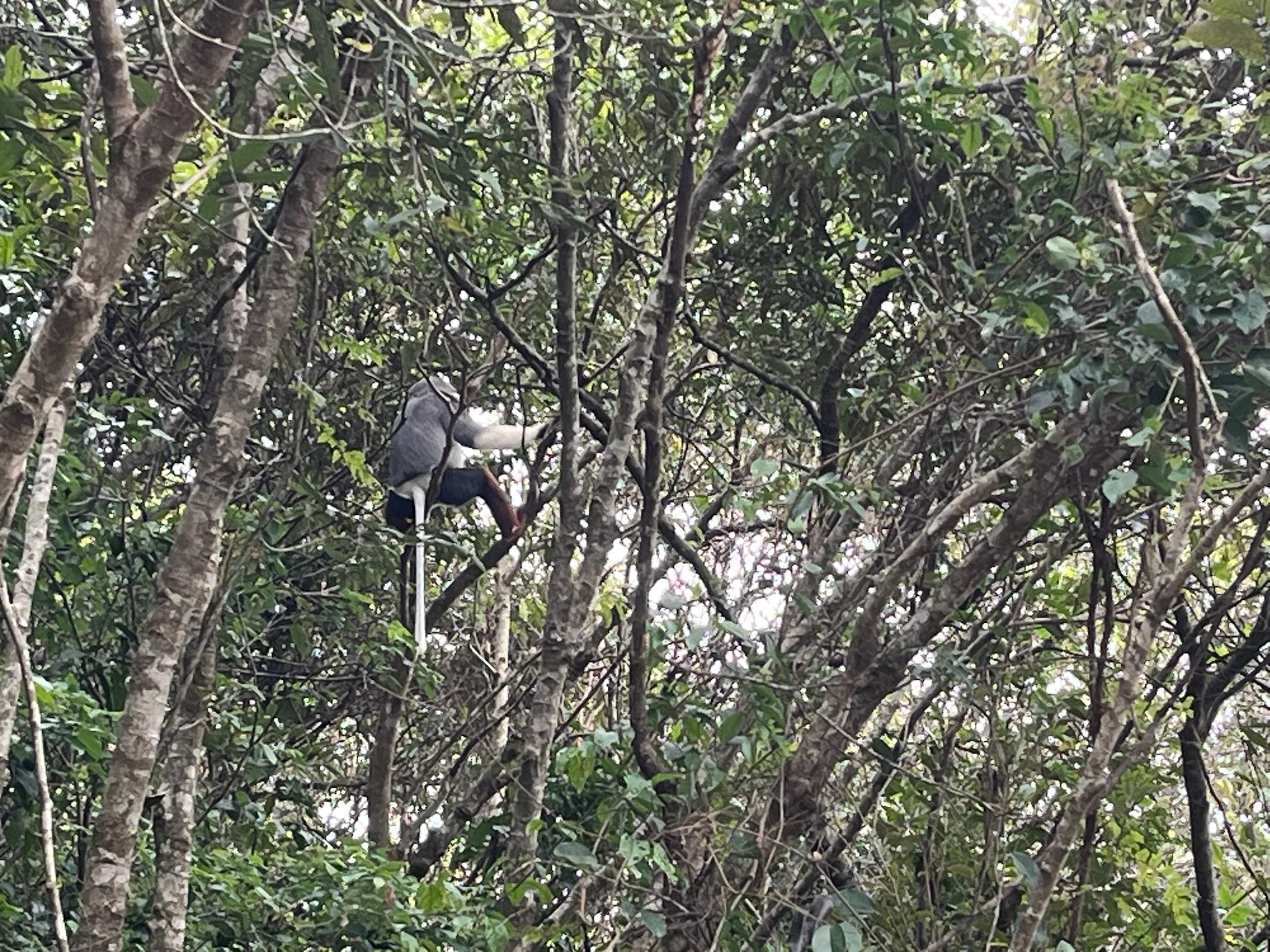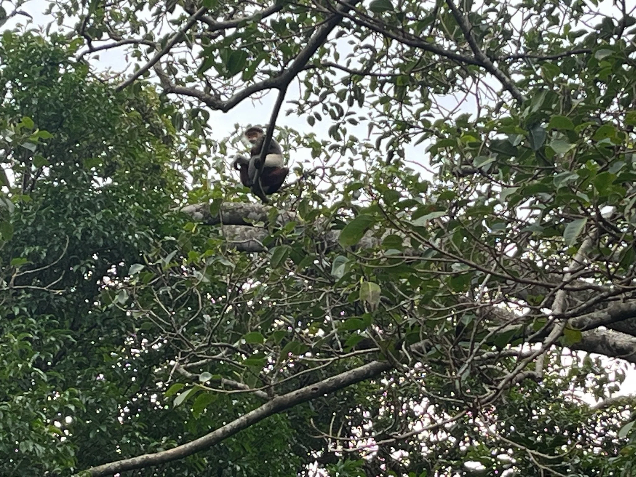 Gelukkig zetten we wel door en het loont, want we zien echt heel veel Red Shanked Douc apen. Die zien er echt ongelooflijk grappig uit; het lijkt alsof ze een broek aan hebben met hun roste schenen en zwarte dijen. En dan nog die grote grijze baard rondom hun oranje gezicht. We komen tijdens de tocht wel een keer of 6 een slingerende bende tegen. In Australië zaten we nog aan een ratio van één koala voor hetzelfde aantal kilometers, dit is echt zalig.