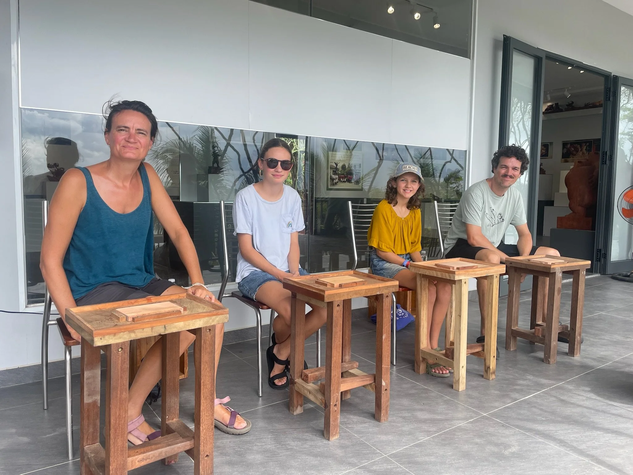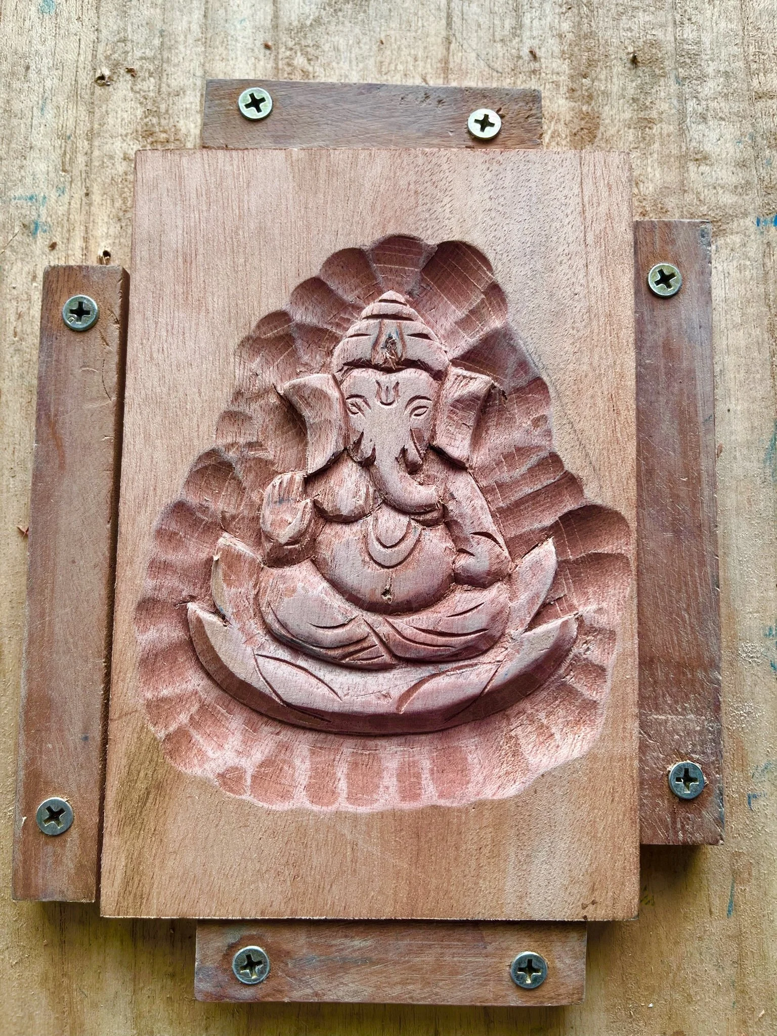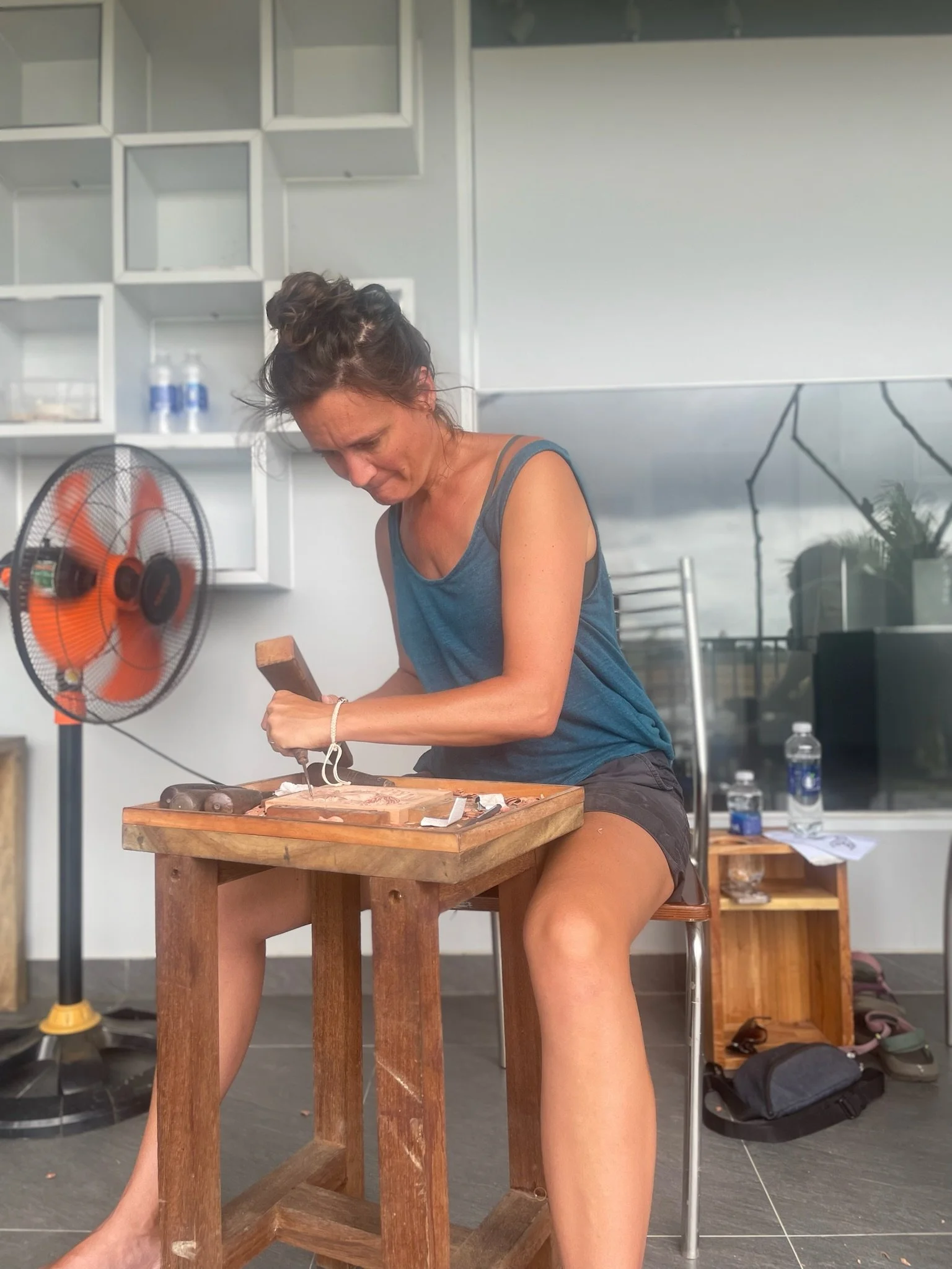 De Woodcarving is een schot in de roos. We moeten ervoor naar een plek naast de rivier buiten de stad. We zijn er helemaal alleen en hebben enkele getalenteerde woodcarvers als gids. We krijgen elk een plankje en wat werkmateriaal. Eerst tekenen we onze afbeelding en daarna mogen we in verschillende stappen beginnen carven. Wij kiezen met onze vis, walvis en zeepaardje voor een oceanografisch thema maar Senne zit al in Indische sferen en kiest voor Ganesha. Na een uurtje of drie gaan we tevreden met onze plankjes naar huis.