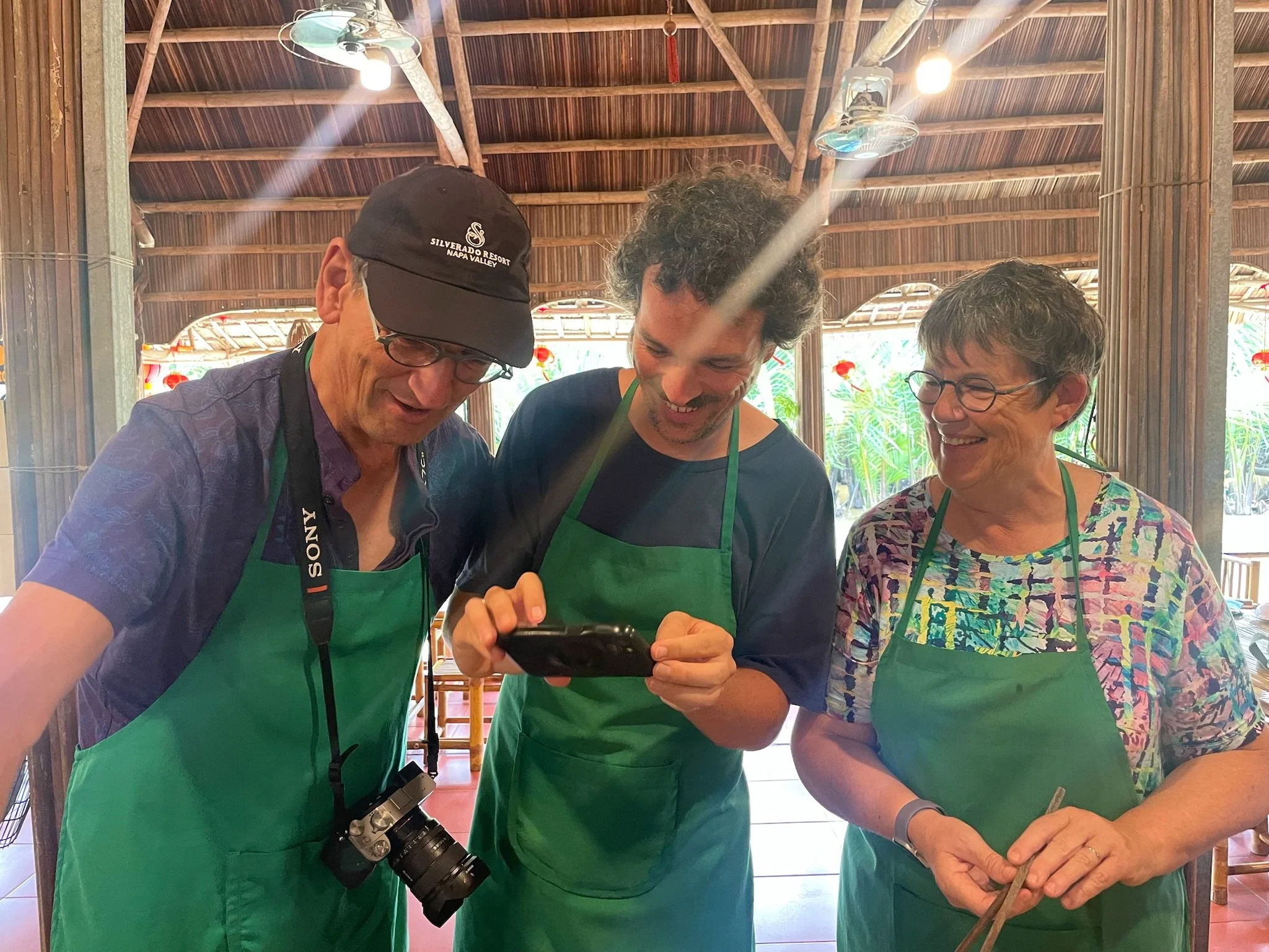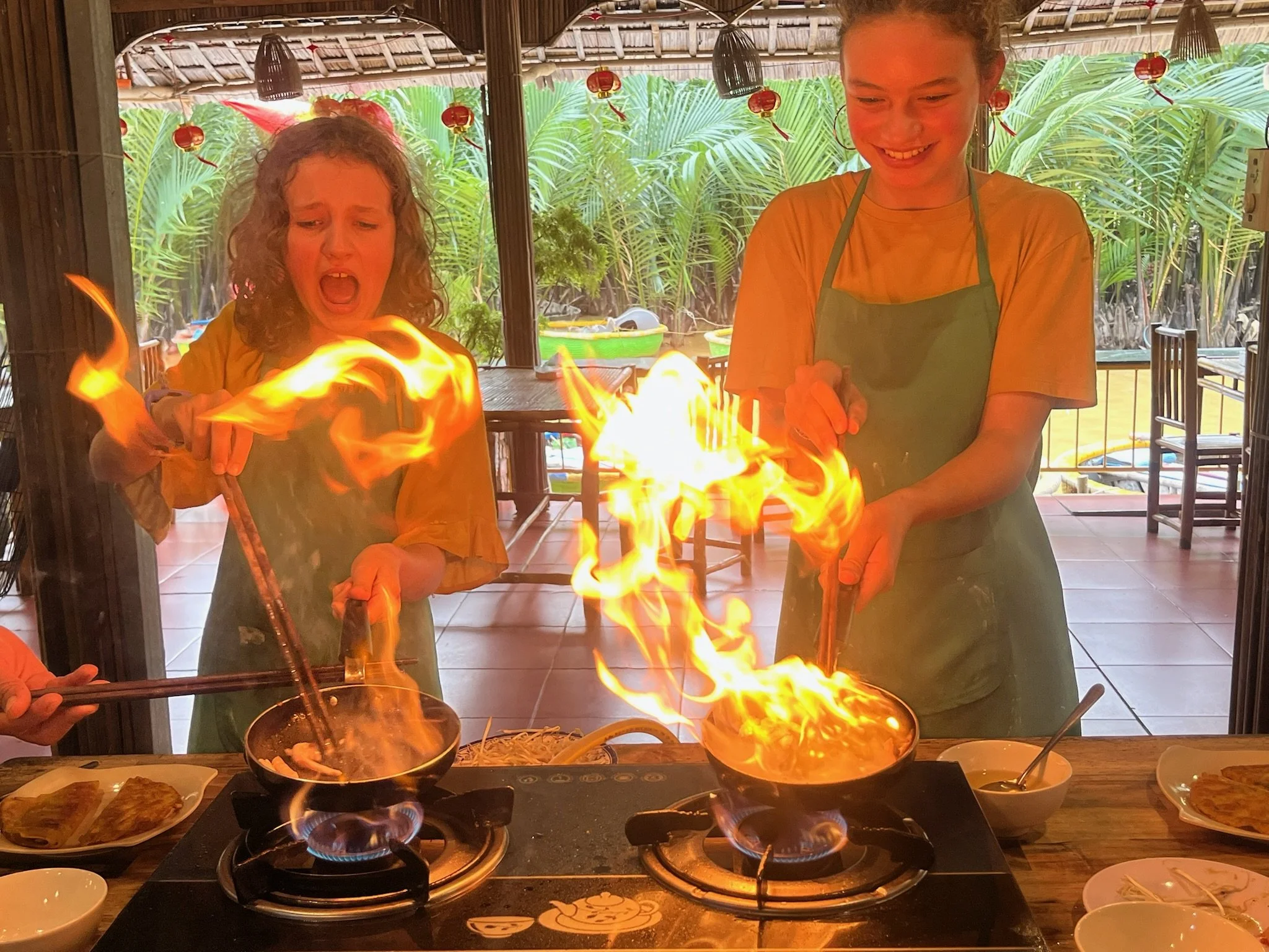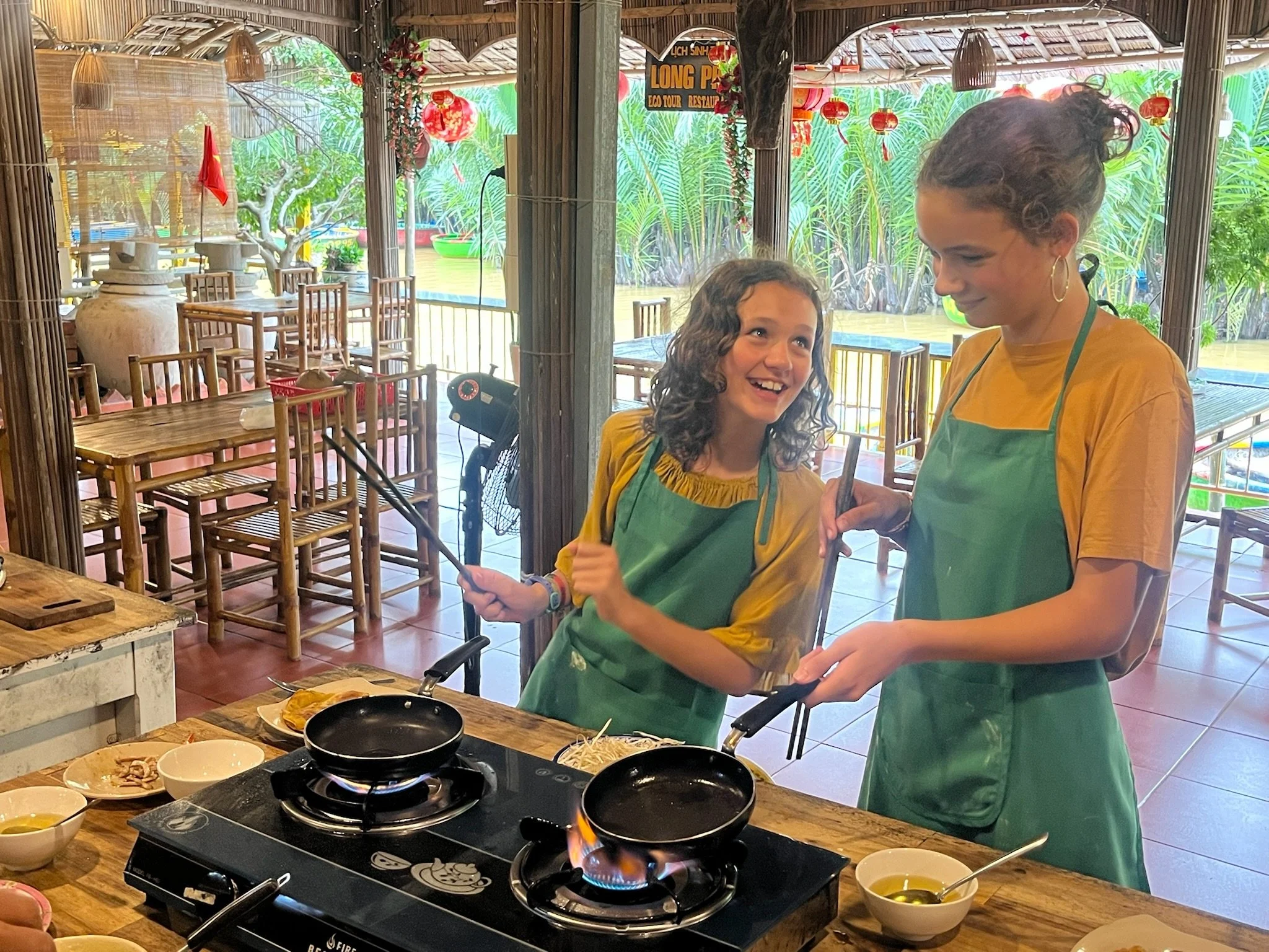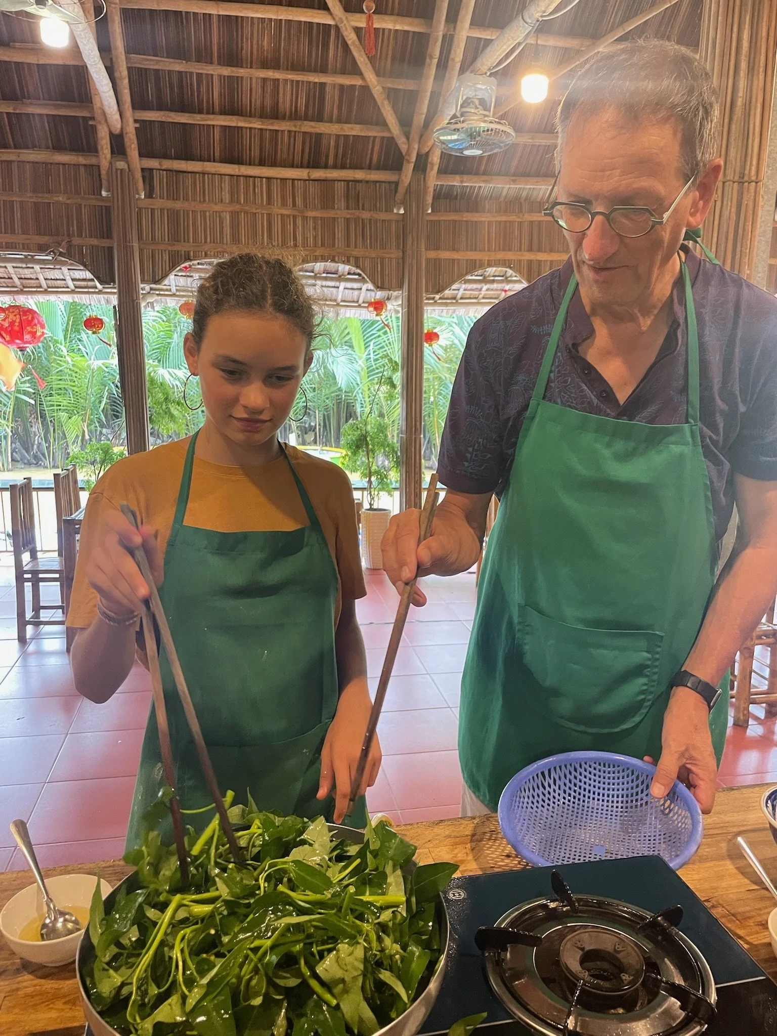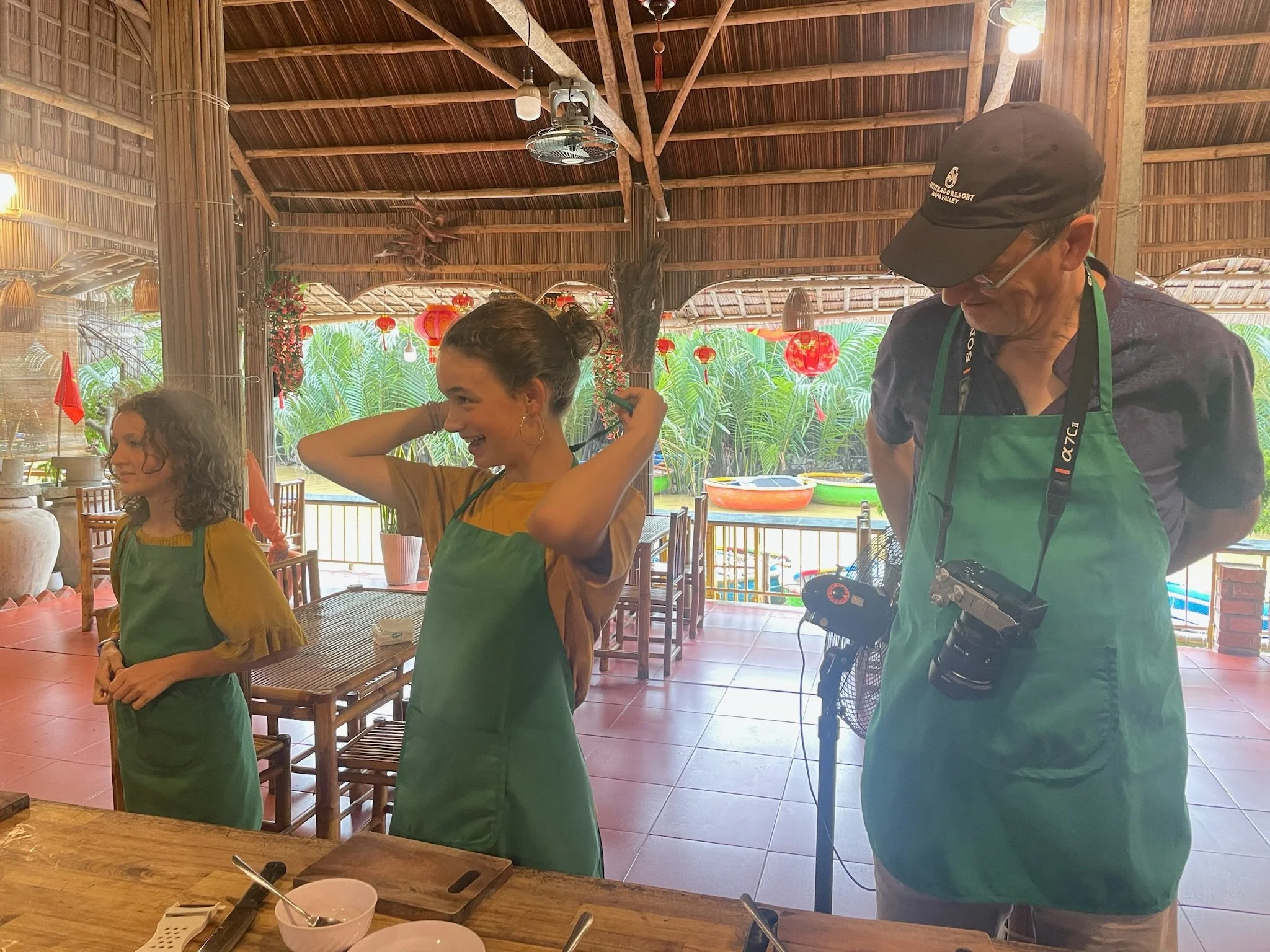 De volgende dag hebben we een Cooking Class gepland. Met ons zessen trekken we een kookshort aan en beginnen we aan de voorbereidingen van de volgende kerstmenu bij de Gunskes; Bahn Xeo (Vietnamese pannenkoekjes met shrimp en kip), Spring Rolls, White Rose Dumplings, Morning Glory en Pho Bo (noedelsoep met rundsvlees). Op een gegeven moment gaan we naar level 2 ‘showcooking’ en leren de kinderen hoe ze op spectaculaire wijze de keuken in brand kunnen steken. Dat wordt interessant thuis.
