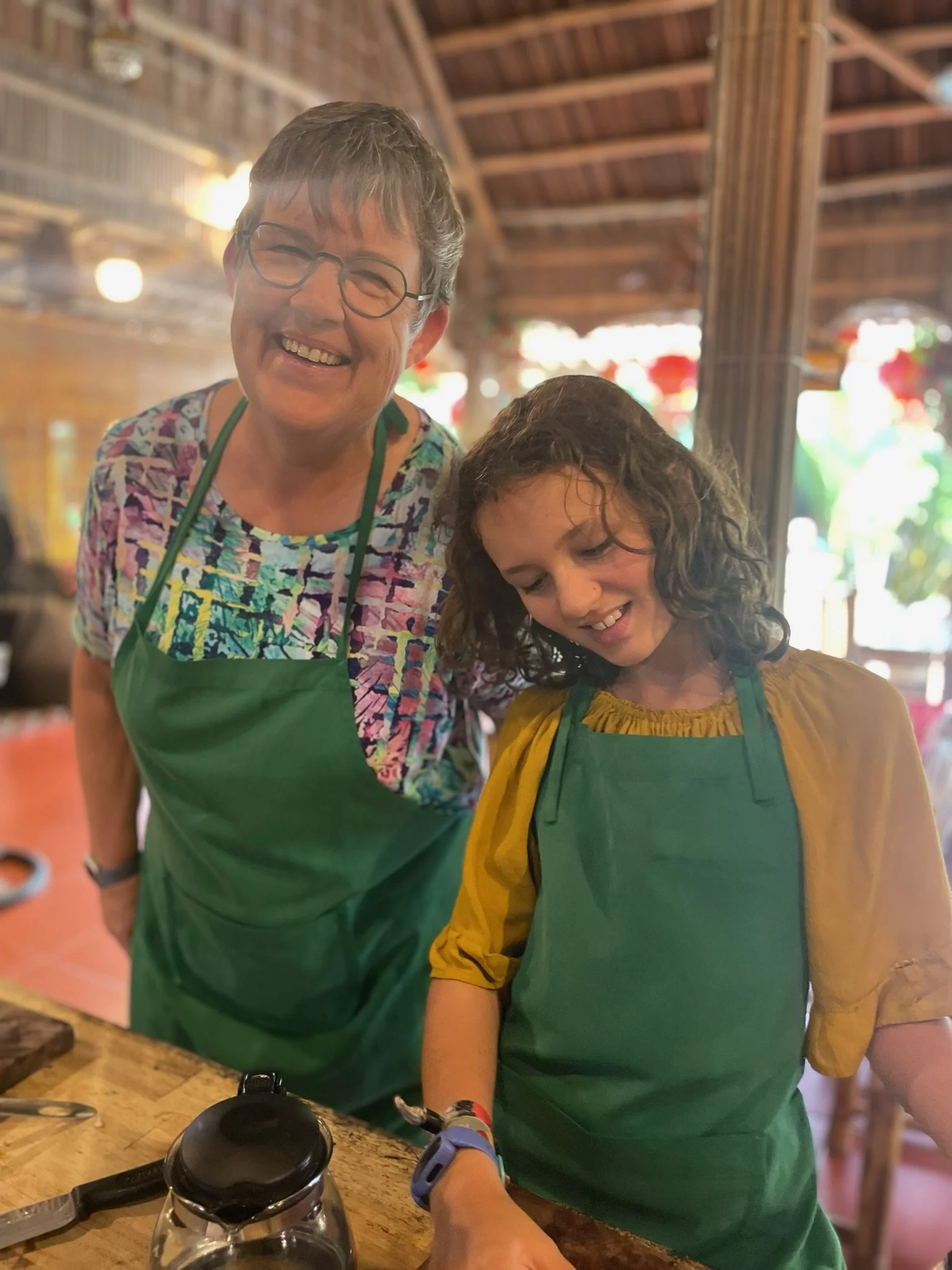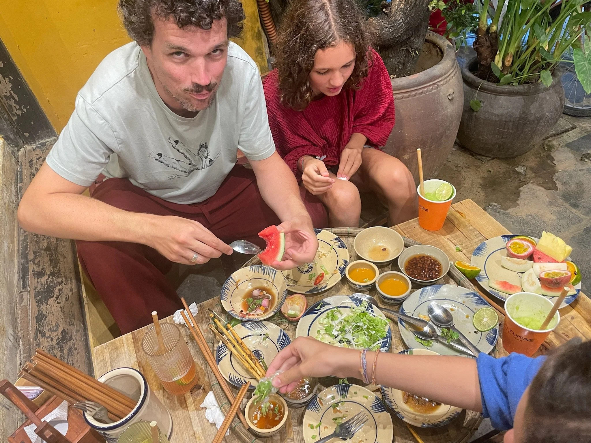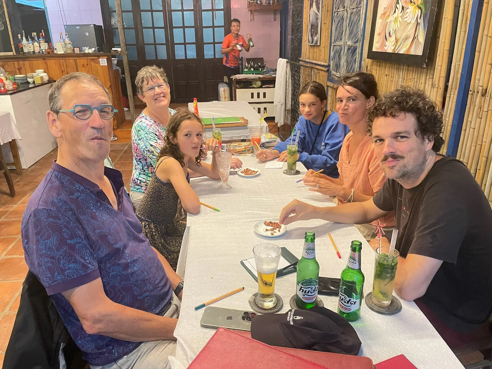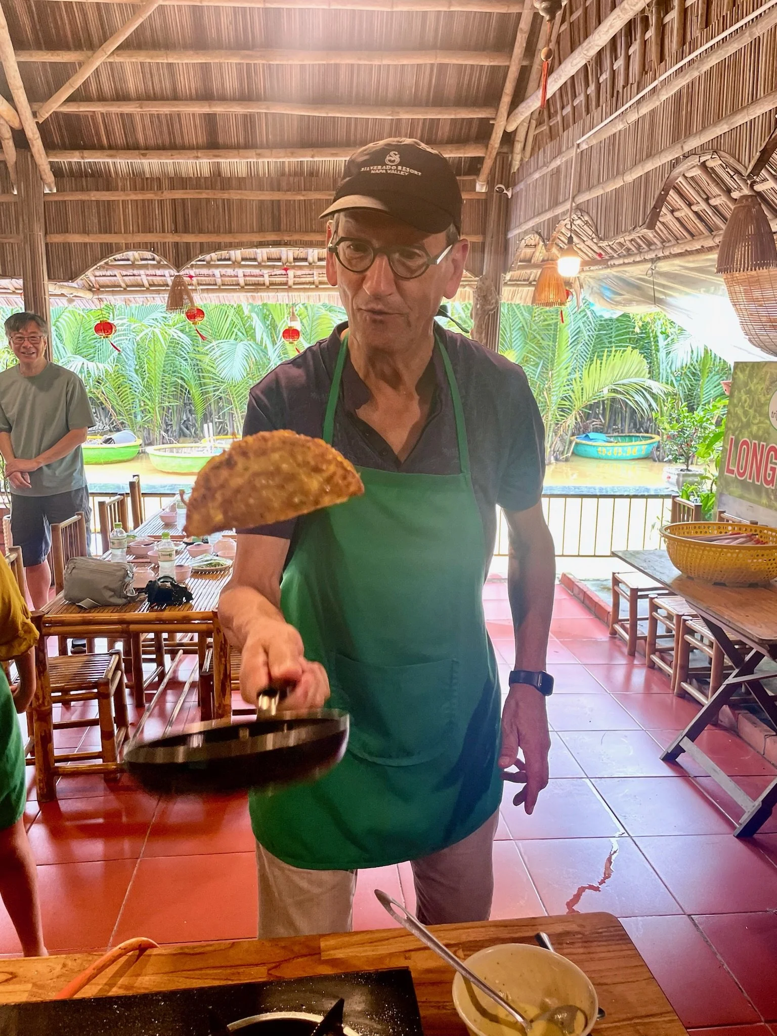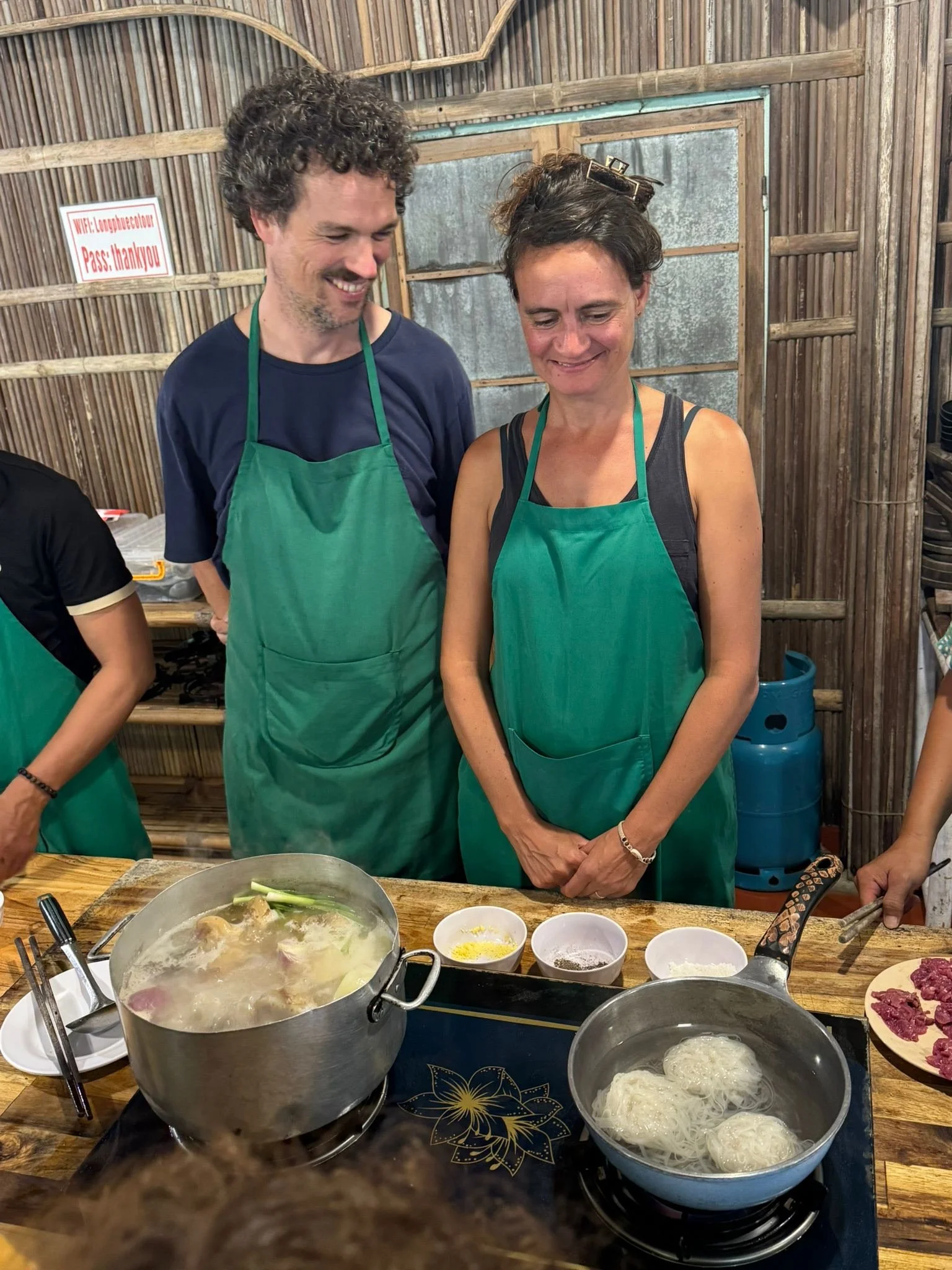 De volgende dag hebben we een Cooking Class gepland. Met ons zessen trekken we een kookshort aan en beginnen we aan de voorbereidingen van de volgende kerstmenu bij de Gunskes; Bahn Xeo (Vietnamese pannenkoekjes met shrimp en kip), Spring Rolls, White Rose Dumplings, Morning Glory en Pho Bo (noedelsoep met rundsvlees). Op een gegeven moment gaan we naar level 2 ‘showcooking’ en leren de kinderen hoe ze op spectaculaire wijze de keuken in brand kunnen steken. Dat wordt interessant thuis.