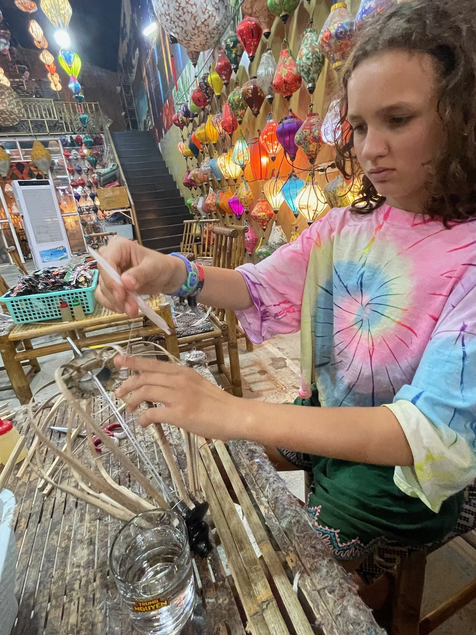 De Lantern Making Class hebben we de vorige reis twee keer gedaan, en nu staan we hier alweer. Het is een super leuke activiteit, ze laten je de lampionnetjes helemaal alleen opbouwen vanaf het eerste bamboestokje. Je kiest een mooi stofje op het eind en lijmt alles aan elkaar. De kindjes en ik zitten een goeie drie uur in de gezellige werkplaats te knutselen en wandelen buiten met een zak vol lampionnetjes. Deze keer is het Senne die verstek geeft. Al is het toch onvermijdelijk: als we volgende week niet willen reizen naar India met een rugzak vol lampionnen, bamboe lampen, blokken hout en nog zoveel meer, moeten we naar het postkantoor.