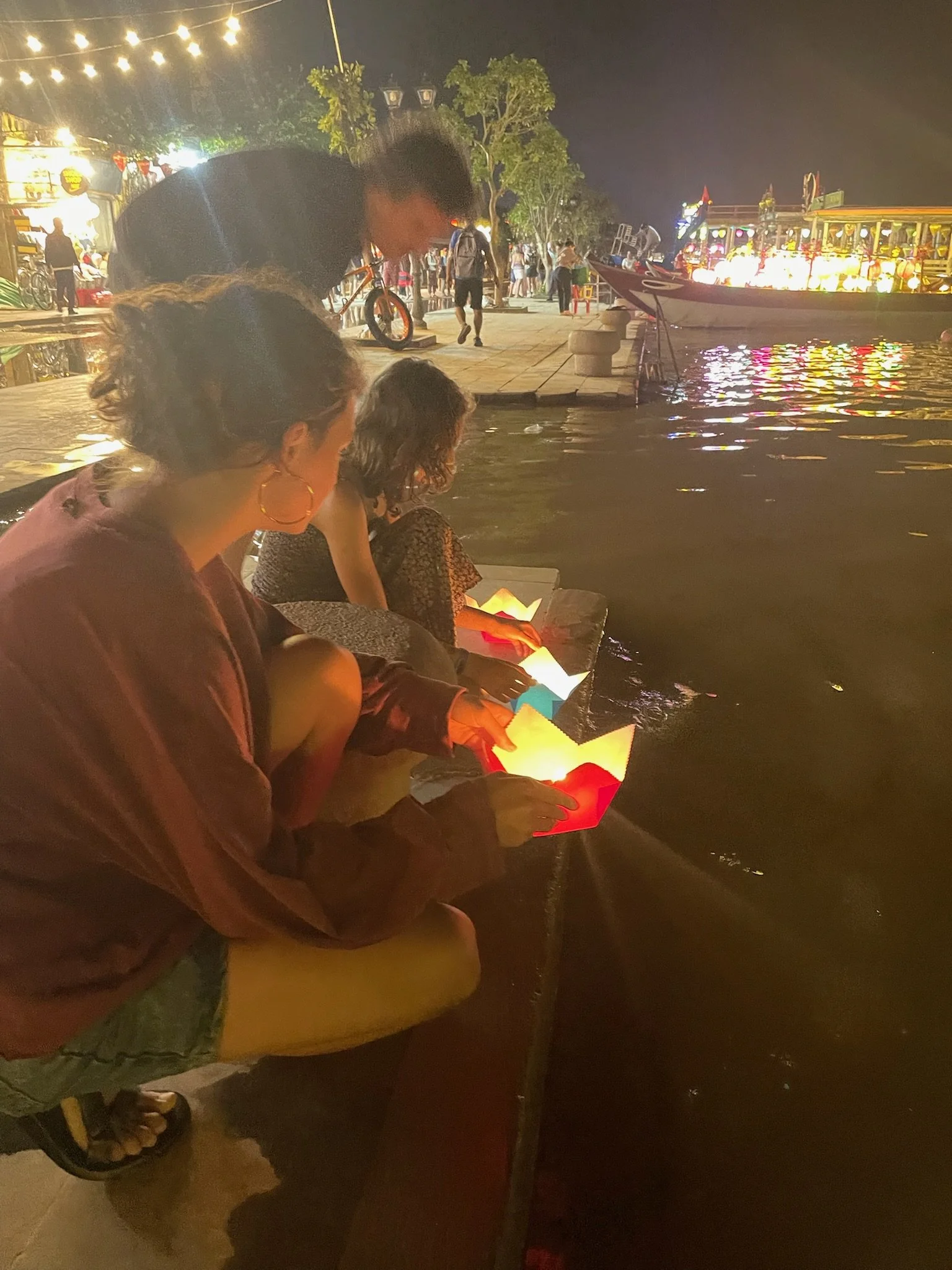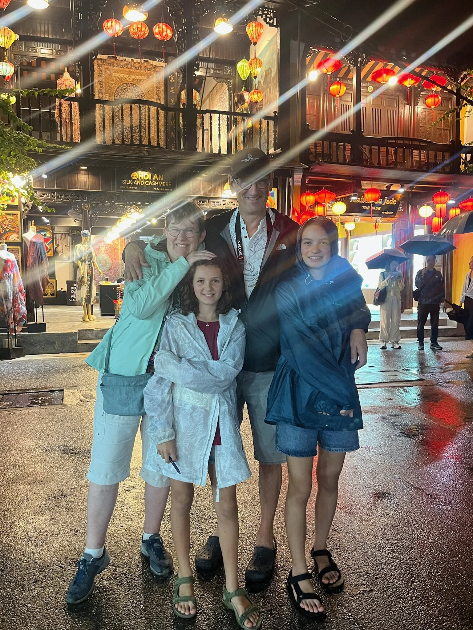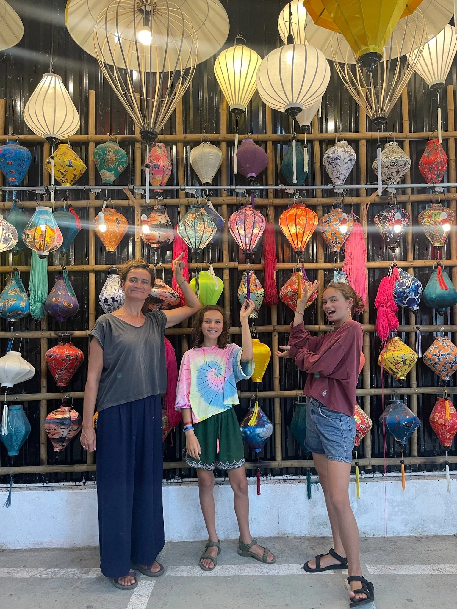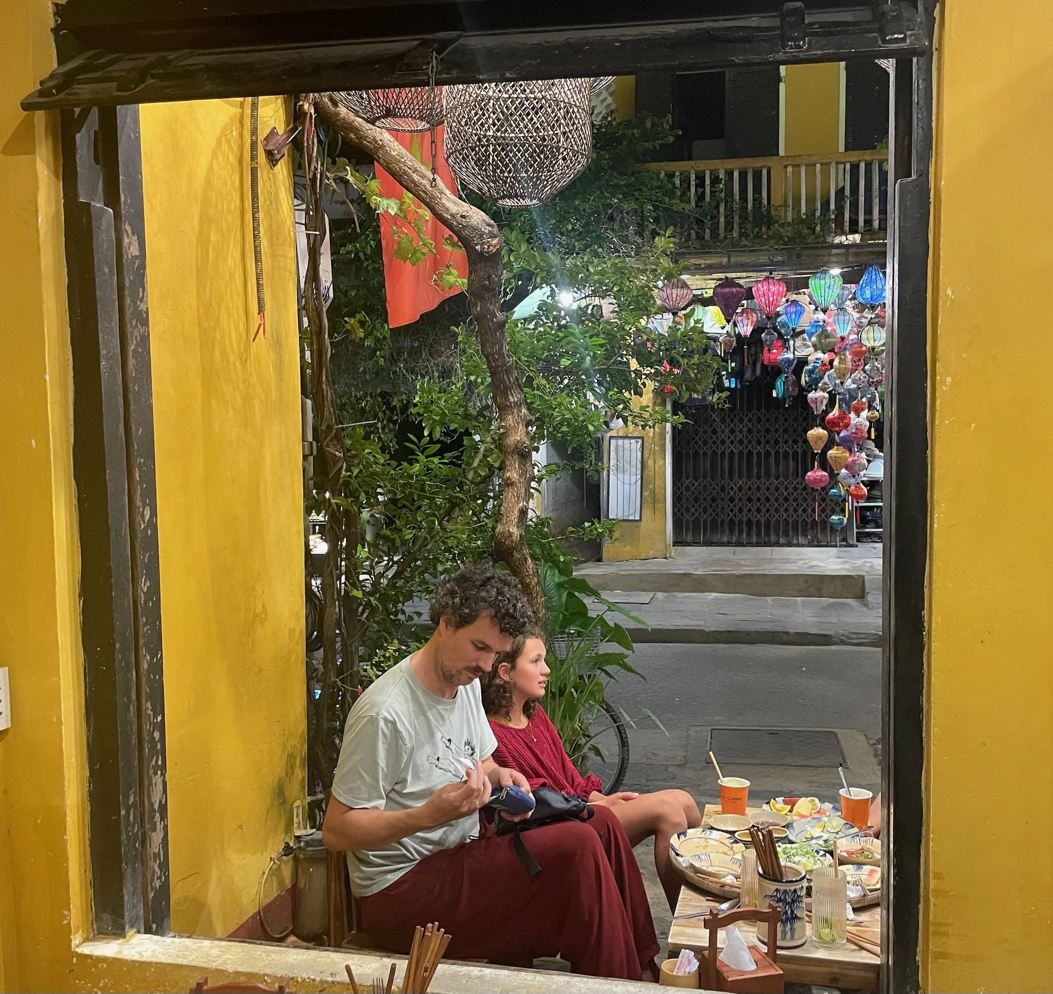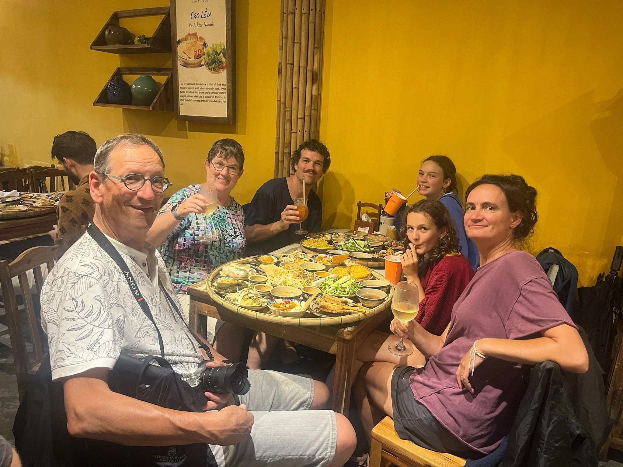 We sluiten de laatste 2 dagen af in het gezelschap van niemand minder dan oma en opa! Zij doen een rondreis van Noord Vietnam tot Hoi An, en wij hebben onze reis van Zuid naar Noord mooi laten uitkomen tot dit moment. Wanneer we terugkomen van de post lopen we ze in de tuin van het hotel tegen het lijf, zalig weerzien! Ze hebben wat regen uit Noord Vietnam meegenomen want na 8 zonnige dagen begint het hier in Hoi An ook te miezeren, maar we laten ons daar niet door van de wijs brengen. Met een regenjas aan trekken we de gezellige stad in.