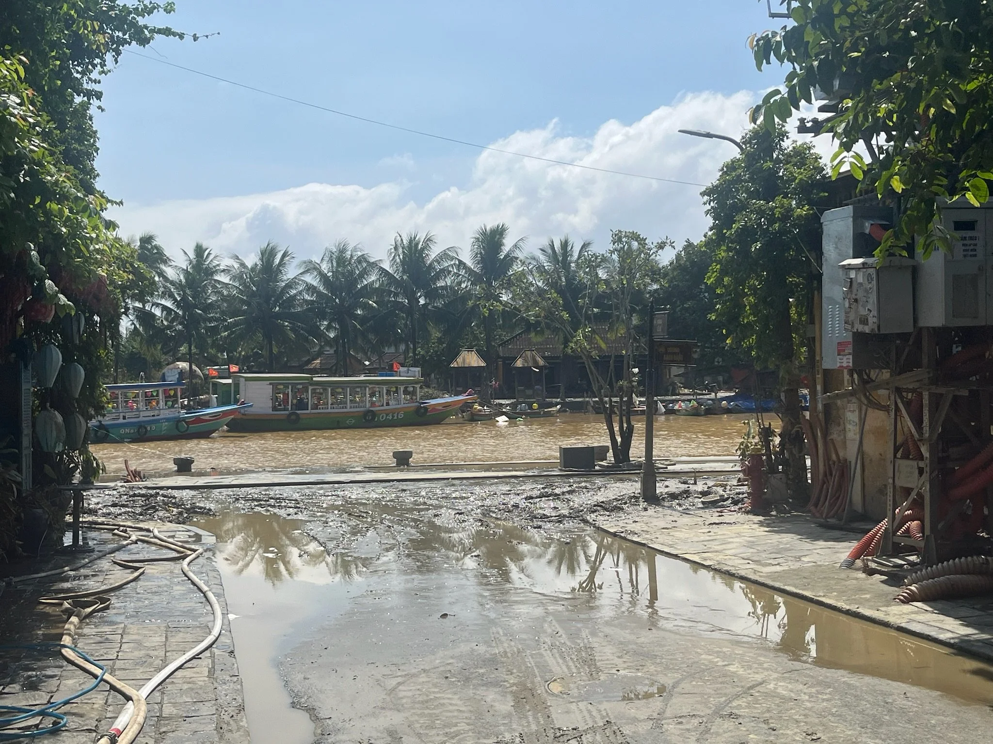 Hier in Hoi An komen we aan als de flooding net voorbij is. Er zijn in onze hostel nog steeds geen mensen, want die hebben allemaal gecancelled, en tijdens brommertochtjes buiten de stad zien we vaak nog paadjes en rijstvelden die helemaal onder water staan, modderige straten, en hopen vuilnis bij elkaar geveegd. Veel mensen zijn ook aan hun huis aan het werken; ze metsen muurtjes rondom hun huis, en er liggen nog zandzakjes op de daken. We brommeren ook eens naar de Nipa villa, waar we vorige keer verbleven, die ligt net aan een rivier, en ook daar zijn de straten nog modderig, het ziet er toch allemaal wat triestig uit.