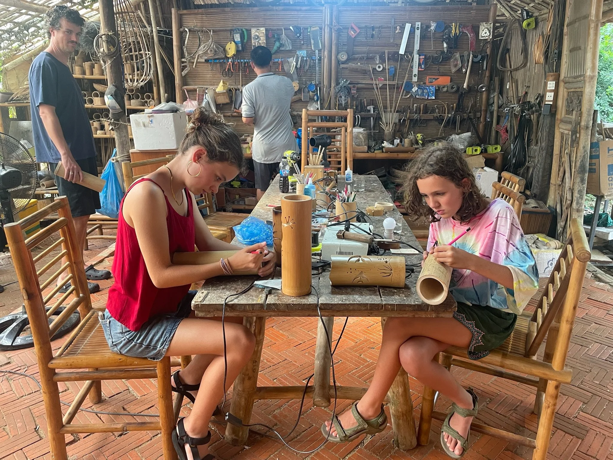 Deze week schakelen leerkrachten Griet en Senne over naar de Steiner pedagogie. We doen achtereenvolgens een workshop woodcarving, bamboo making, lantarn making en cooking class. De Silver making class slaan we uiteindelijk over want ze durven hier in Hoi An nogal toveren met hun prijzen en daar hebben wij geen zin in. Besparingen in het onderwijs, het is hier net zoals thuis.