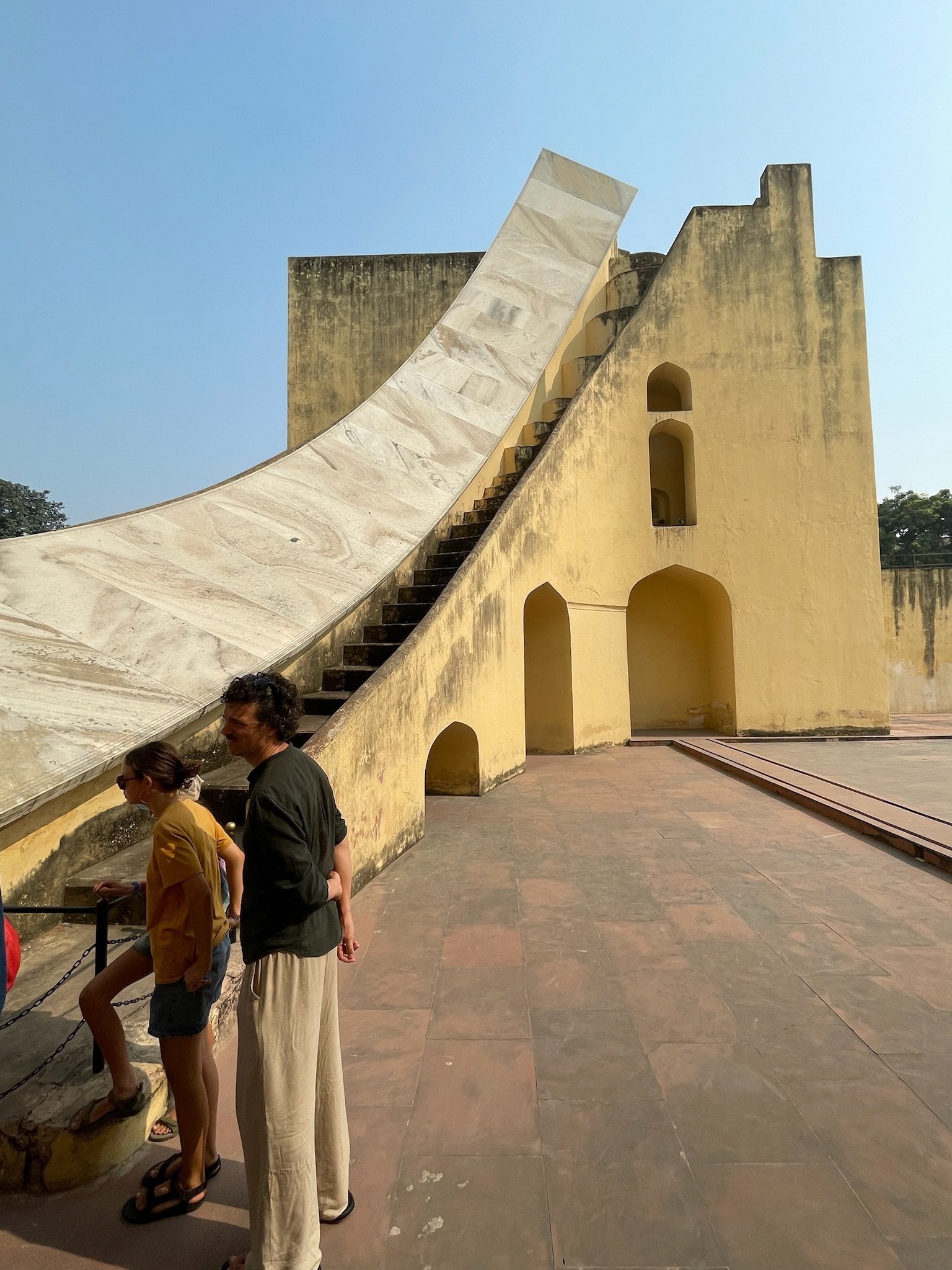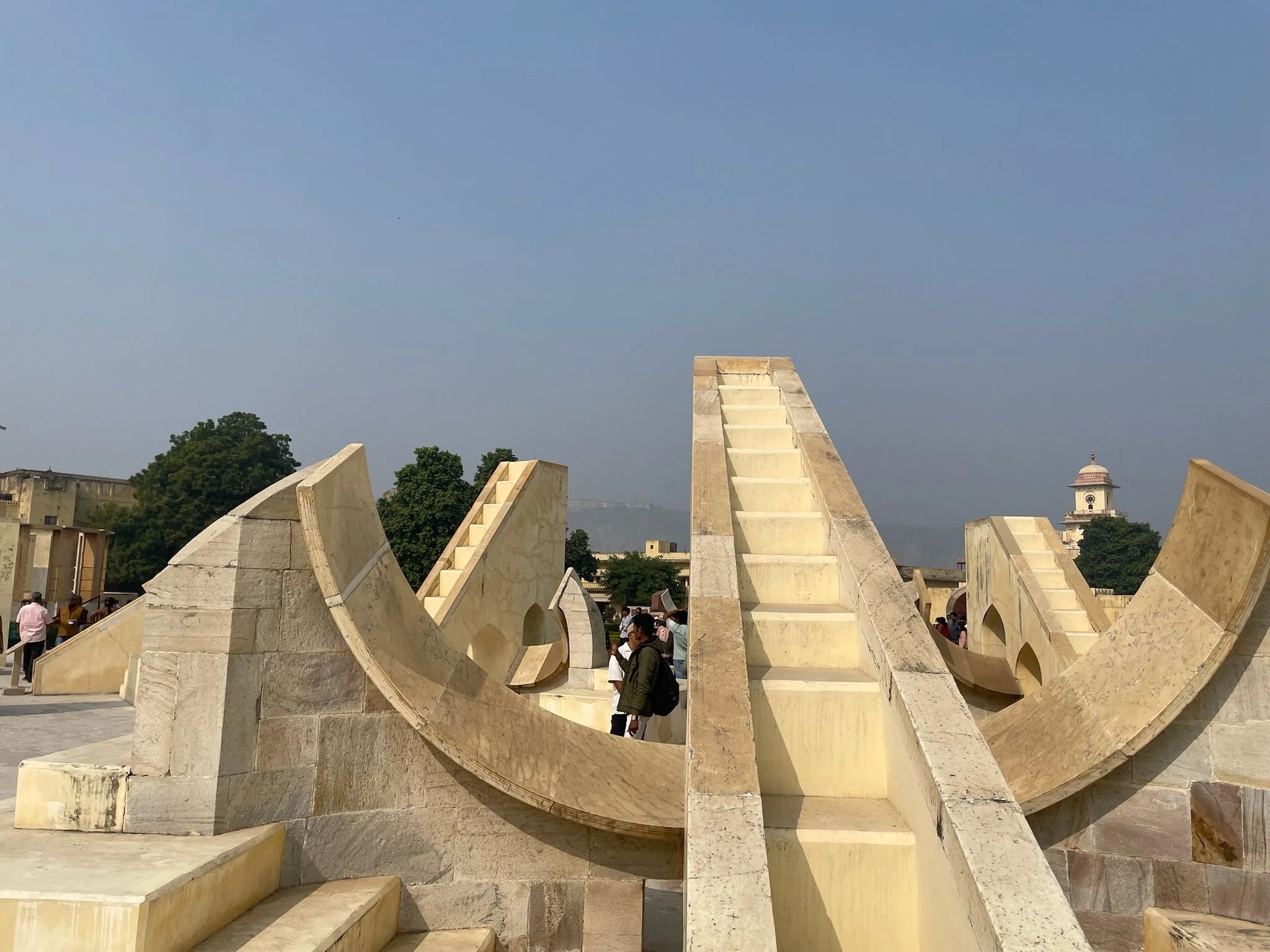 Het tweede monument dat we bezoeken is het observatorium Jantar Mantar, dat net naast het paleis ligt. Dit is het grootste stenen observatorium in de wereld, opgericht door Sawai Jai Singh die erg geïnteresseerd was in wetenschap en astronomie. Het staat vol met bizarre grote stenen meetinstrumenten, de meeste werken nog steeds. Er zijn zonnewijzers, halve bollen om de positie van de sterren te meten, instrumenten om de kortste en langste dag van het jaar te berekenen, of de posities van de planeten, … Kortom een speeltuin voor astronomen. Het lijkt wat op een setting van een science fiction boek.